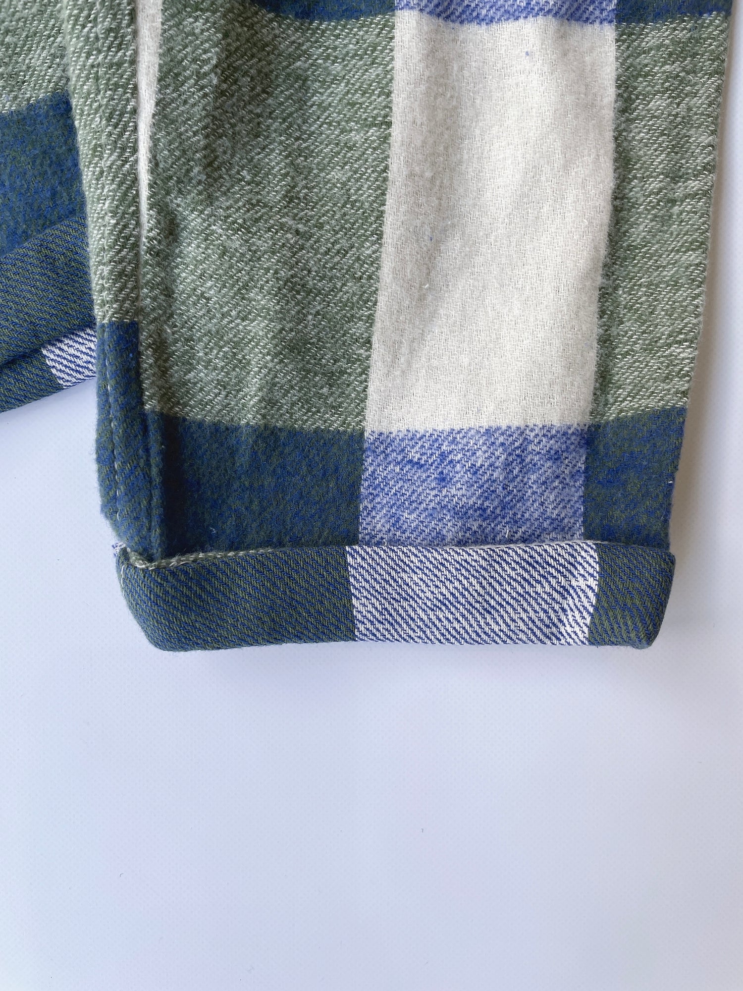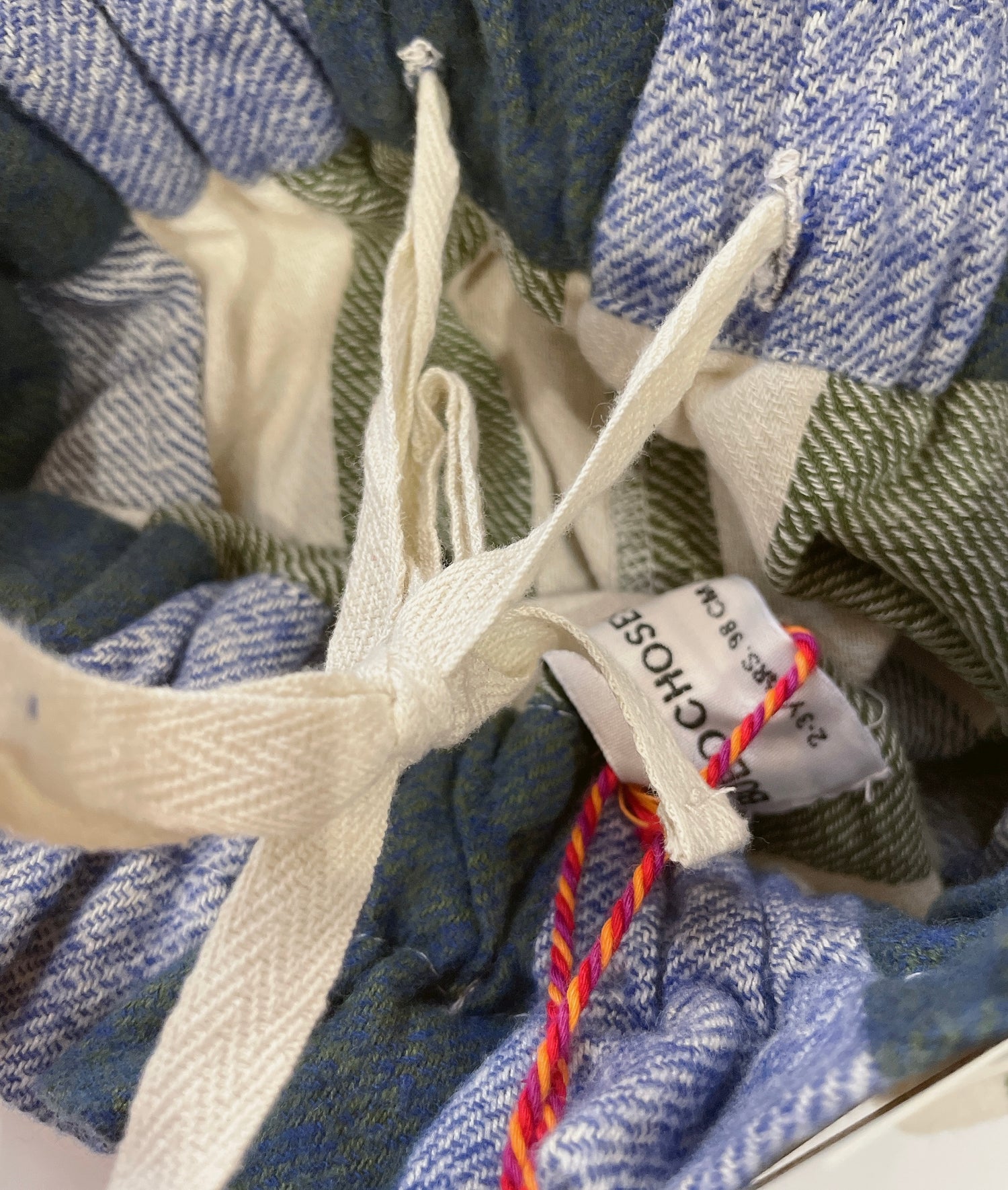 コットンフランネルのチェックパンツ。単調になりがちなコーデにアクセントをくれるチェックは持っているとかなり使える。ウエストは調整可能な紐が内側に付いています。表からは紐が見えないので印象はスタイリッシュなまま◎
