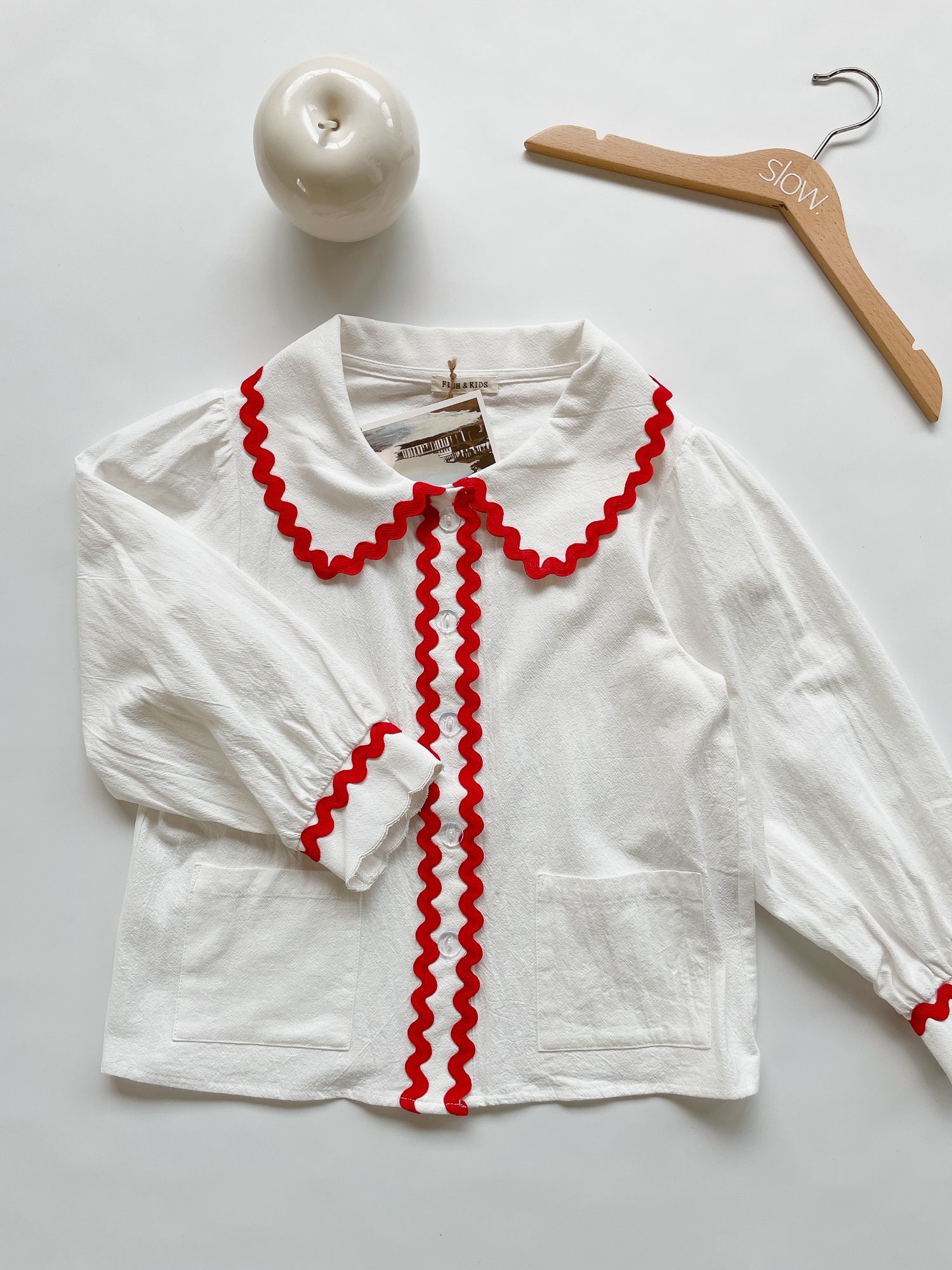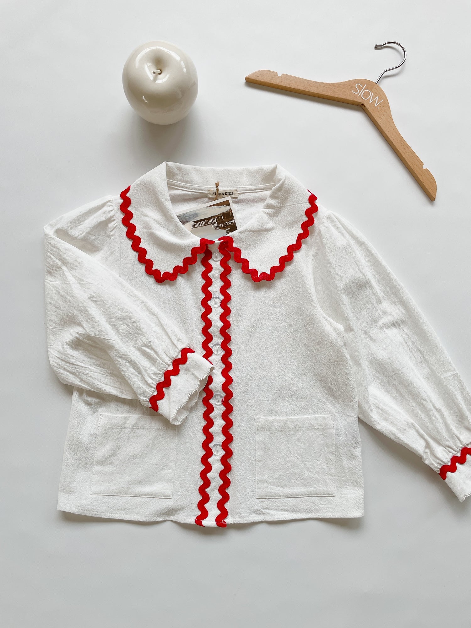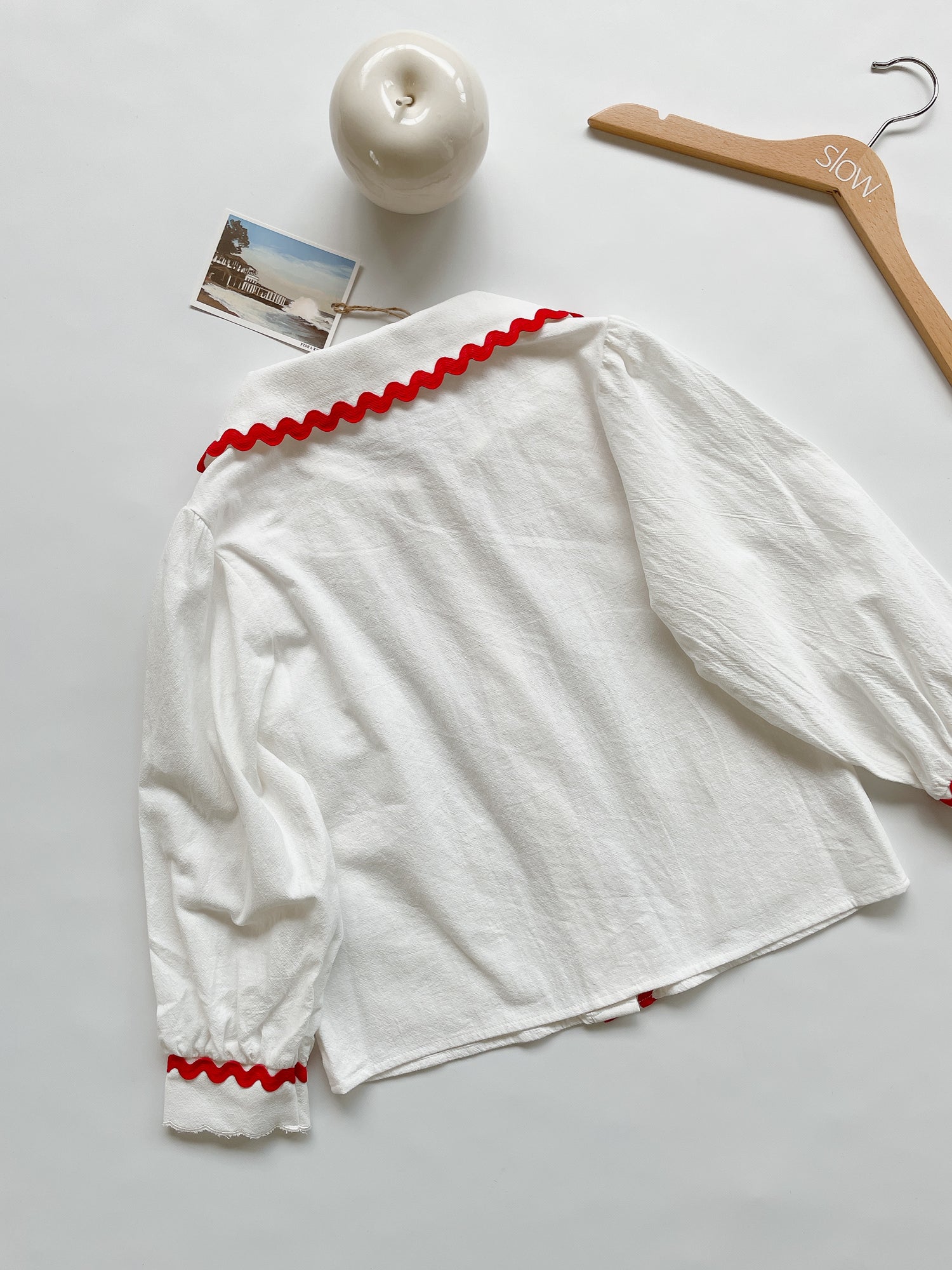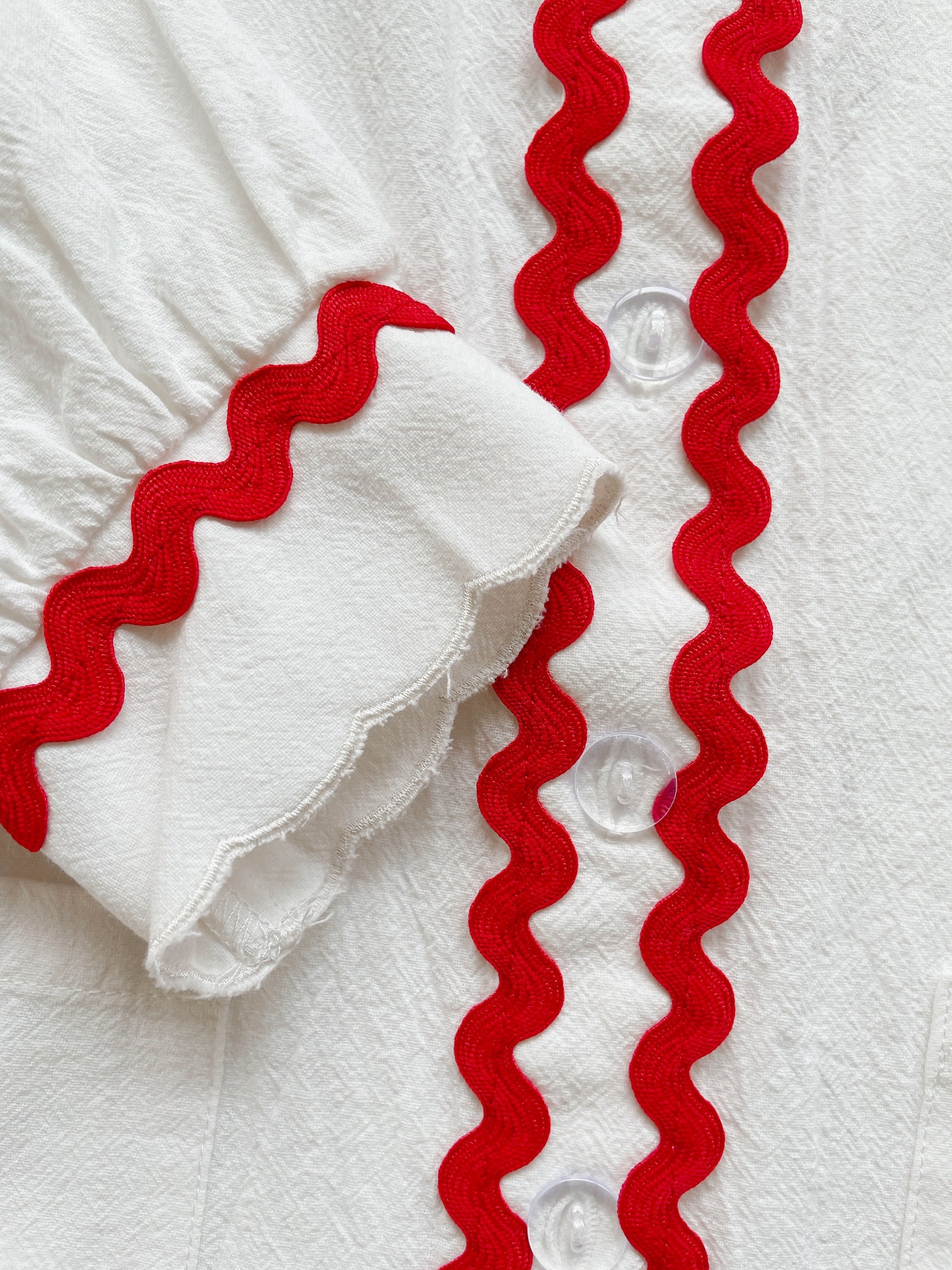 レッドのリックラックがノスタルジックなブラウス。コットン生地でドライな質感が懐かしい雰囲気。袖口はスカラップになっています。