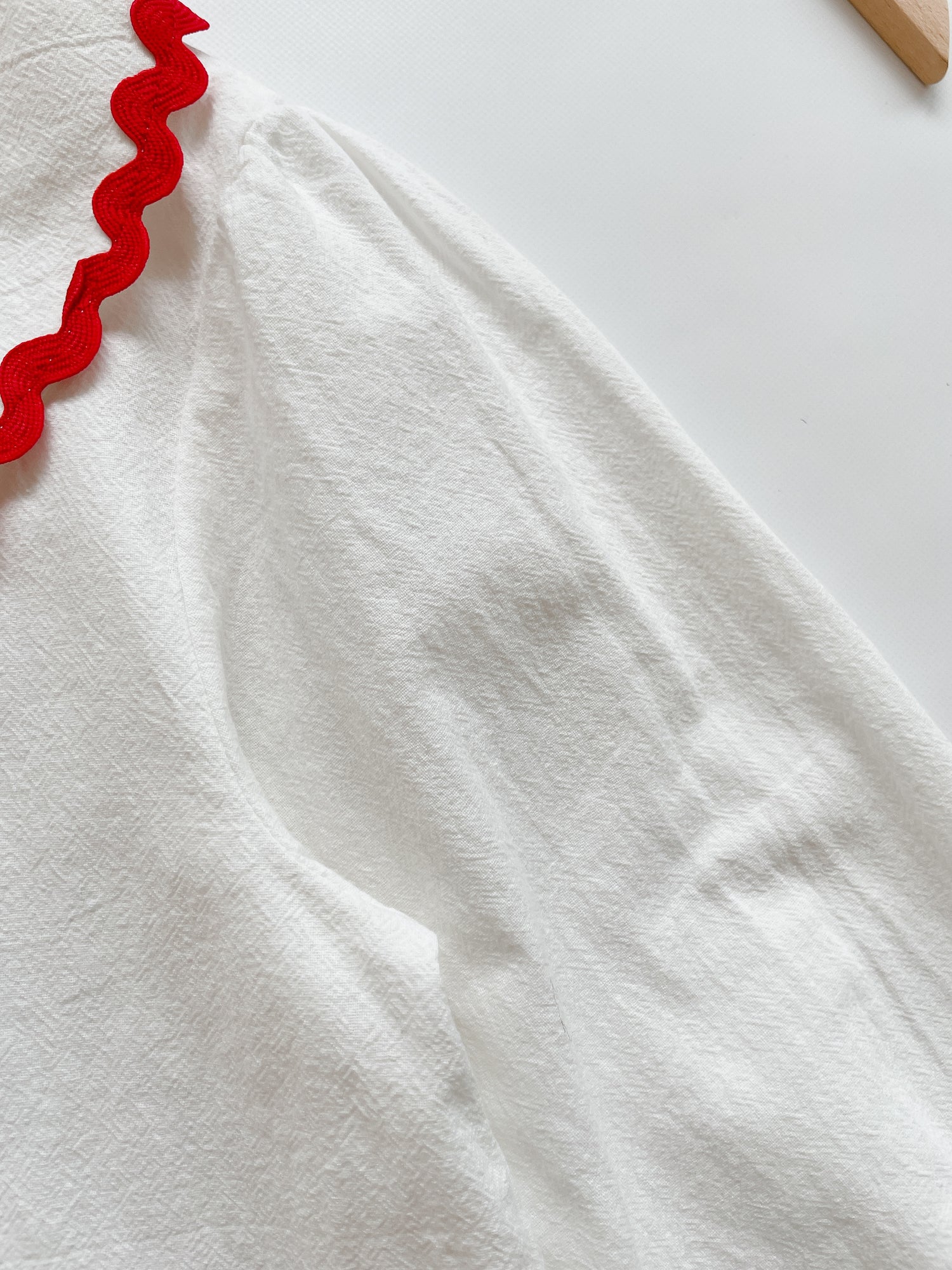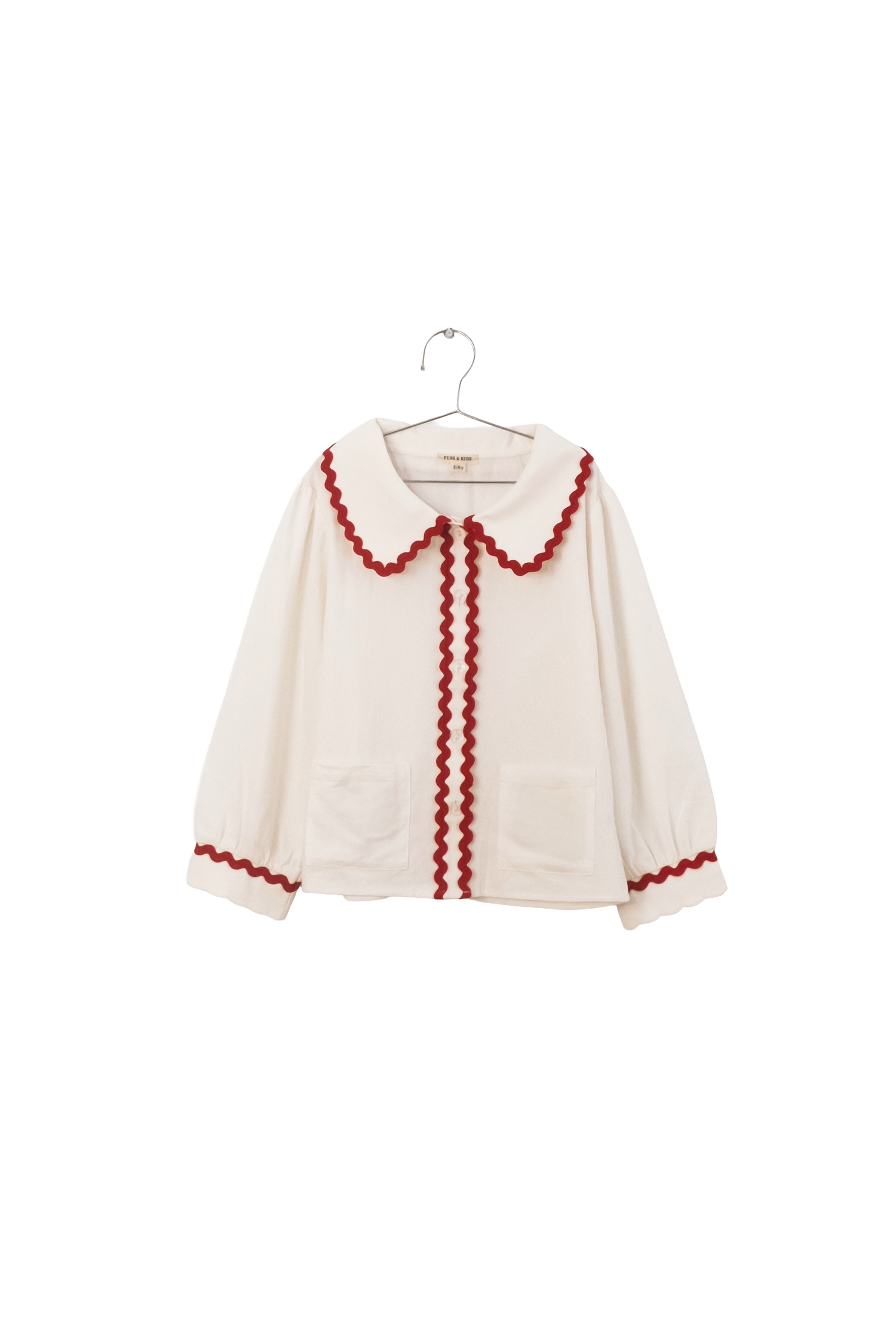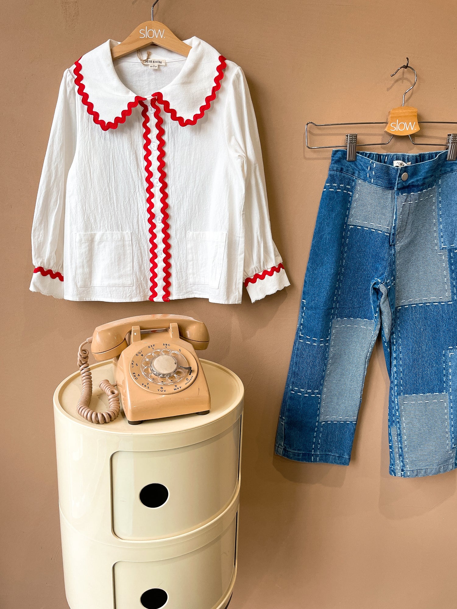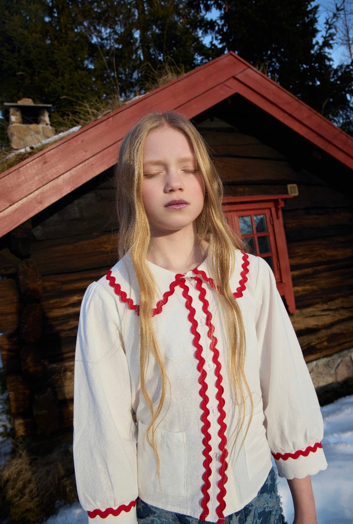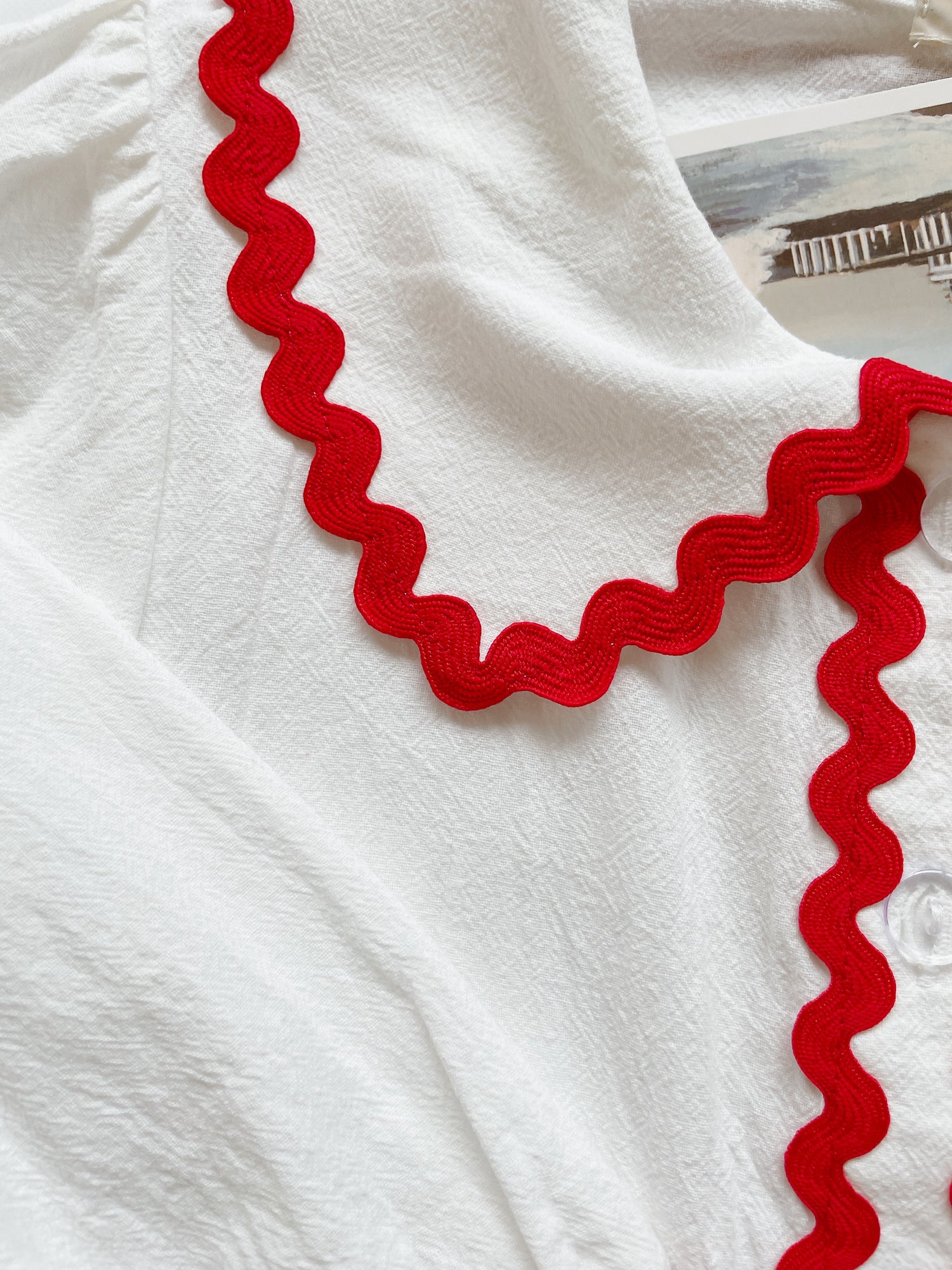 レッドのリックラックがノスタルジックなブラウス。コットン生地でドライな質感が懐かしい雰囲気。袖口はスカラップになっています。