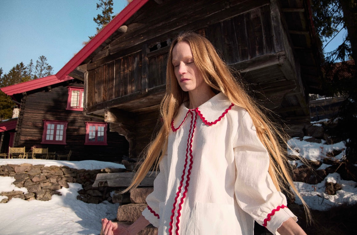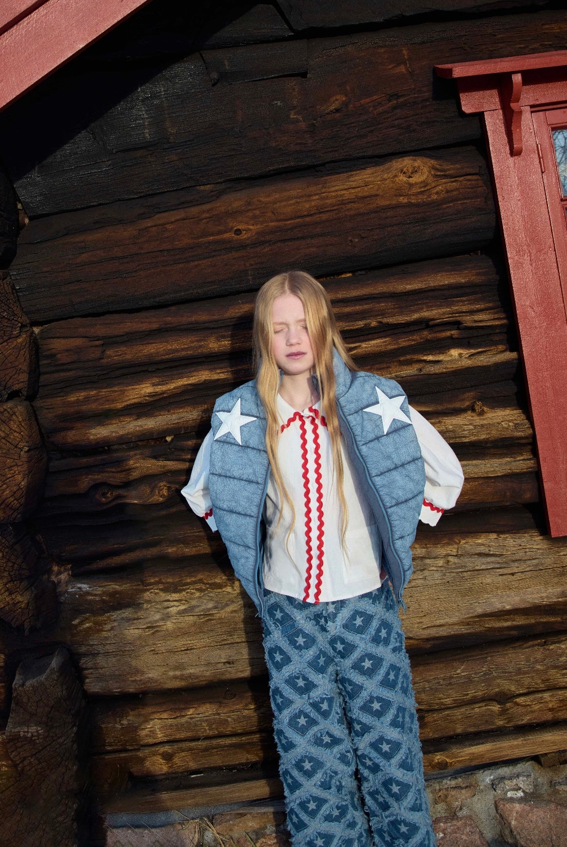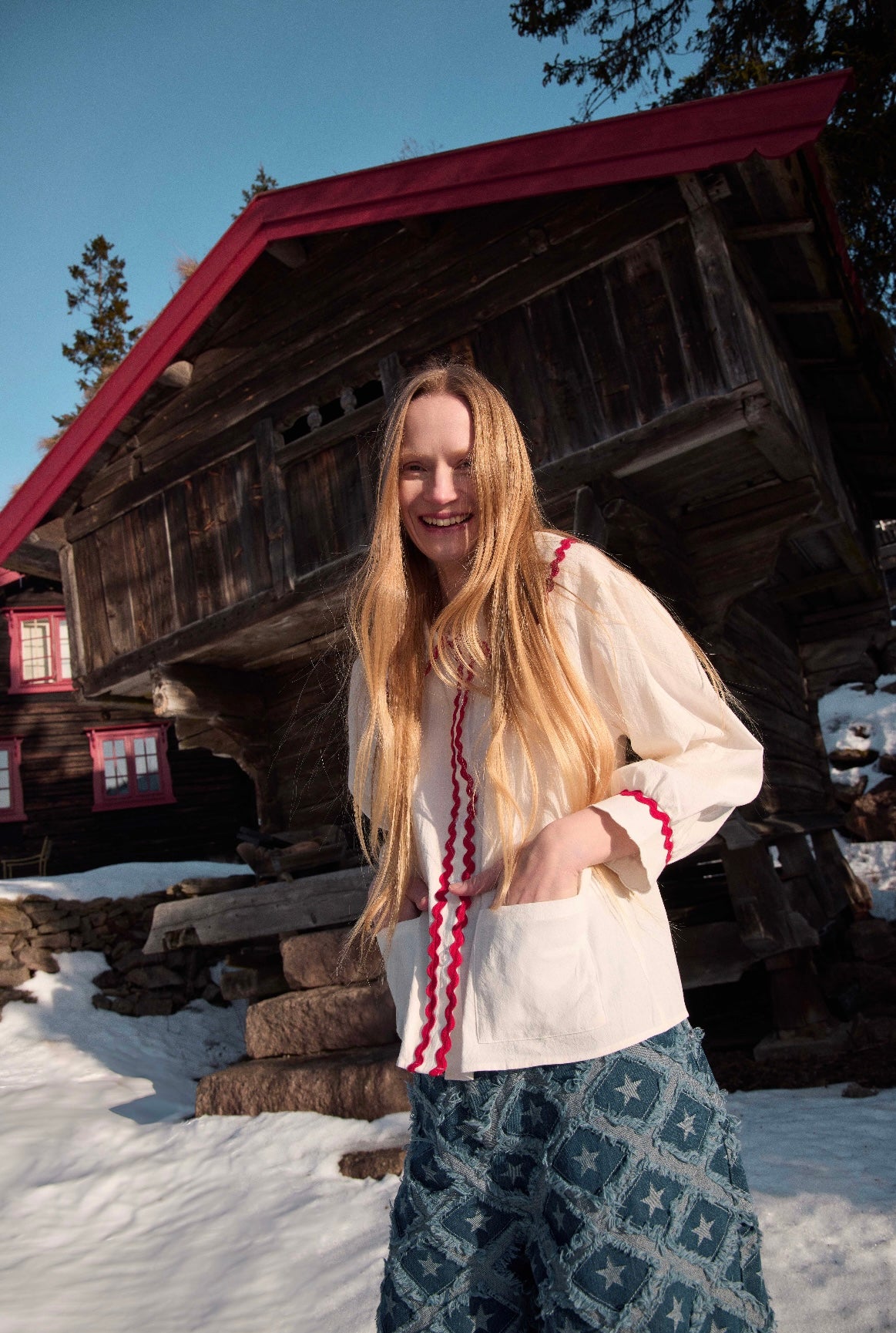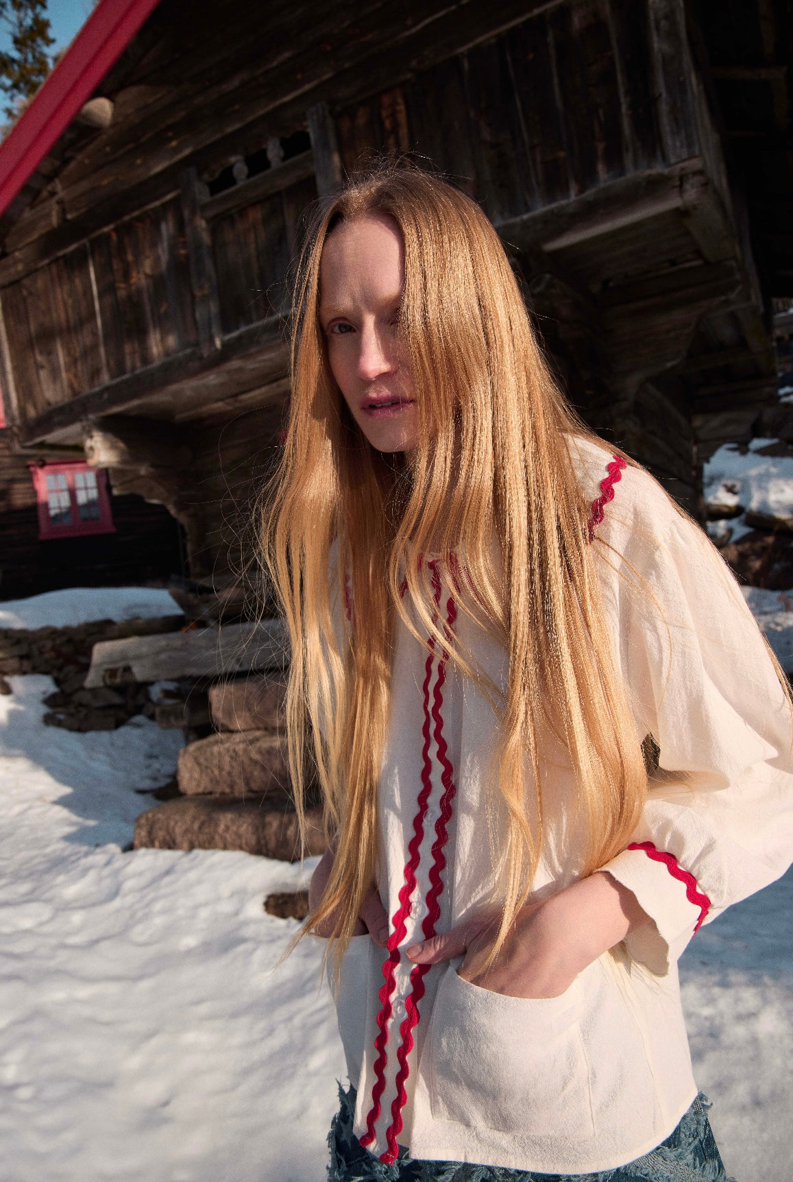 レッドのリックラックがノスタルジックなブラウス。コットン生地でドライな質感が懐かしい雰囲気。袖口はスカラップになっています。
