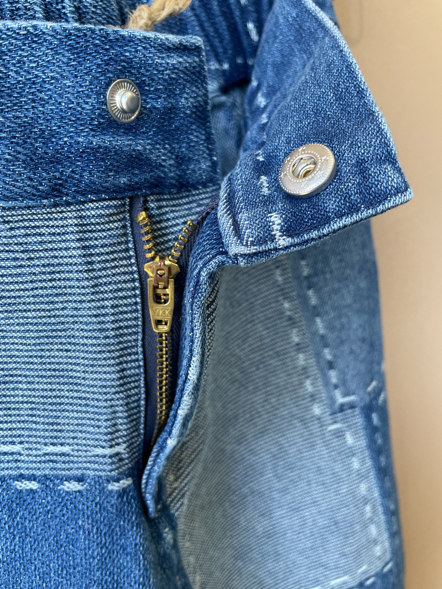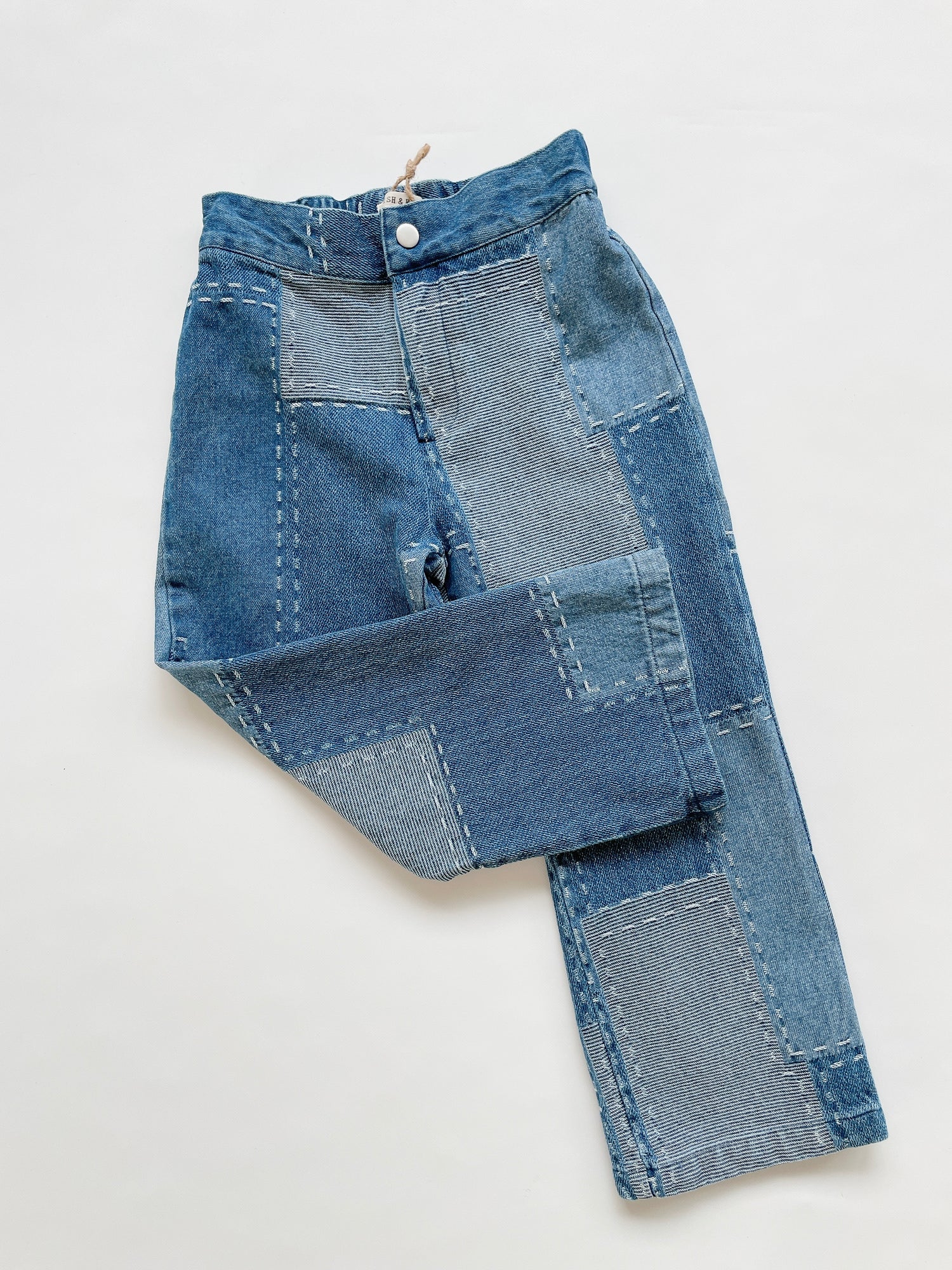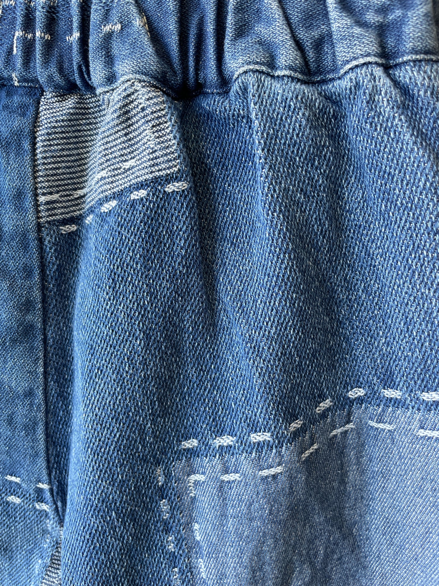コットン100のパッチワークジーンズ。後ろ側がゴムになっています。柄の出方は個々に異なります。