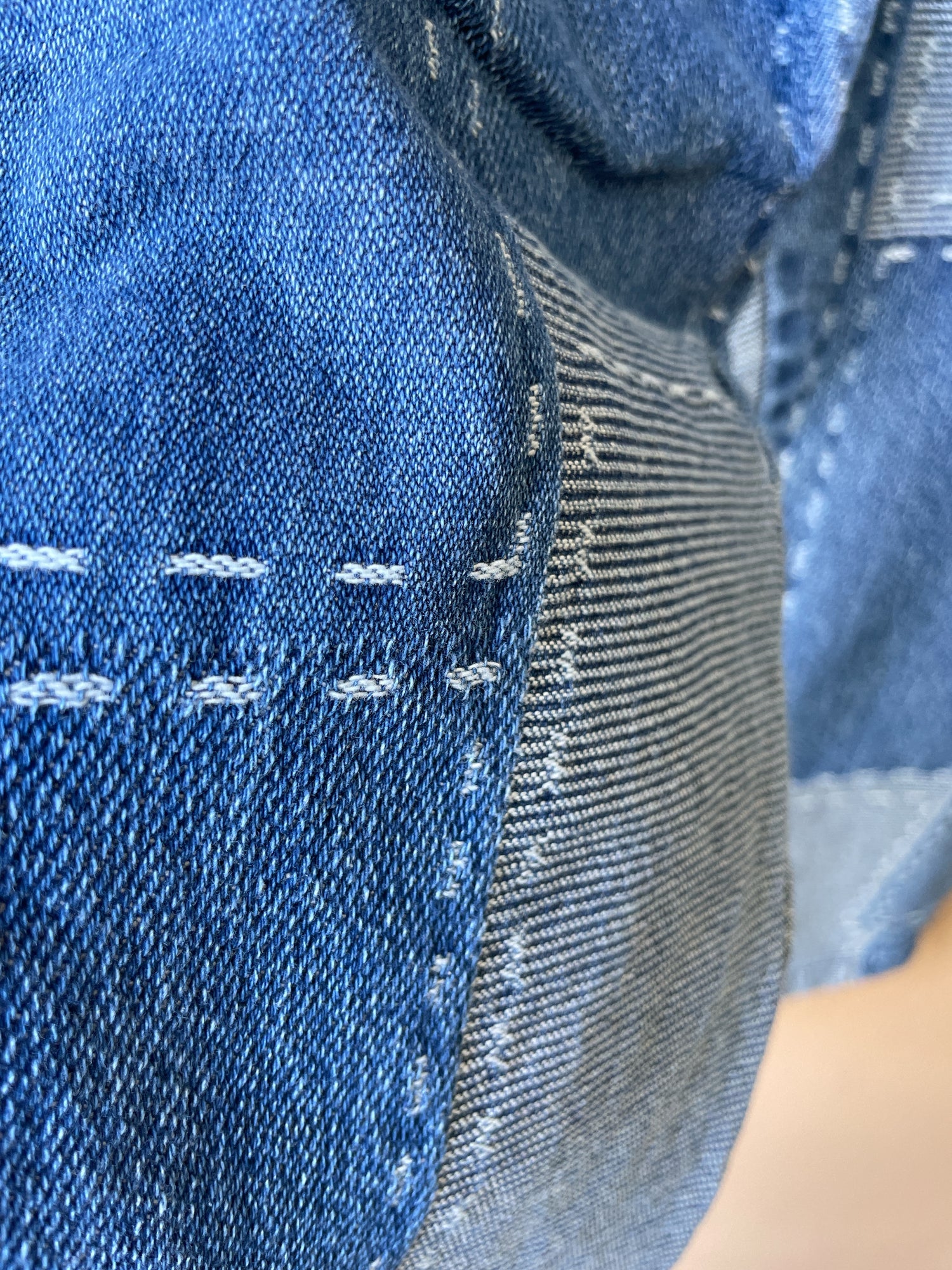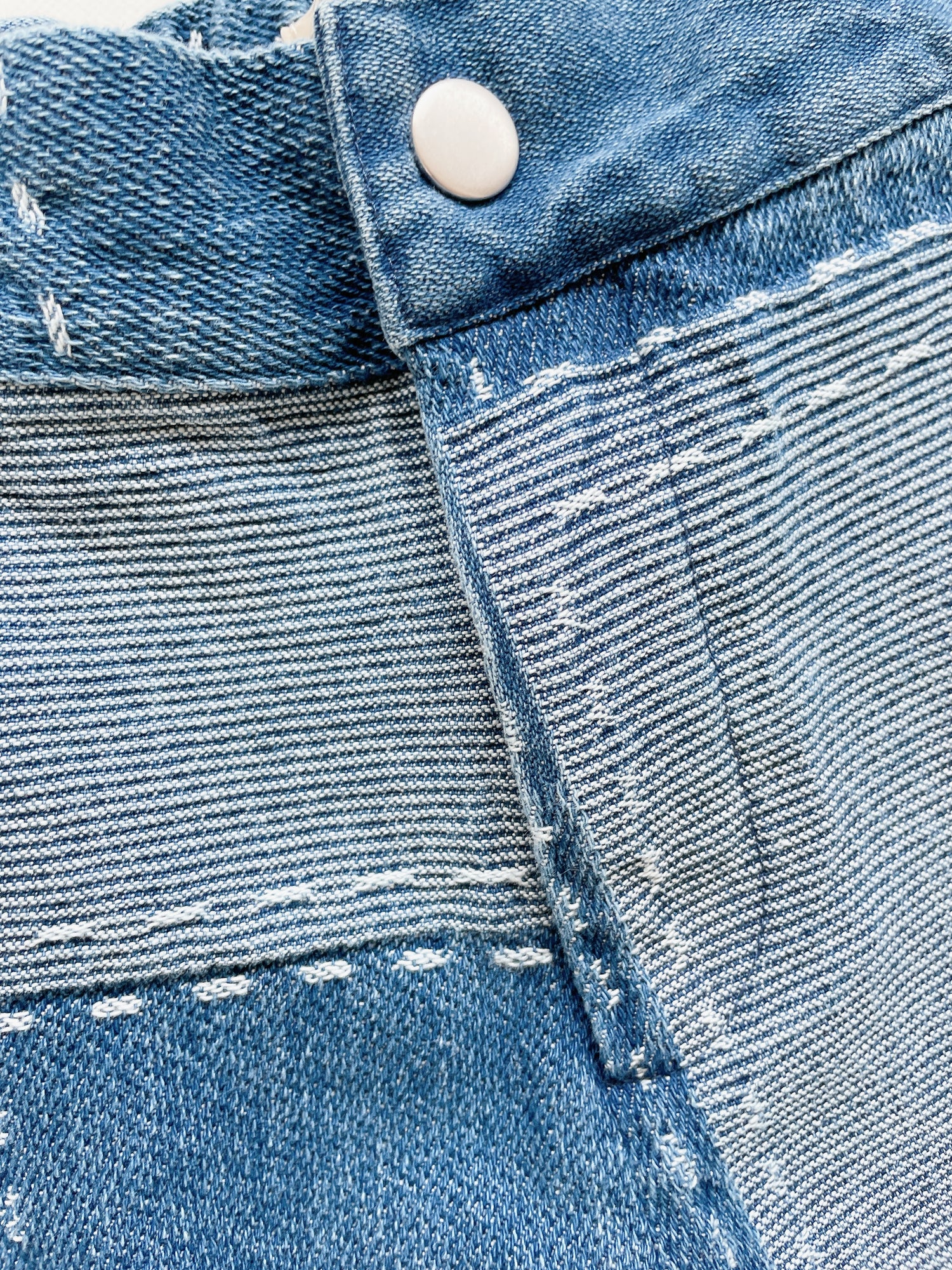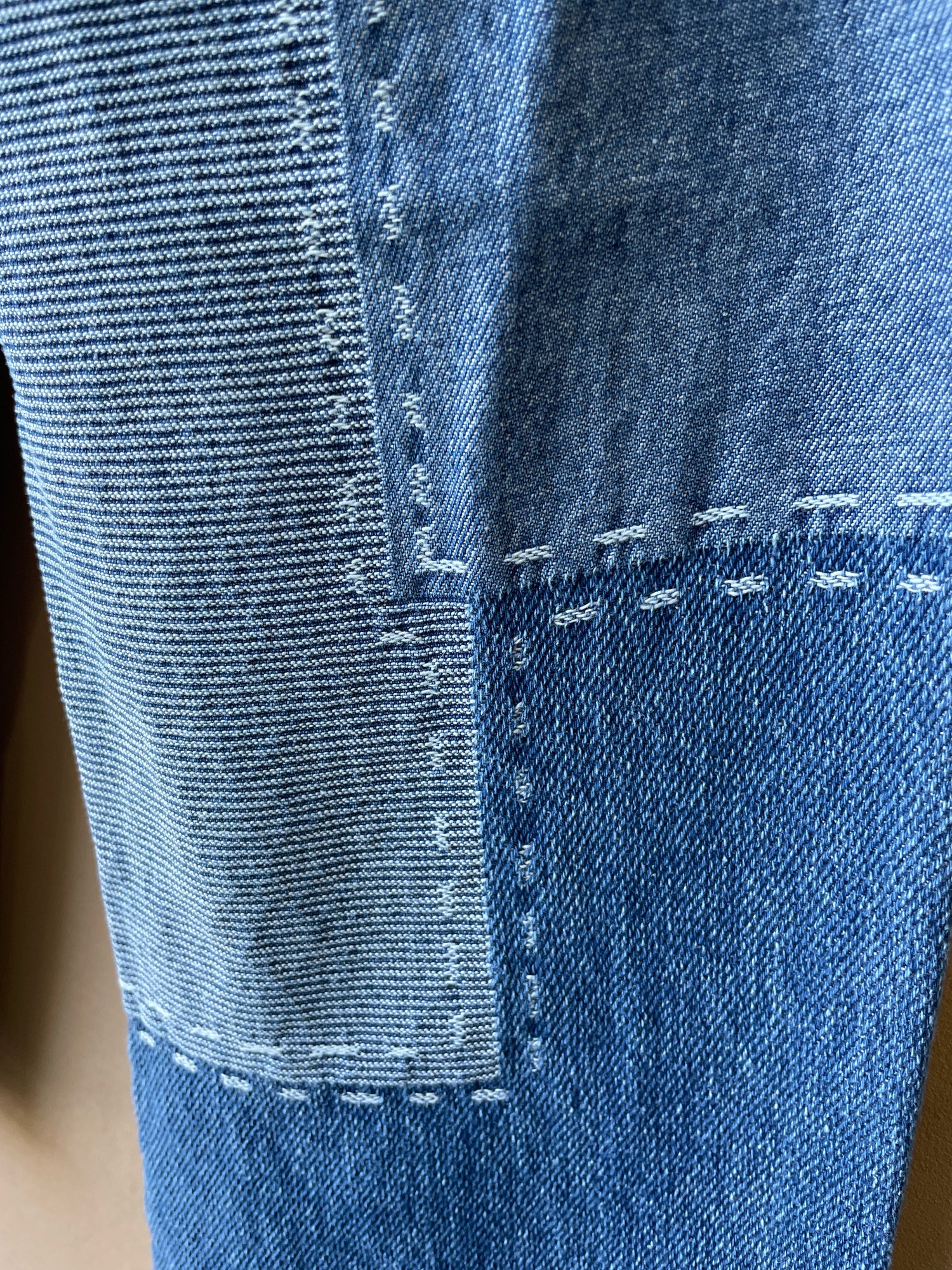コットン100のパッチワークジーンズ。後ろ側がゴムになっています。柄の出方は個々に異なります。