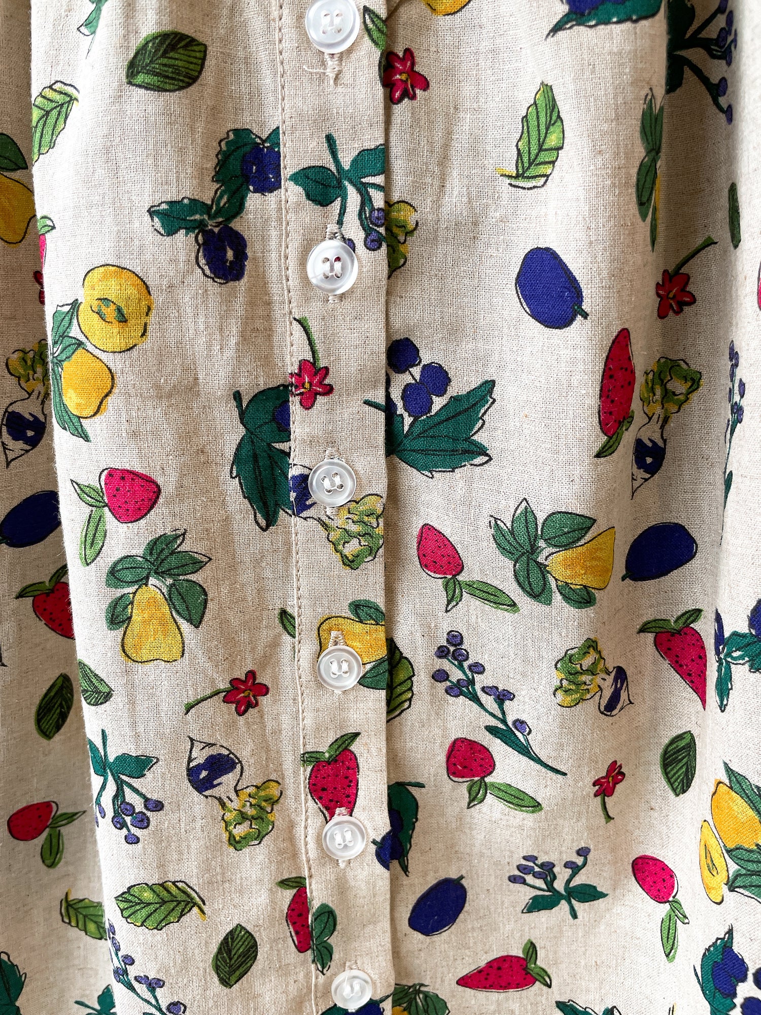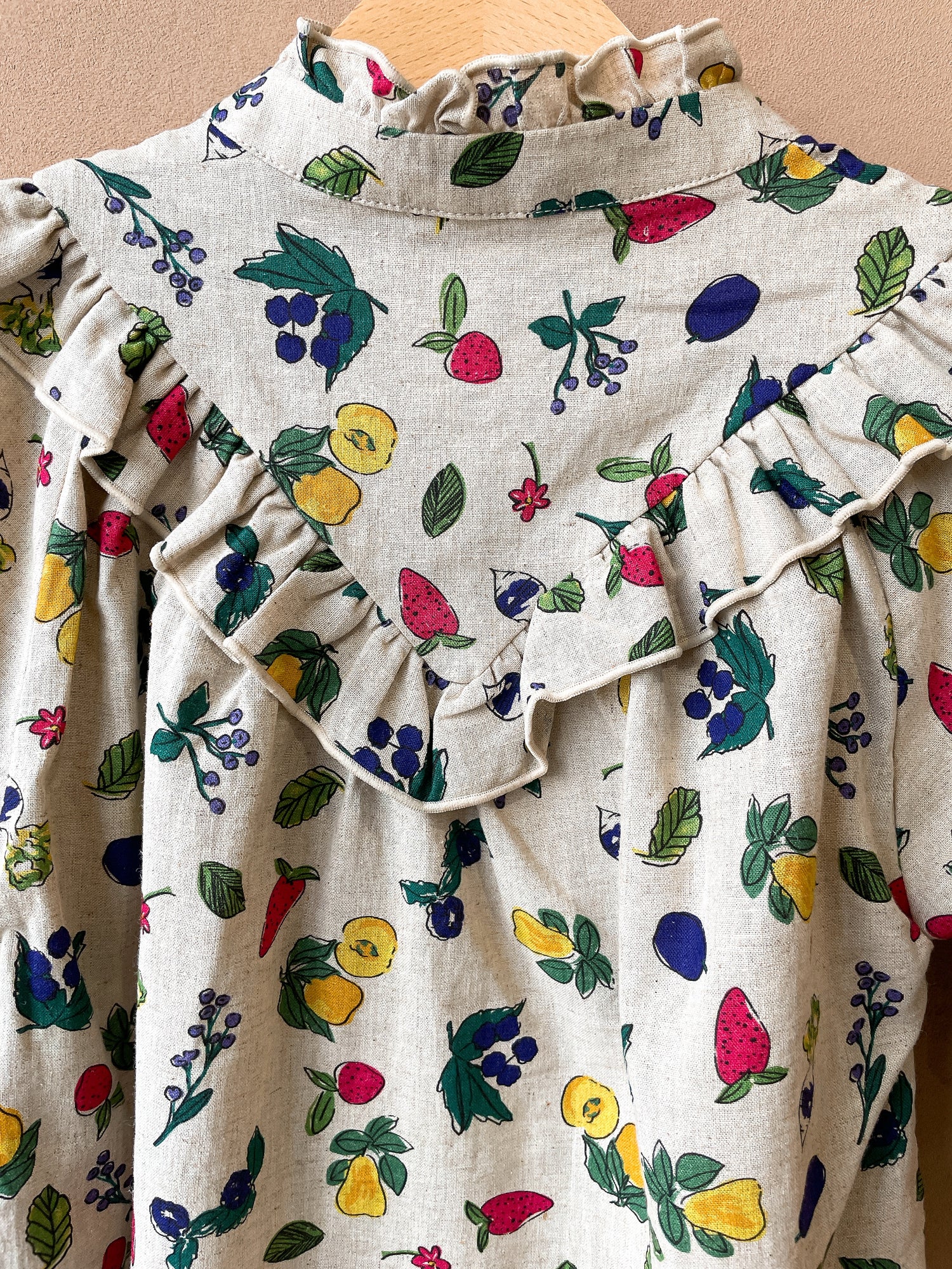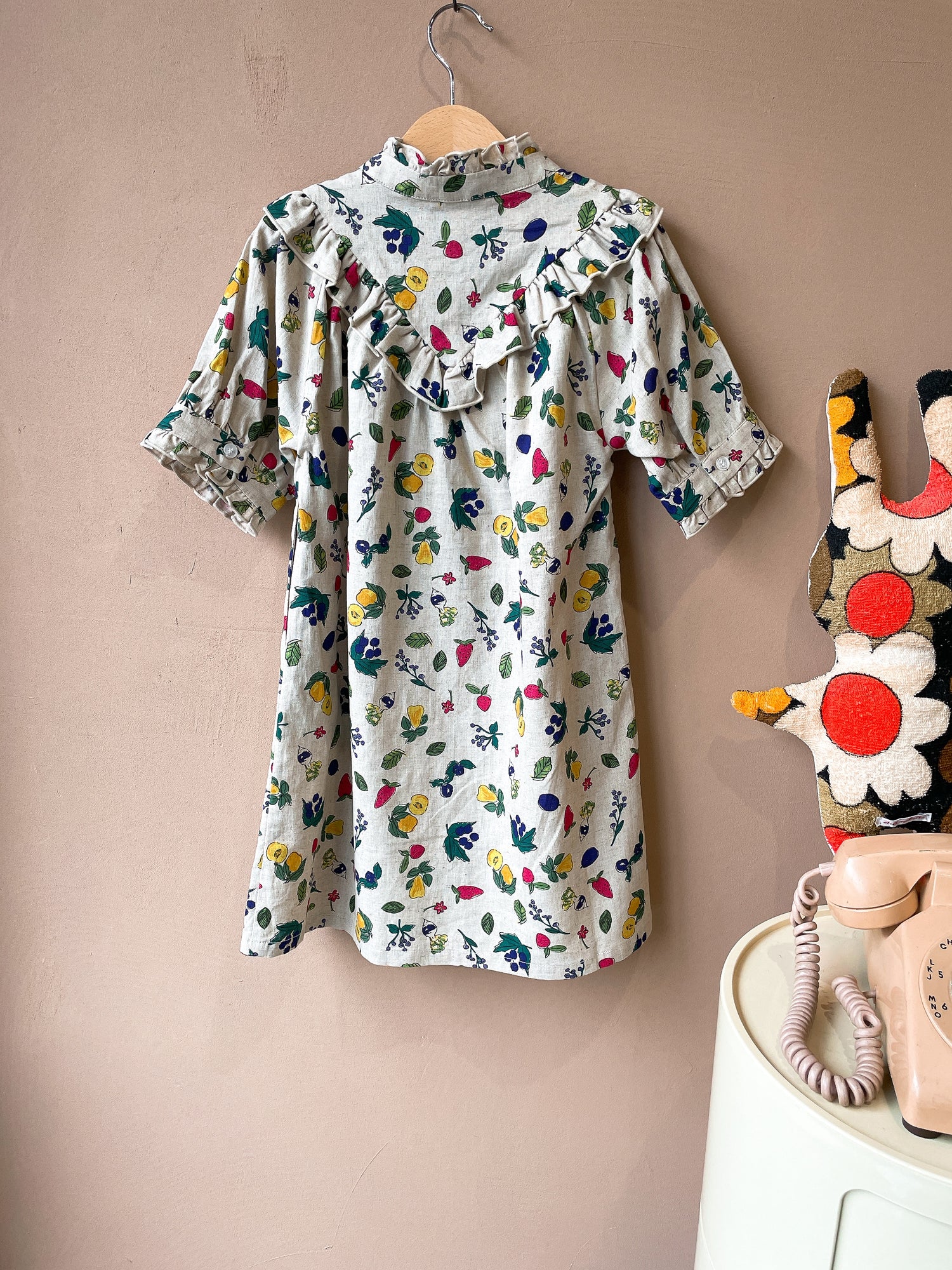 LINENのドライな素材感がプラスされた素材感も楽しいドレス。今季の柄、野菜とフルーツがいっぱいのポケット付きワンピース。お揃いのブラウスとパンツもあります。