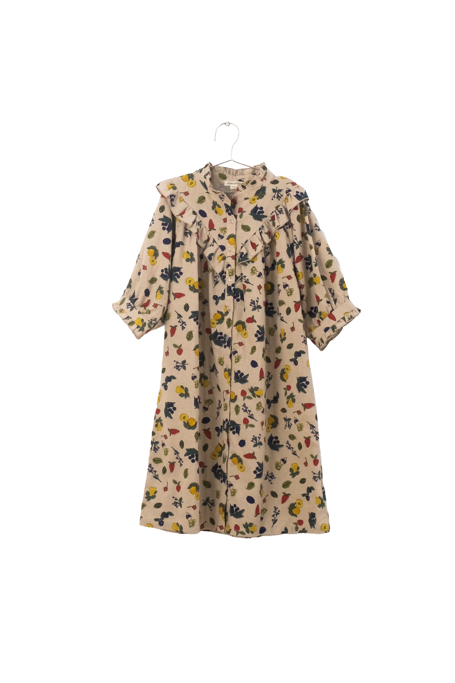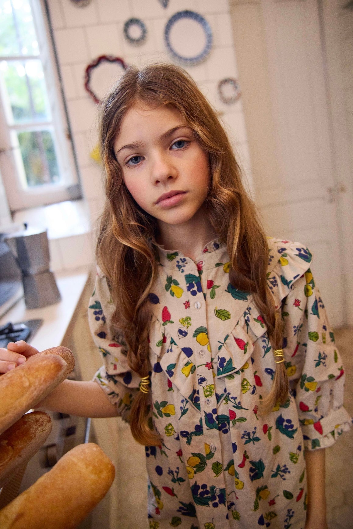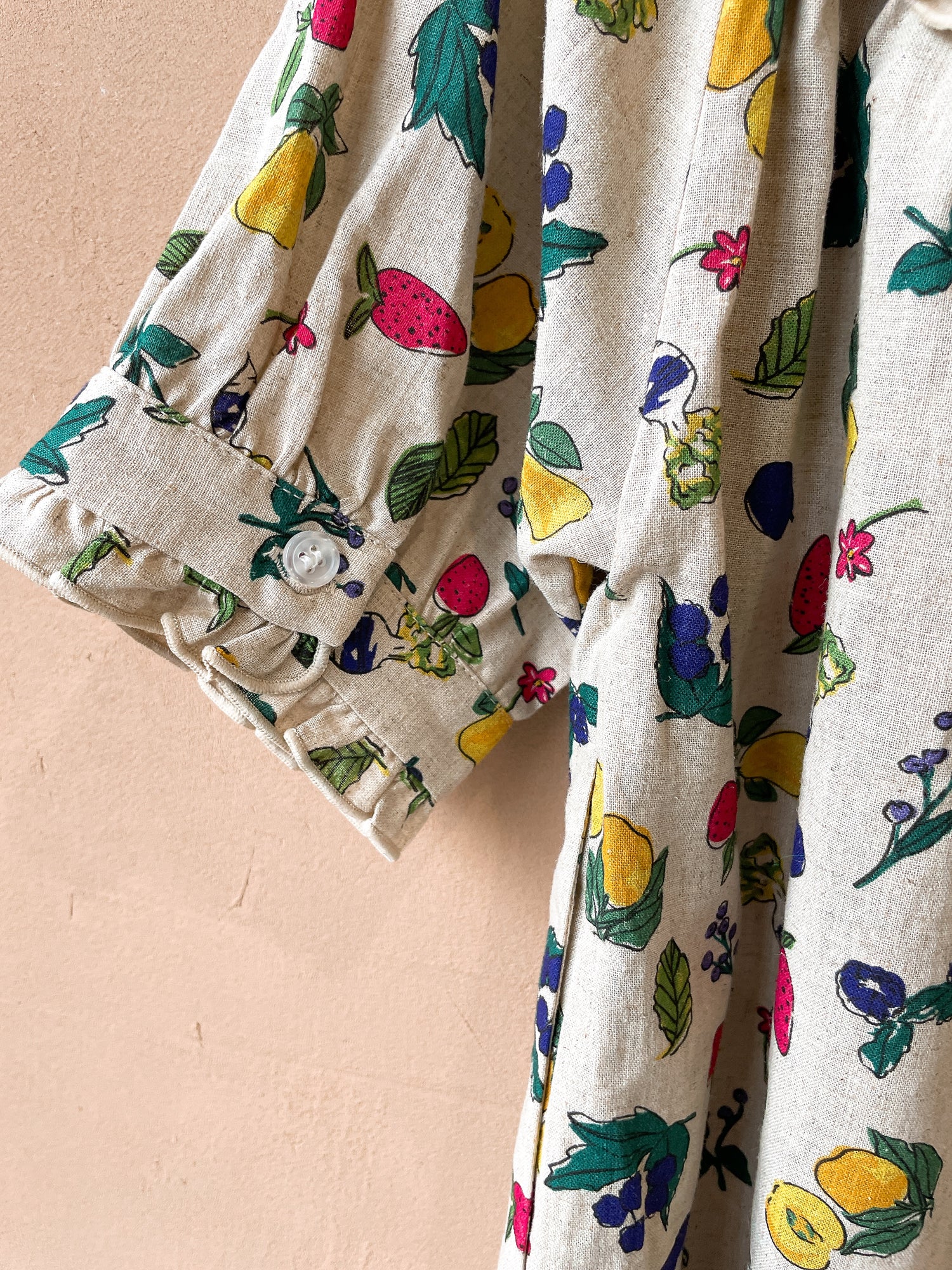 LINENのドライな素材感がプラスされた素材感も楽しいドレス。今季の柄、野菜とフルーツがいっぱいのポケット付きワンピース。お揃いのブラウスとパンツもあります。