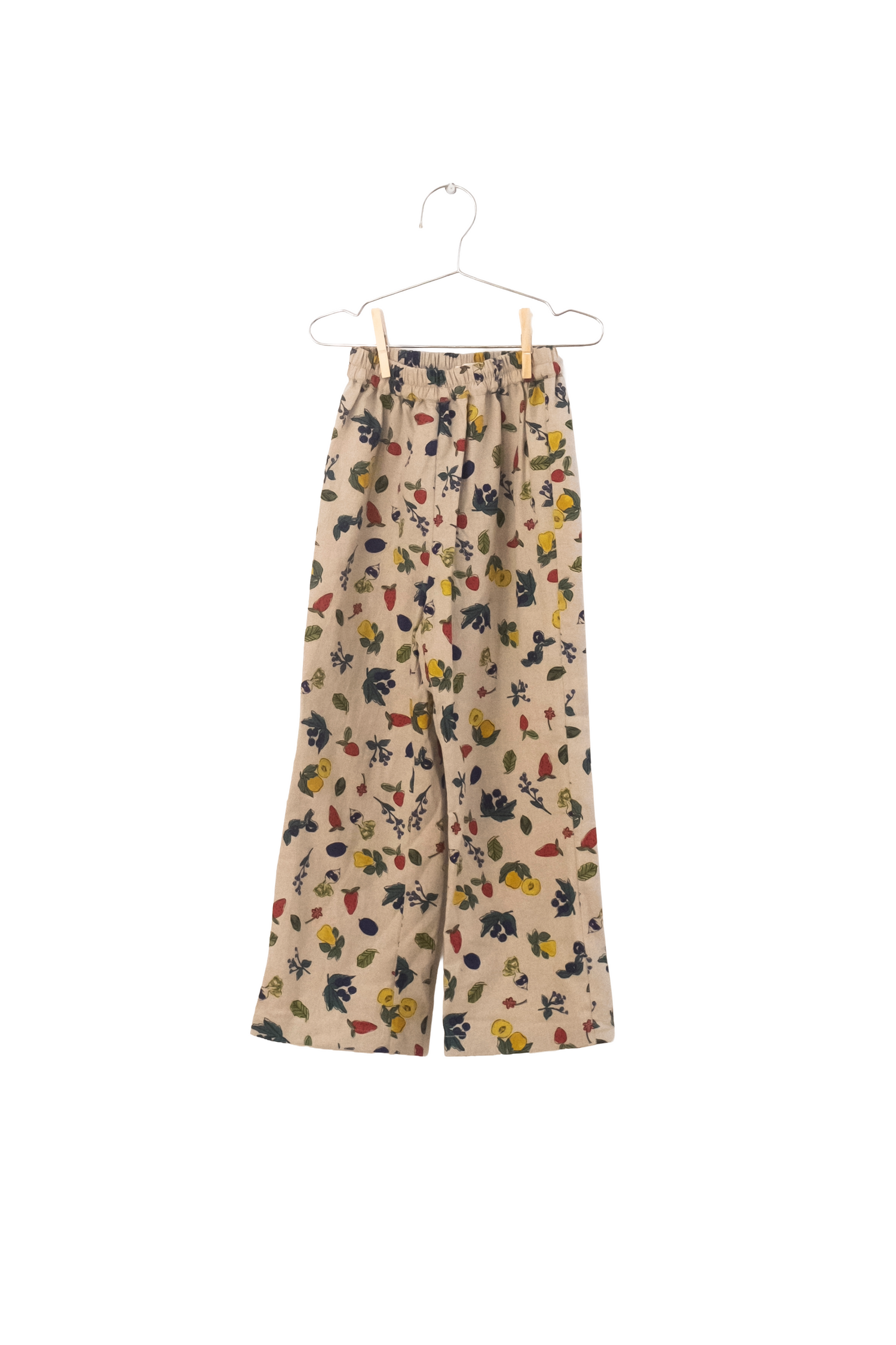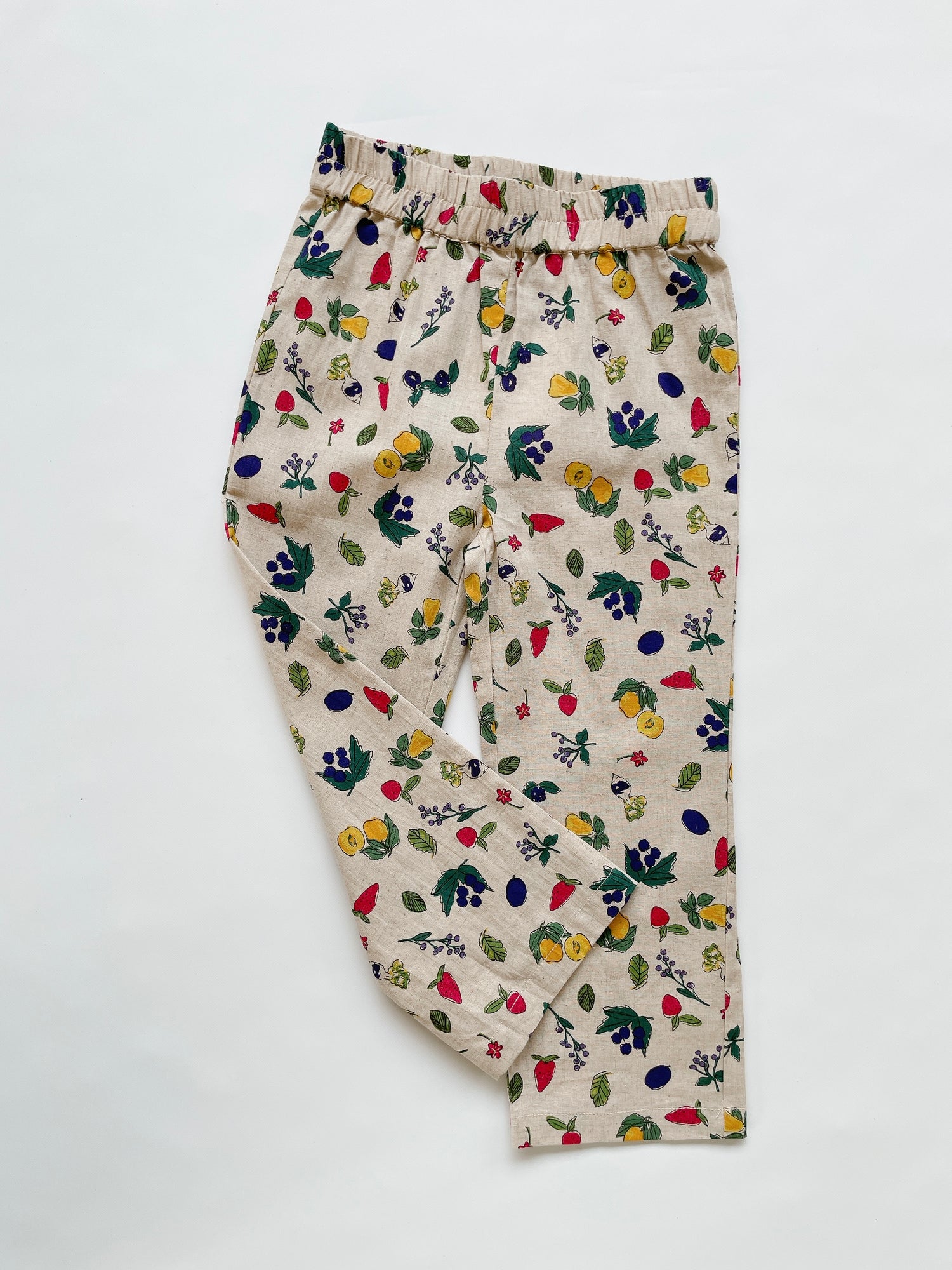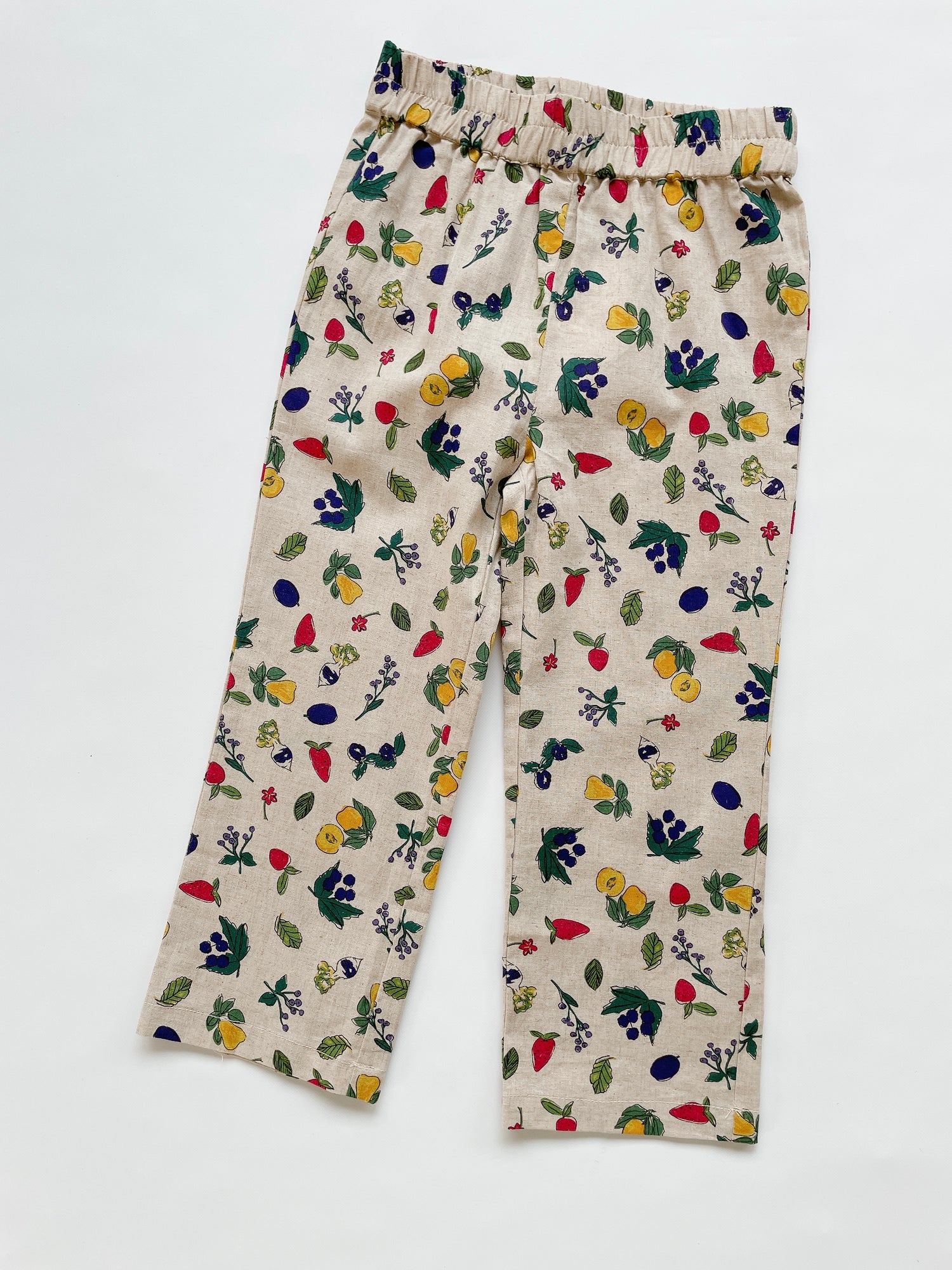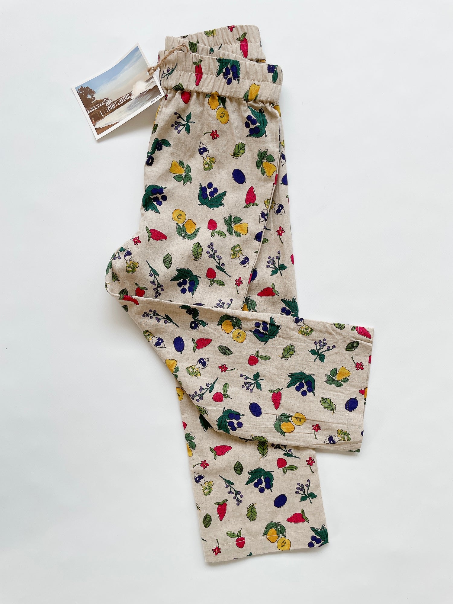 今季の新柄FARMシリーズのパンツ。リネンのドライタッチな肌ざわりで夏からも活躍します。ウエストの太目の平ゴムは真ん中が縫われているのでよれにくく履き易さも考えられています。お揃いのブラウスとワンピースもあります。