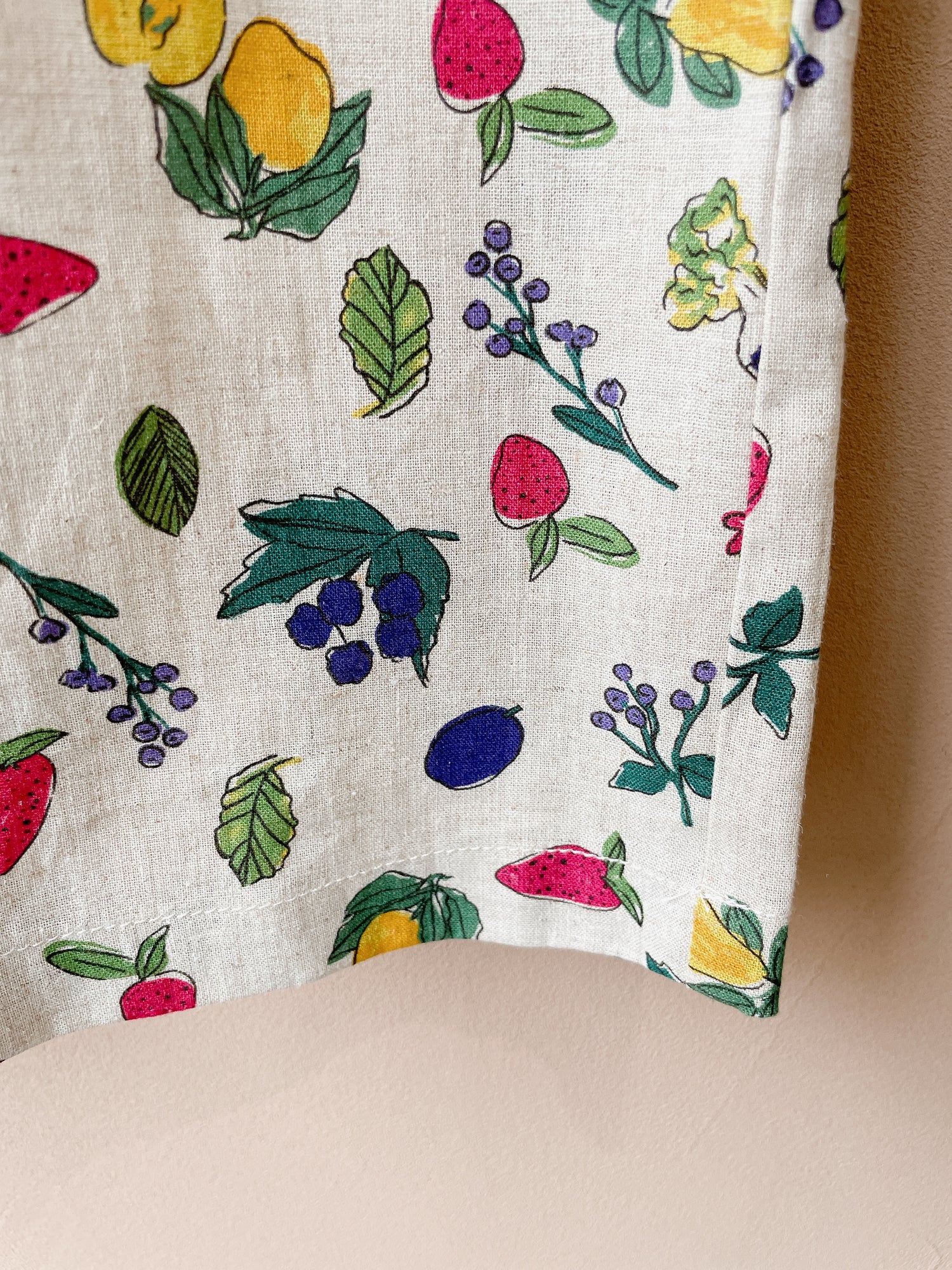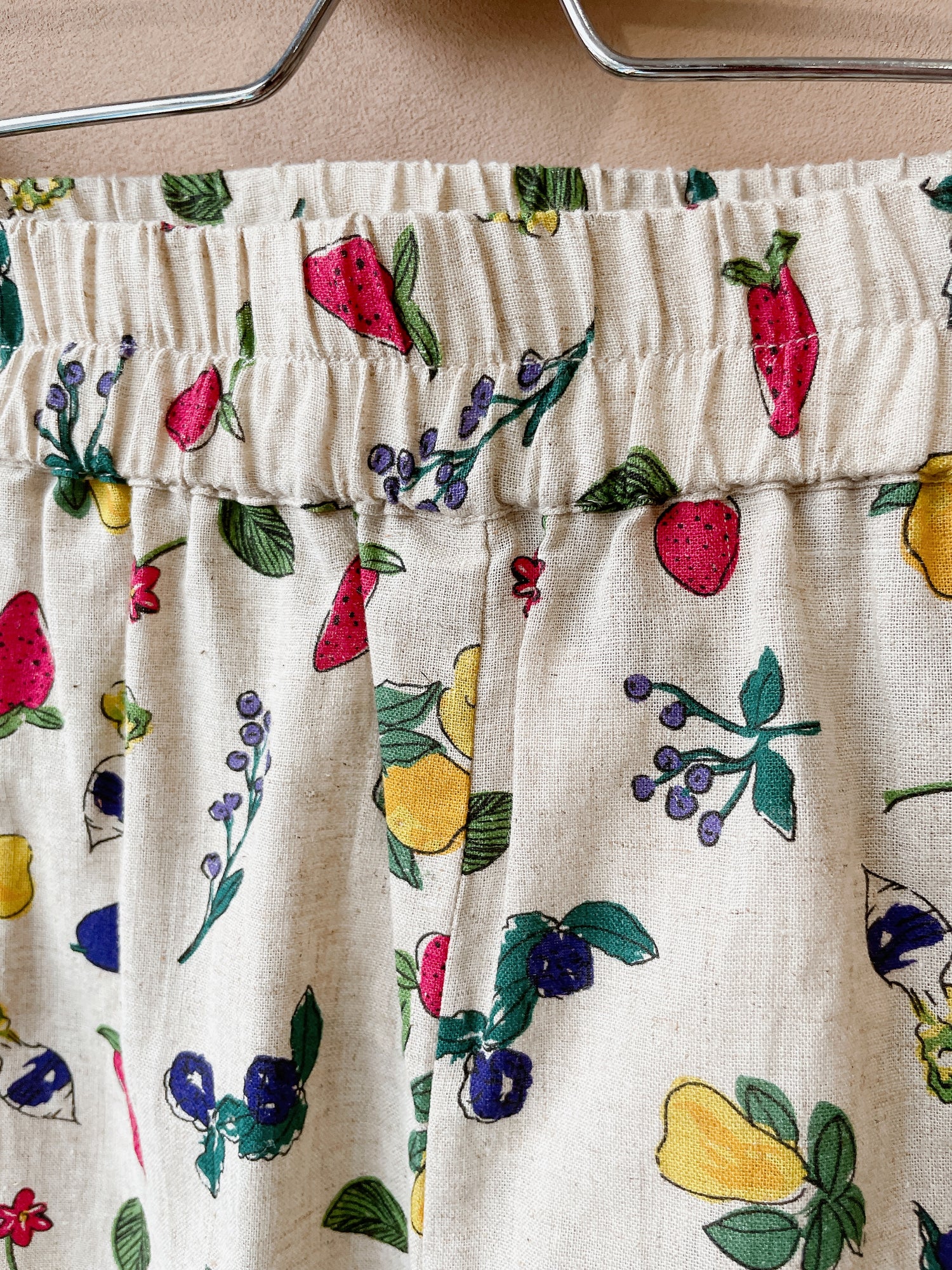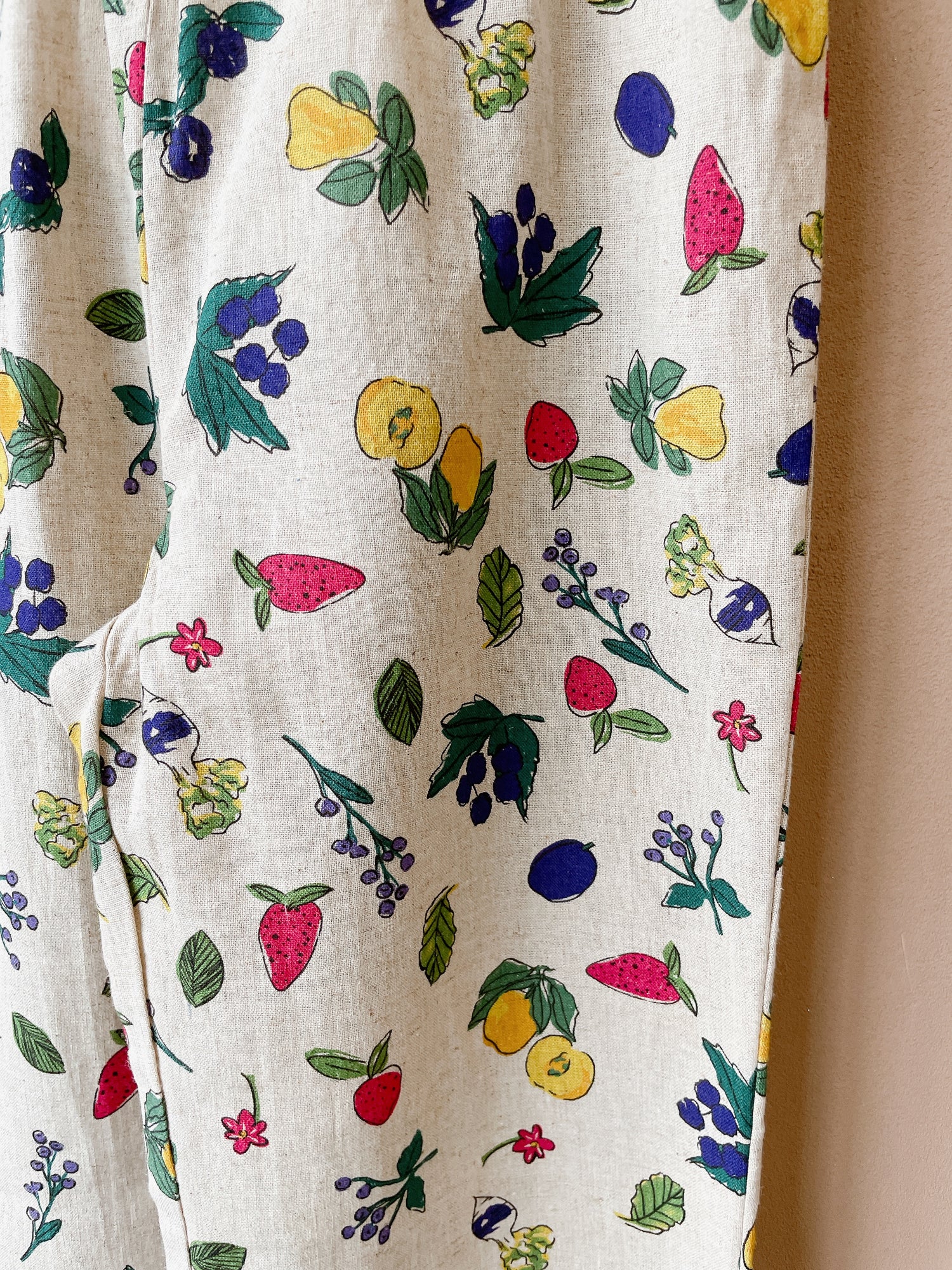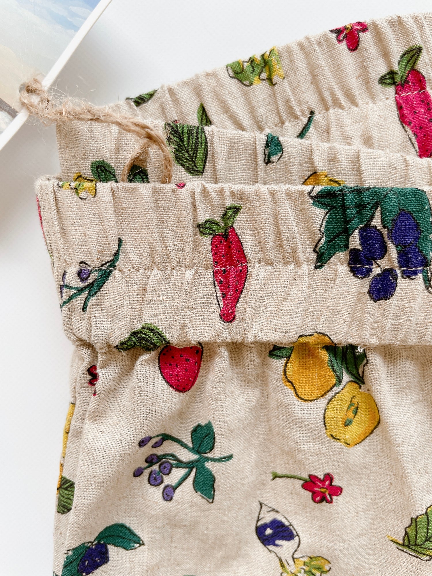 今季の新柄FARMシリーズのパンツ。リネンのドライタッチな肌ざわりで夏からも活躍します。ウエストの太目の平ゴムは真ん中が縫われているのでよれにくく履き易さも考えられています。お揃いのブラウスとワンピースもあります。