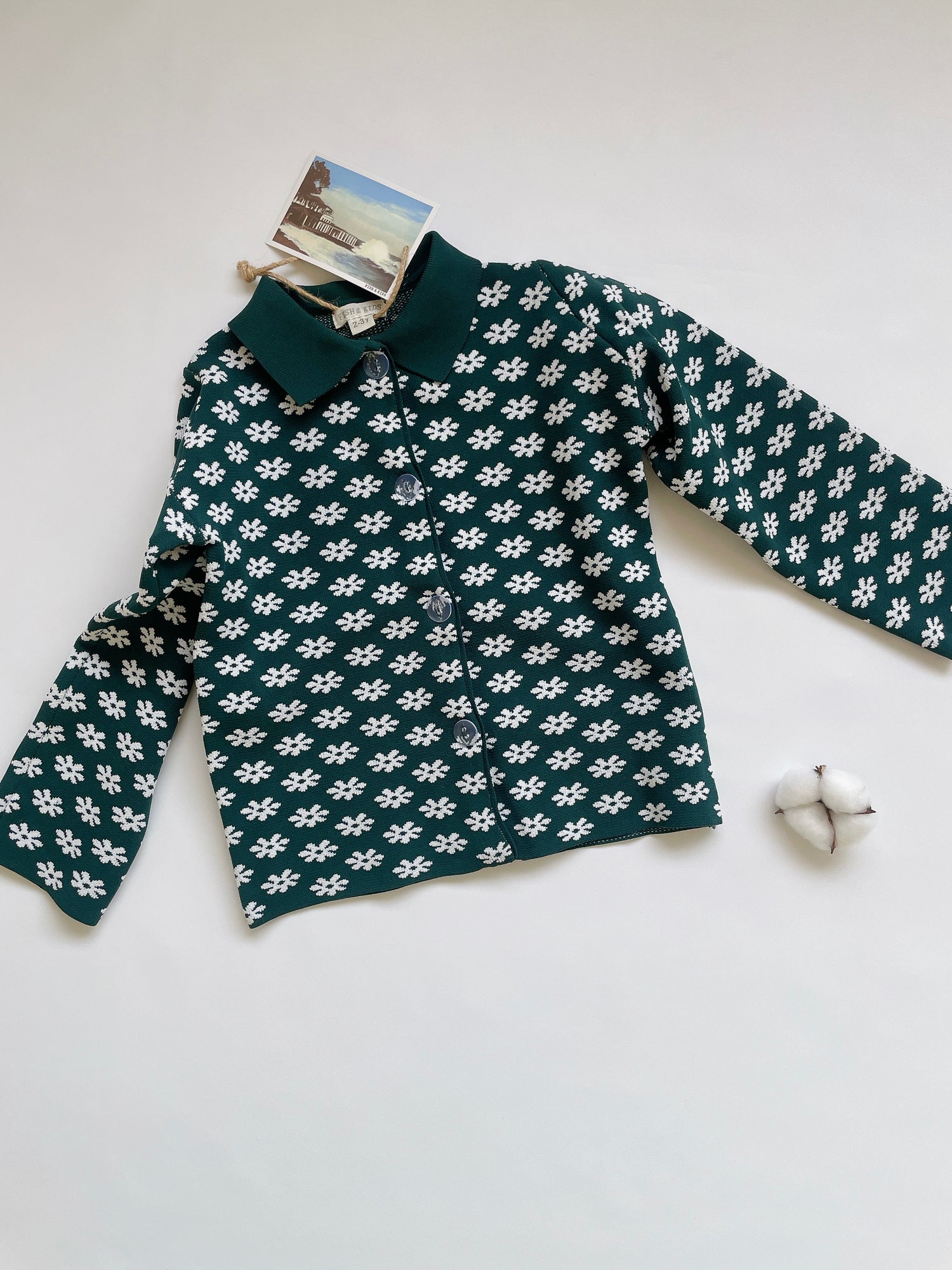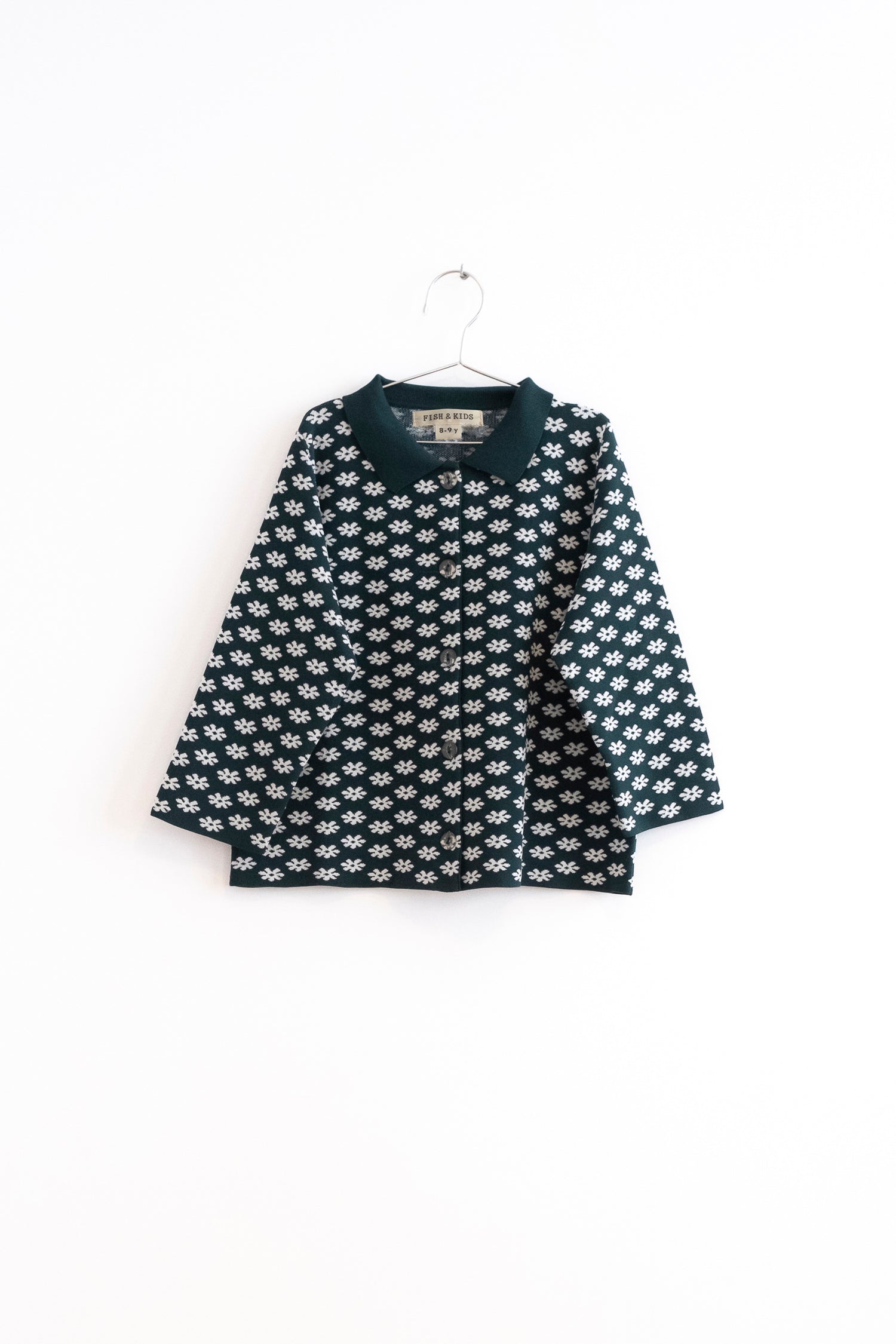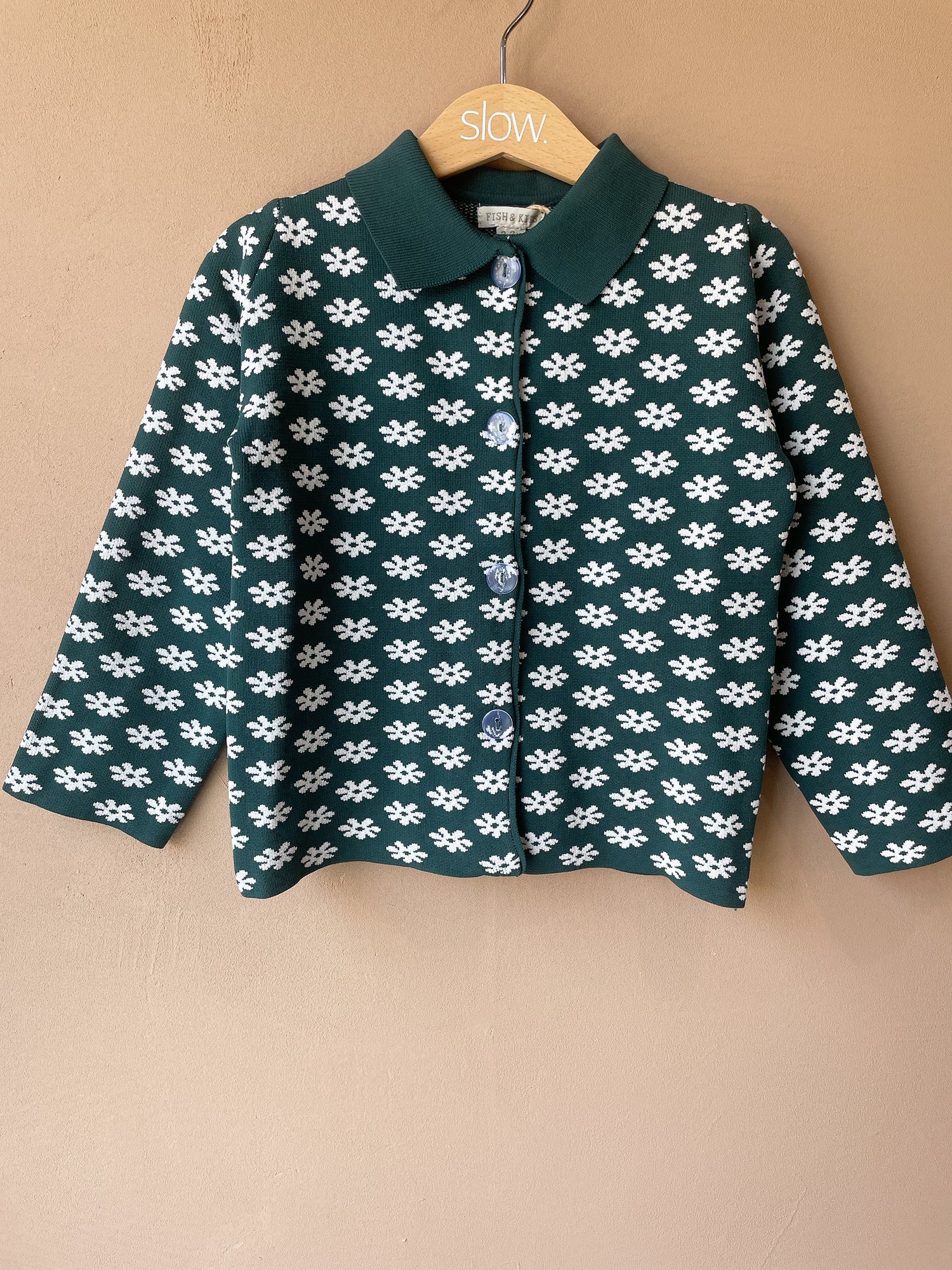文字通り定番レトロな襟付きカーディガン。前のボタンはクリアでfish&kidsらしさ満点。素材はナイロンですがイメージとしては毛羽立たないしっかりとしたニットという感じです。