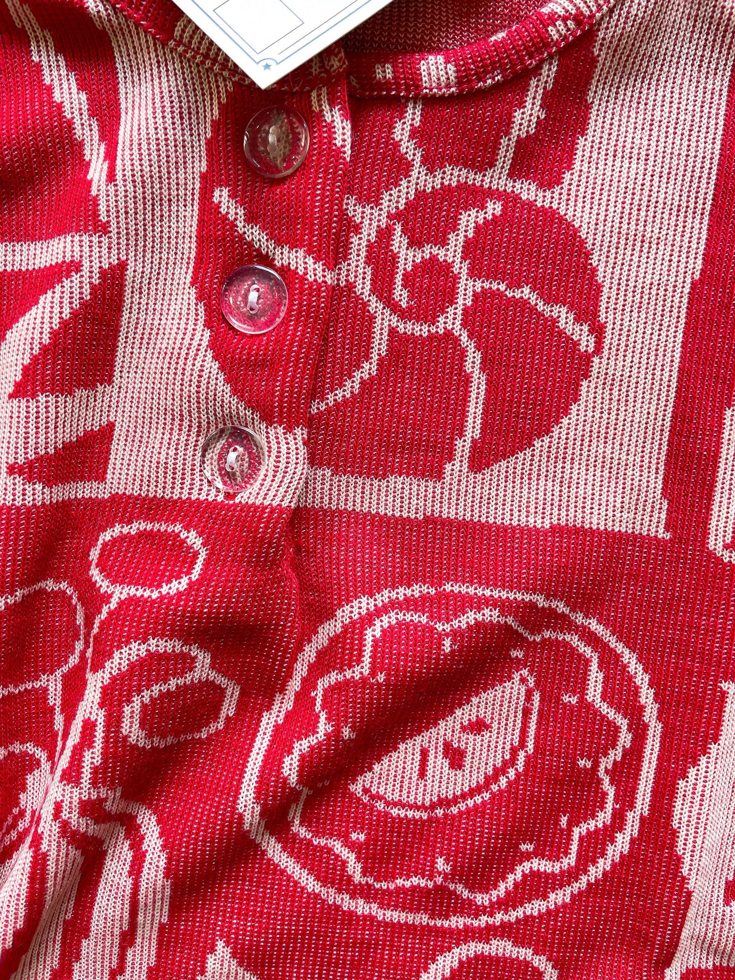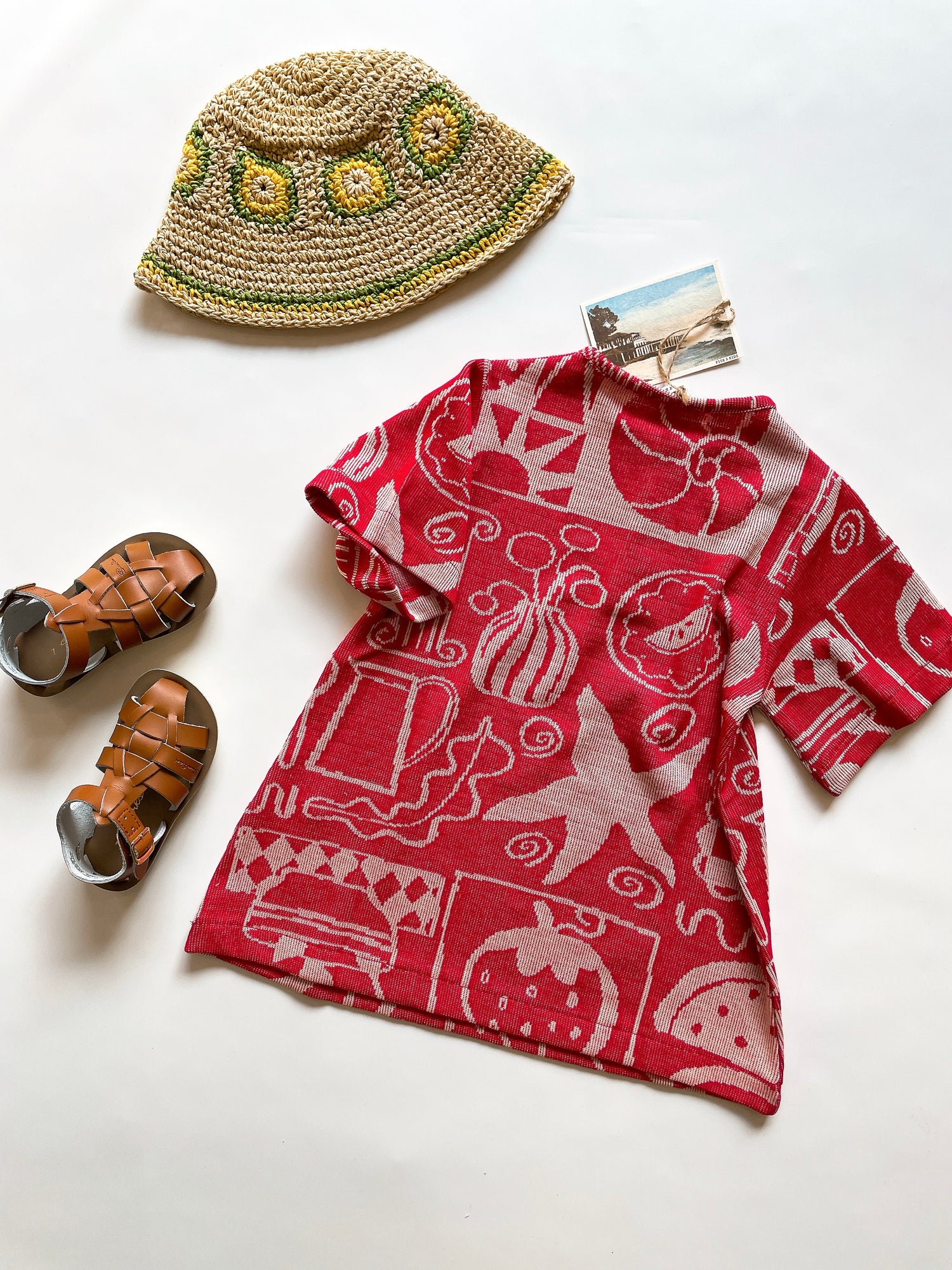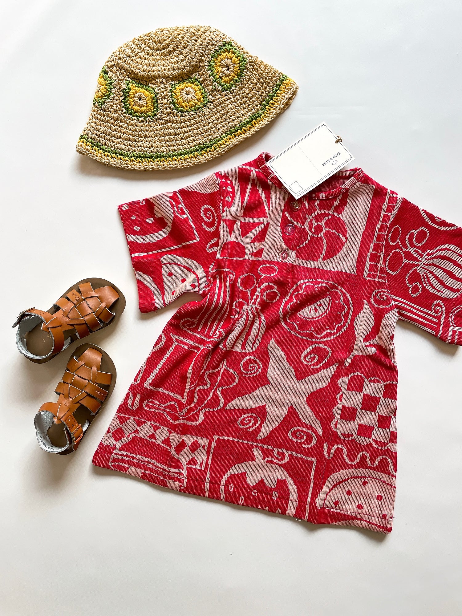 さらっとした柔らかいニット生地のワンピース。夏らしいヒトデや貝などの海のモチーフとイチゴやレモンの柄。柄の出方は個々に違います。スライドポケット付き。