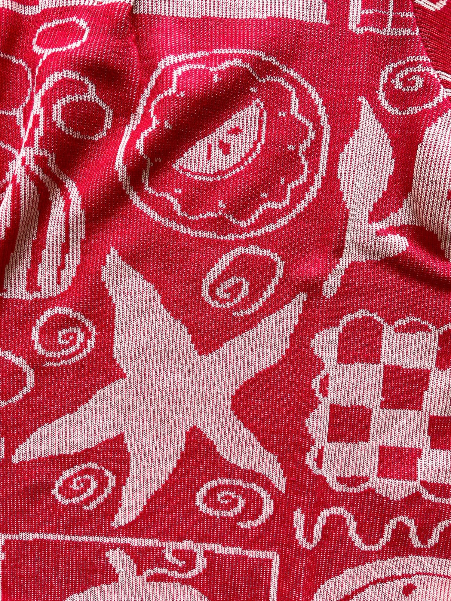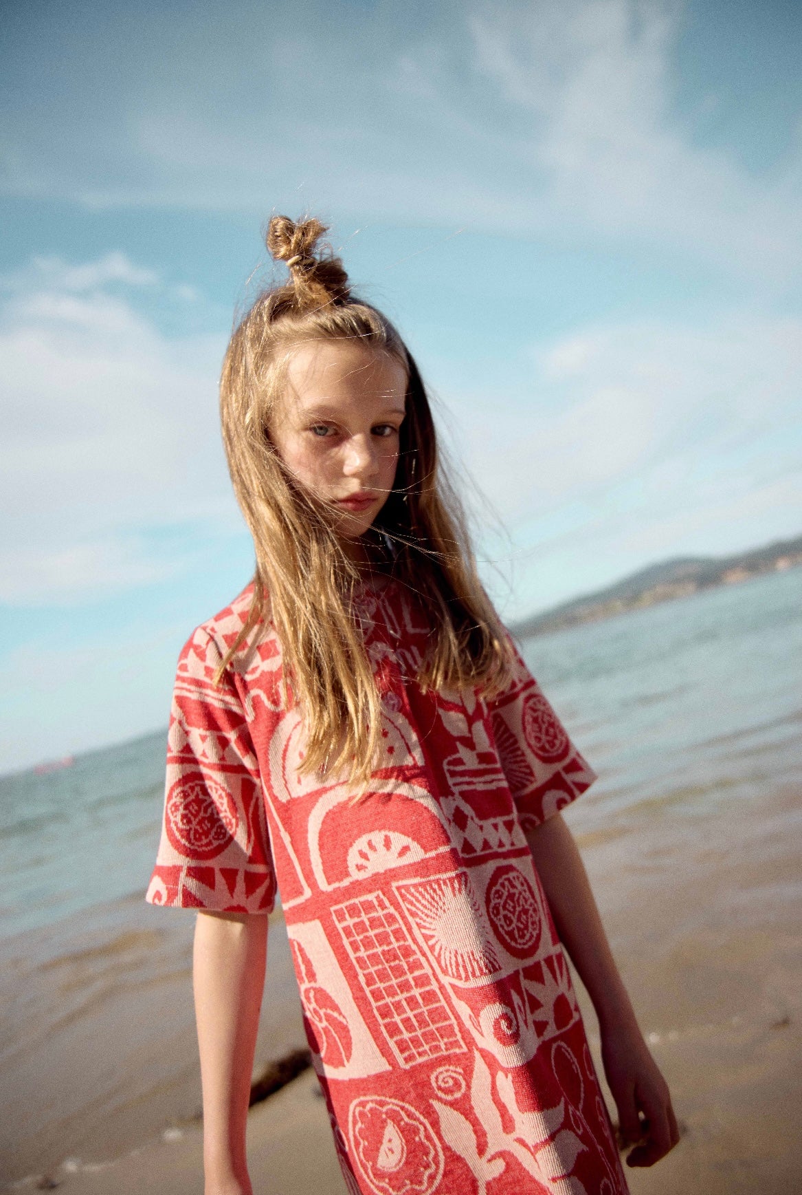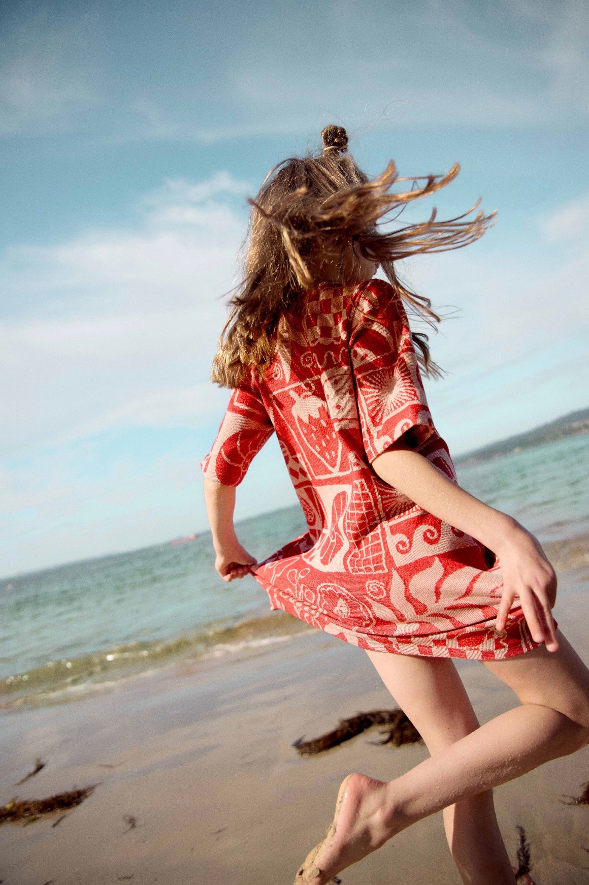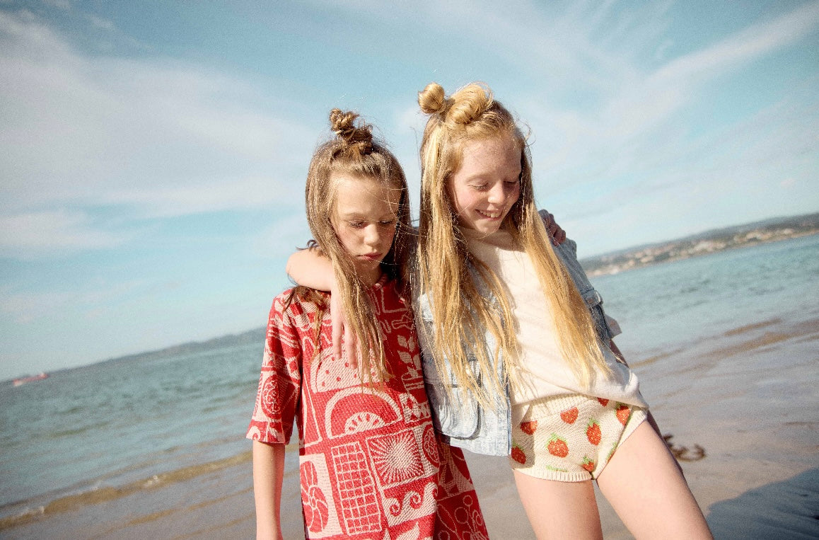 さらっとした柔らかいニット生地のワンピース。夏らしいヒトデや貝などの海のモチーフとイチゴやレモンの柄。柄の出方は個々に違います。スライドポケット付き。