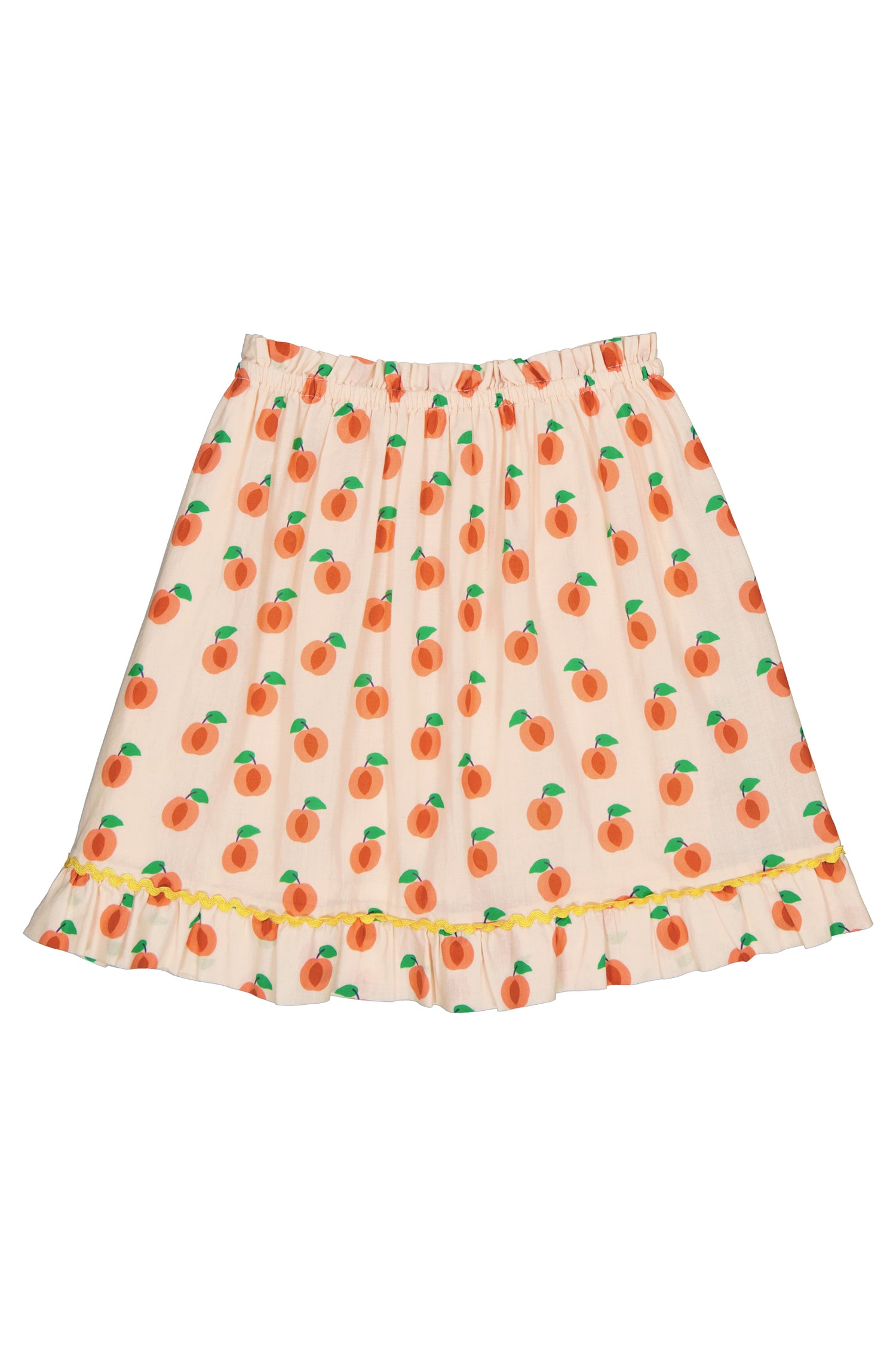 りんごにも見えるピーチのテキスタイルがポップで可愛いスカート。