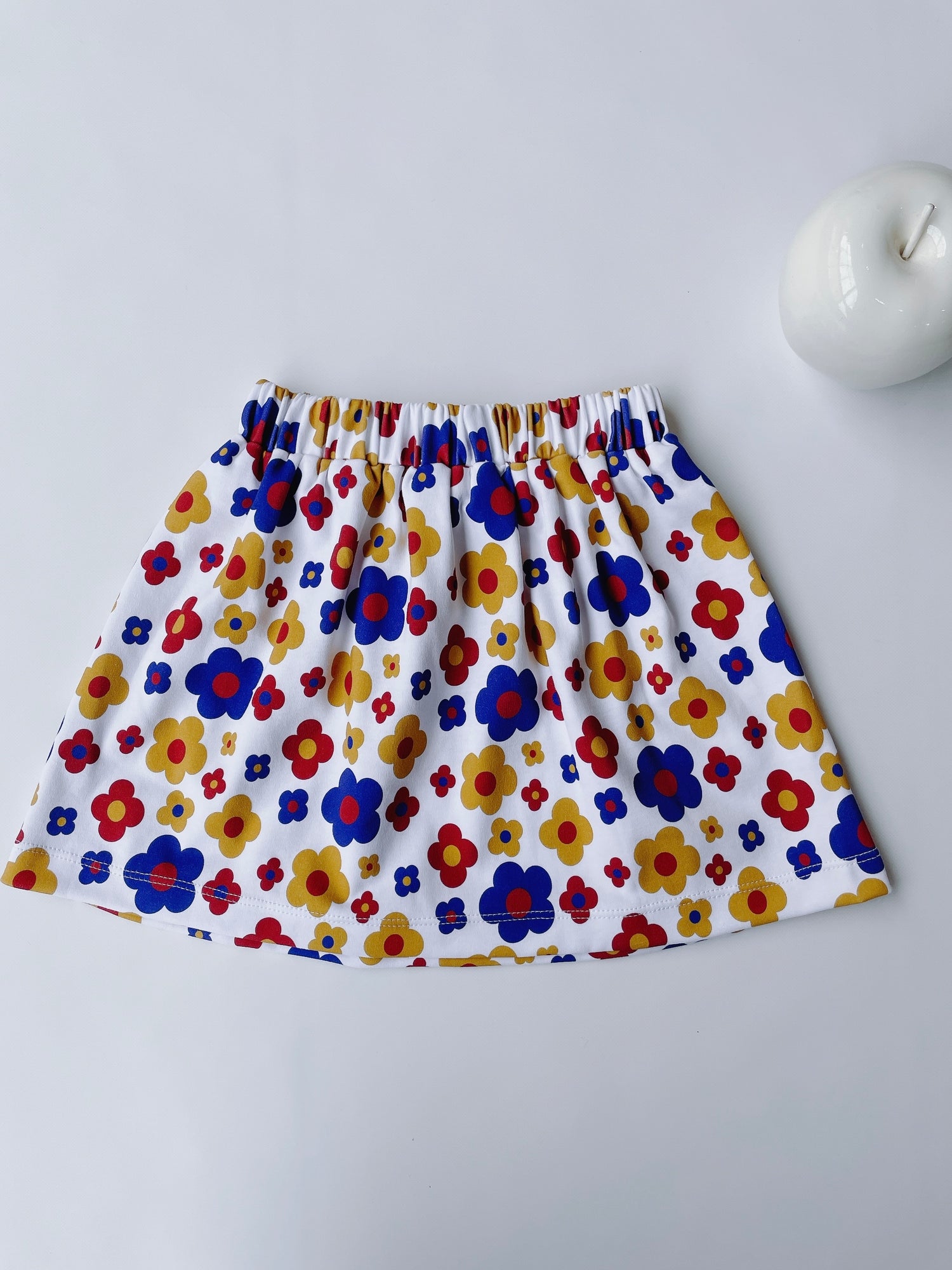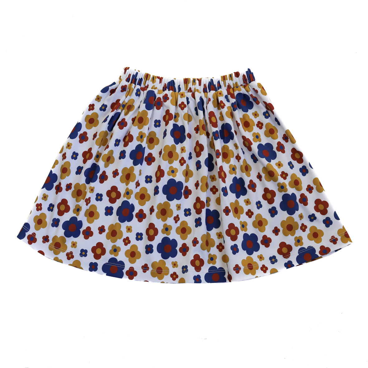 レトロポップなフラワー柄が可愛いシンプルな形のスカート。しっかりとしたウエストの平ゴムがズレを防いでくれそう。コットン100ですがポリエステルが入ってそうなイメージのするさらっとした通年使える生地です。