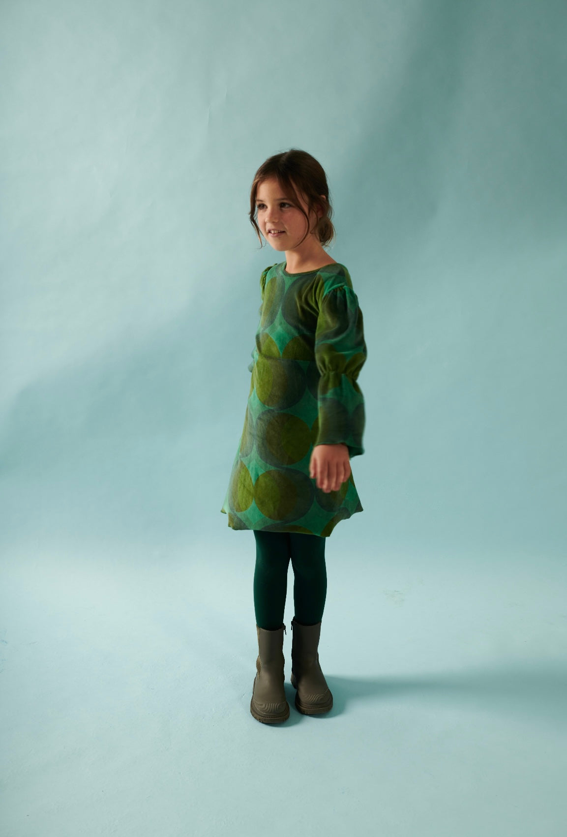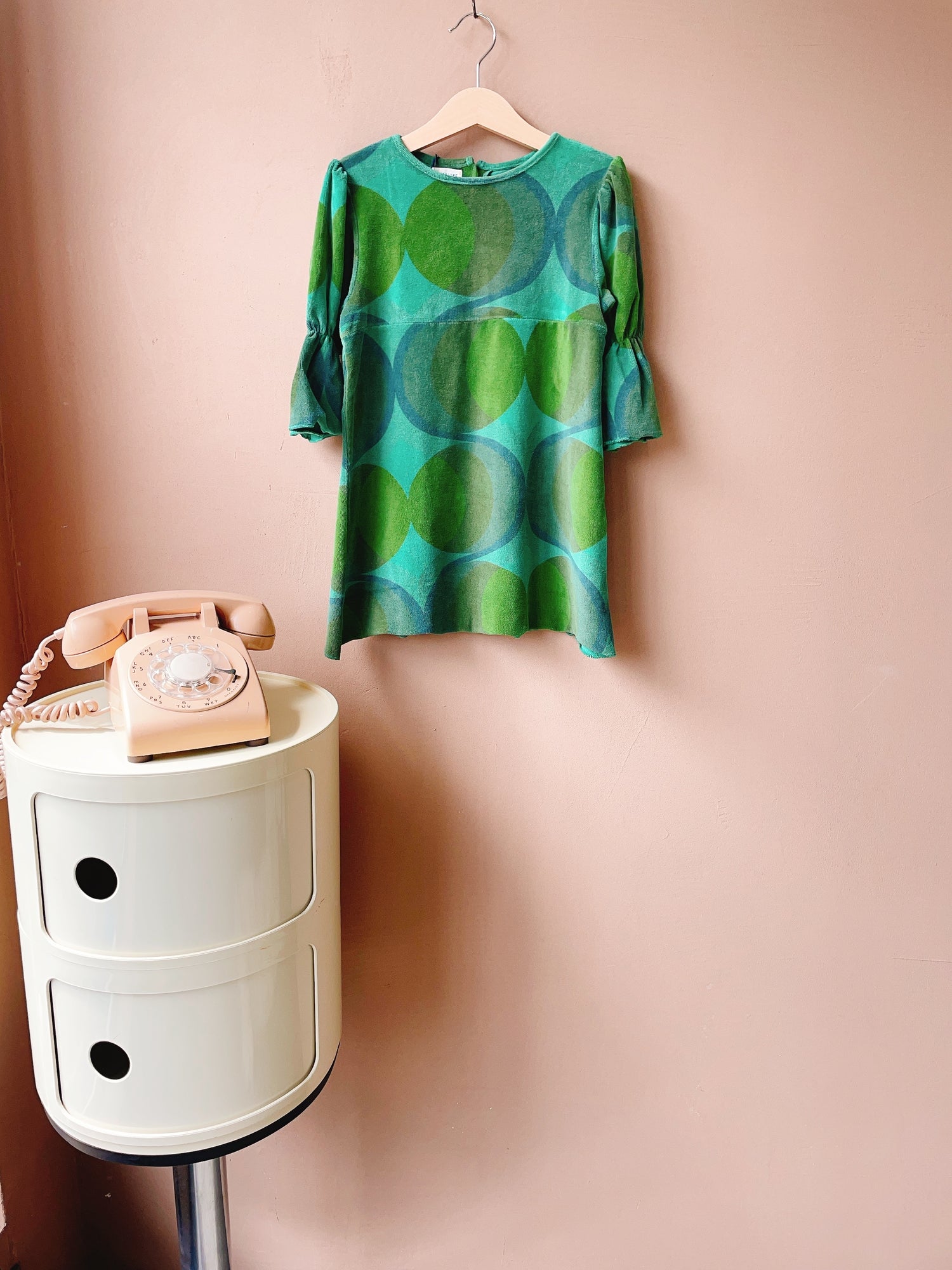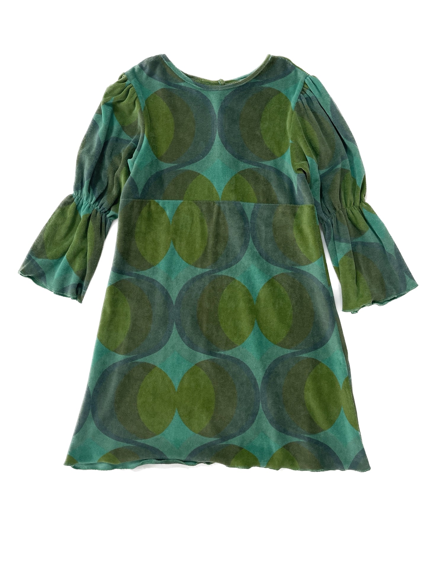 スペースエイジ的なレトロシックなドレス。ダークカラーのドレスは明るい色のタイツで遊ぶとキュート◎テリー感があるのでテリーベロアといった表現がしっくりくるのかもしれません。ハイウエストで切り返しがあり、スタイルアップ効果も。裾はくるっと少し巻き上がる仕様。
