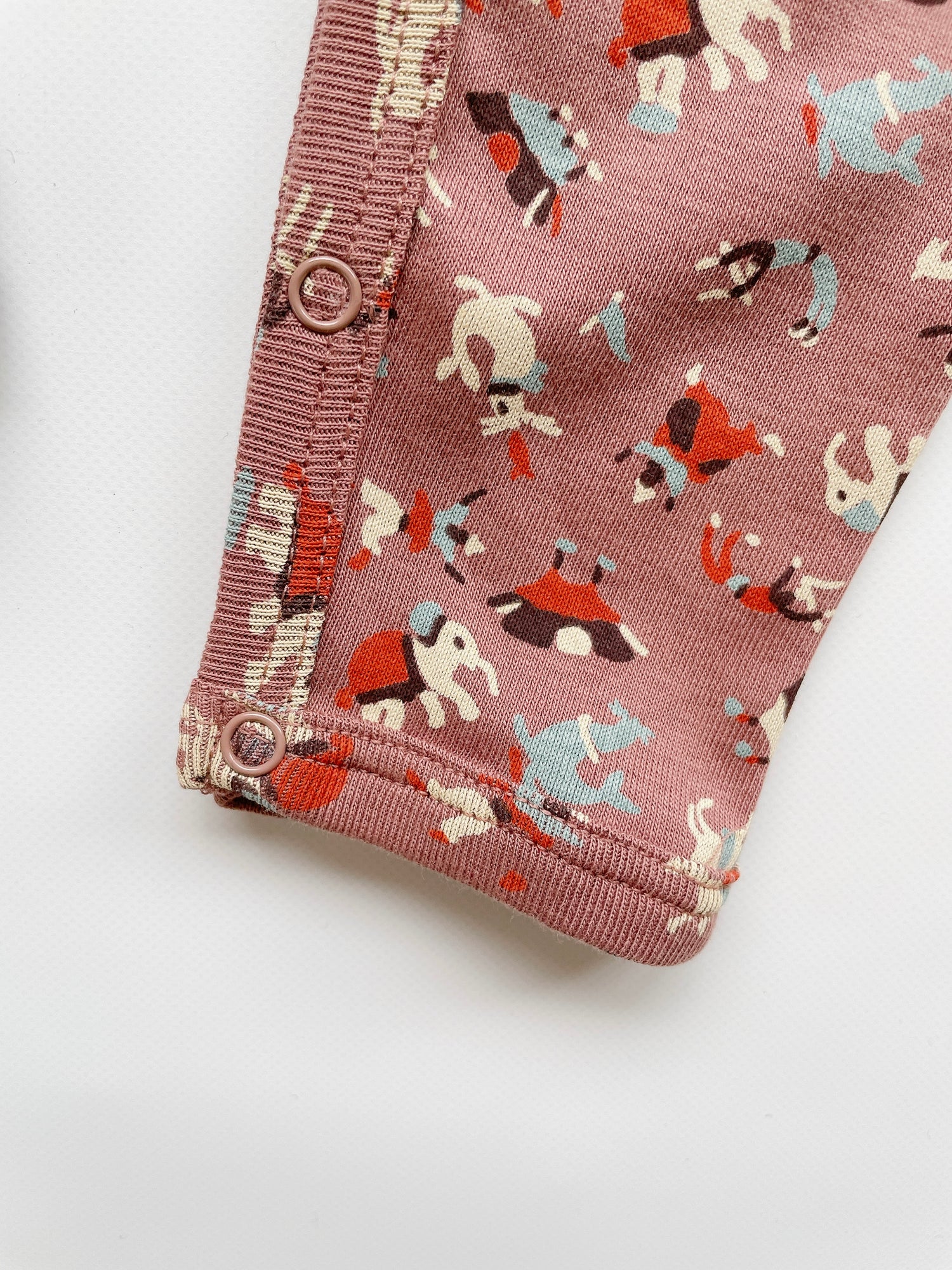 やわらかいピマコットンの長袖ジャンプスーツ。ラップショルダーで脚部分はおむつ替えスナップ付き。