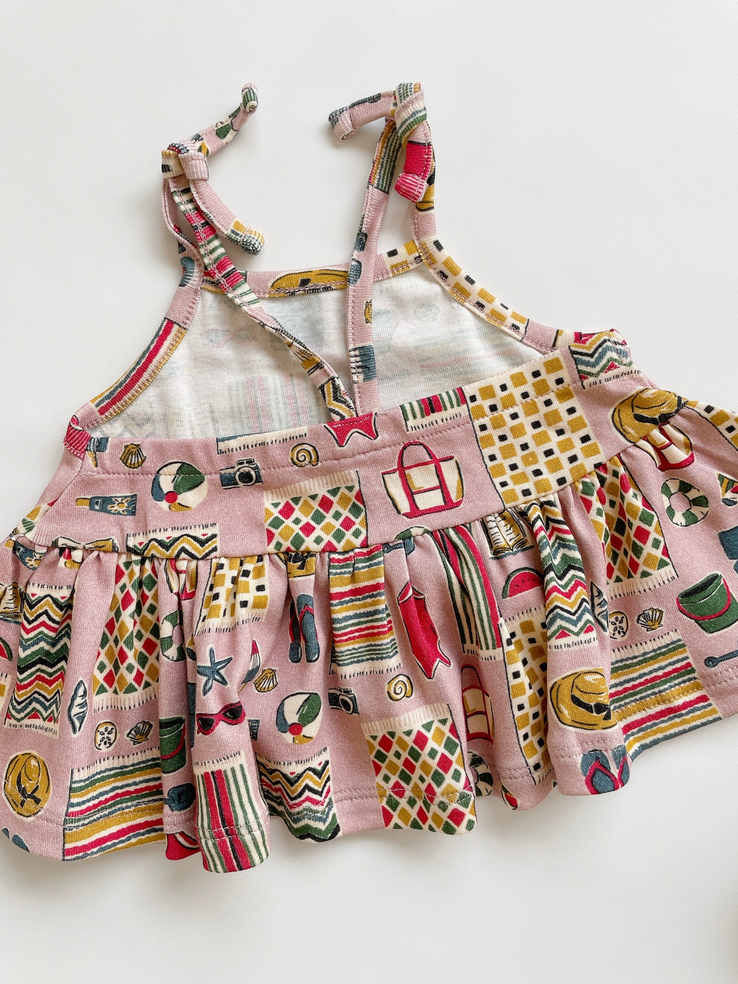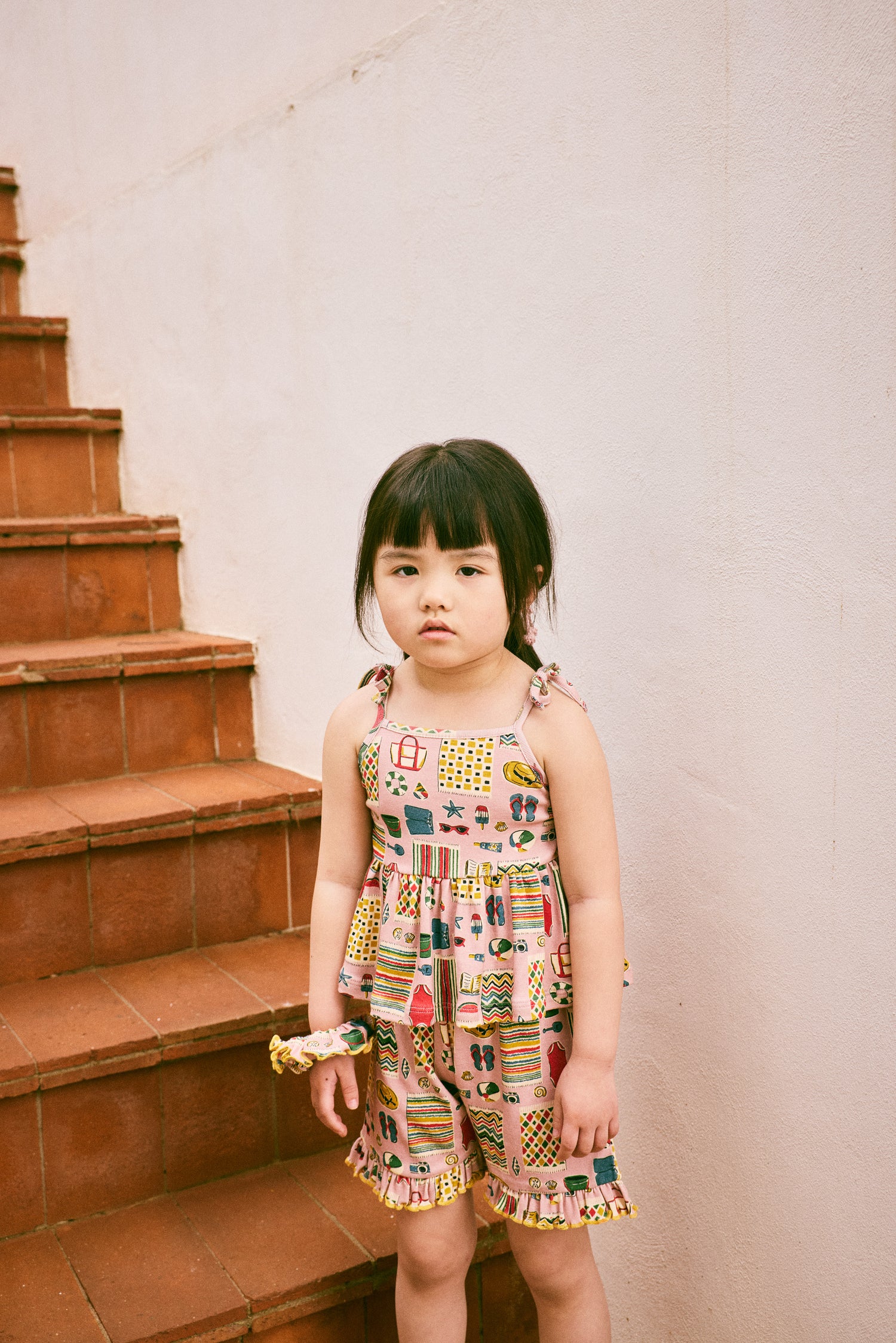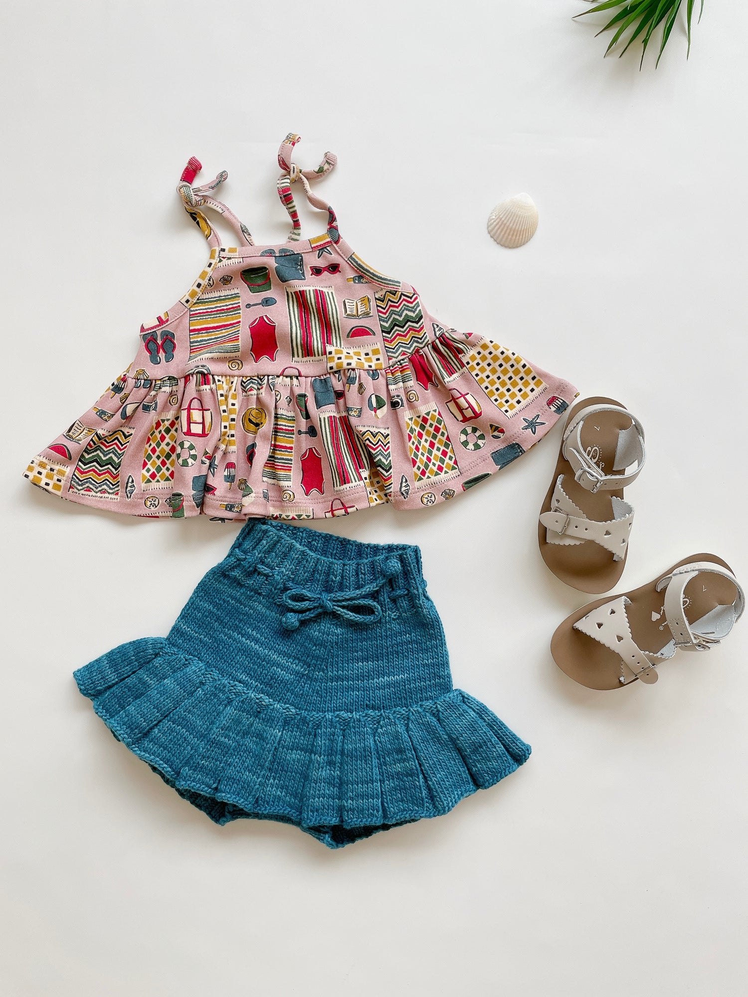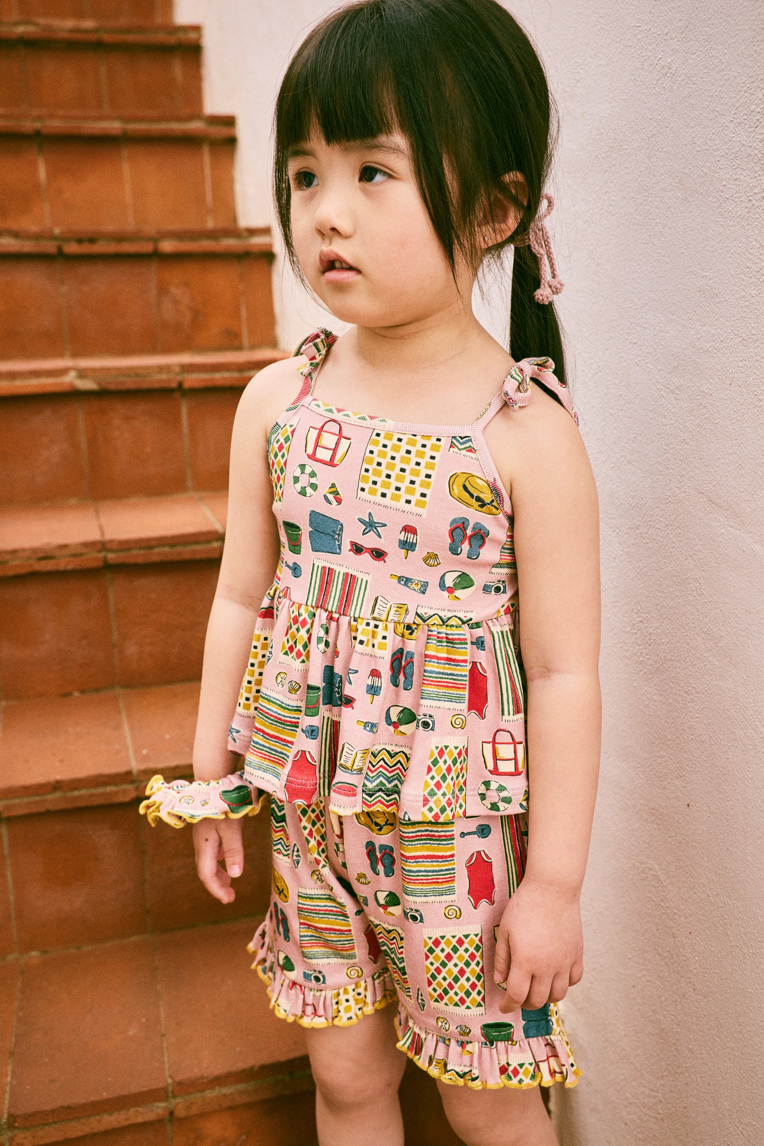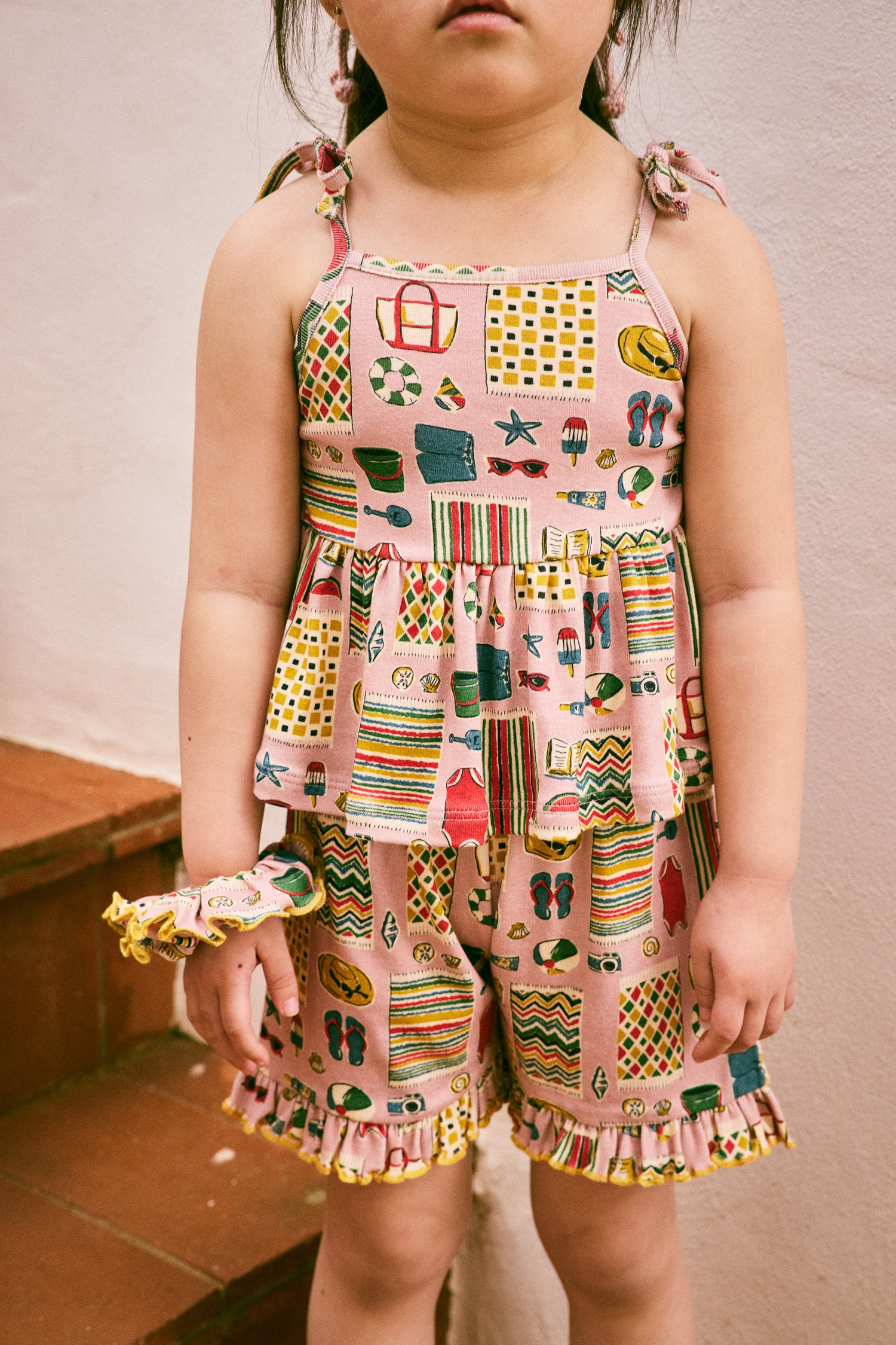 オーガニックピマコットンを使用したペプラムスタイルのキャミソール。背中の中央でV字型に結ばれる調節可能なショルダーストラップタイが付いています。プレイフルな夏のバカンスに持っていきたい気持ちのいいピマコットン素材。