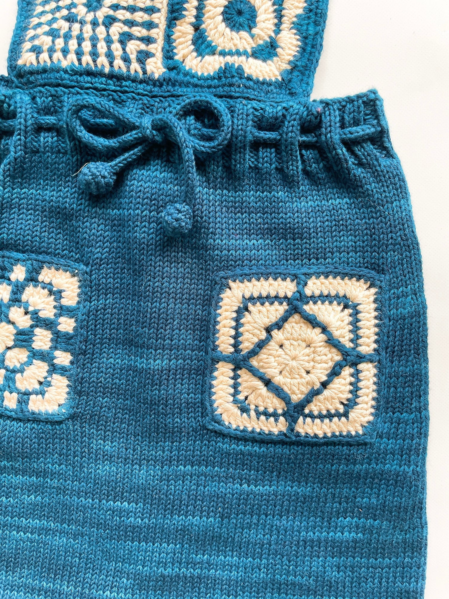 ピマコットン製のエプロンドレス。手編みのアフガン風デザインとパッチポケット、