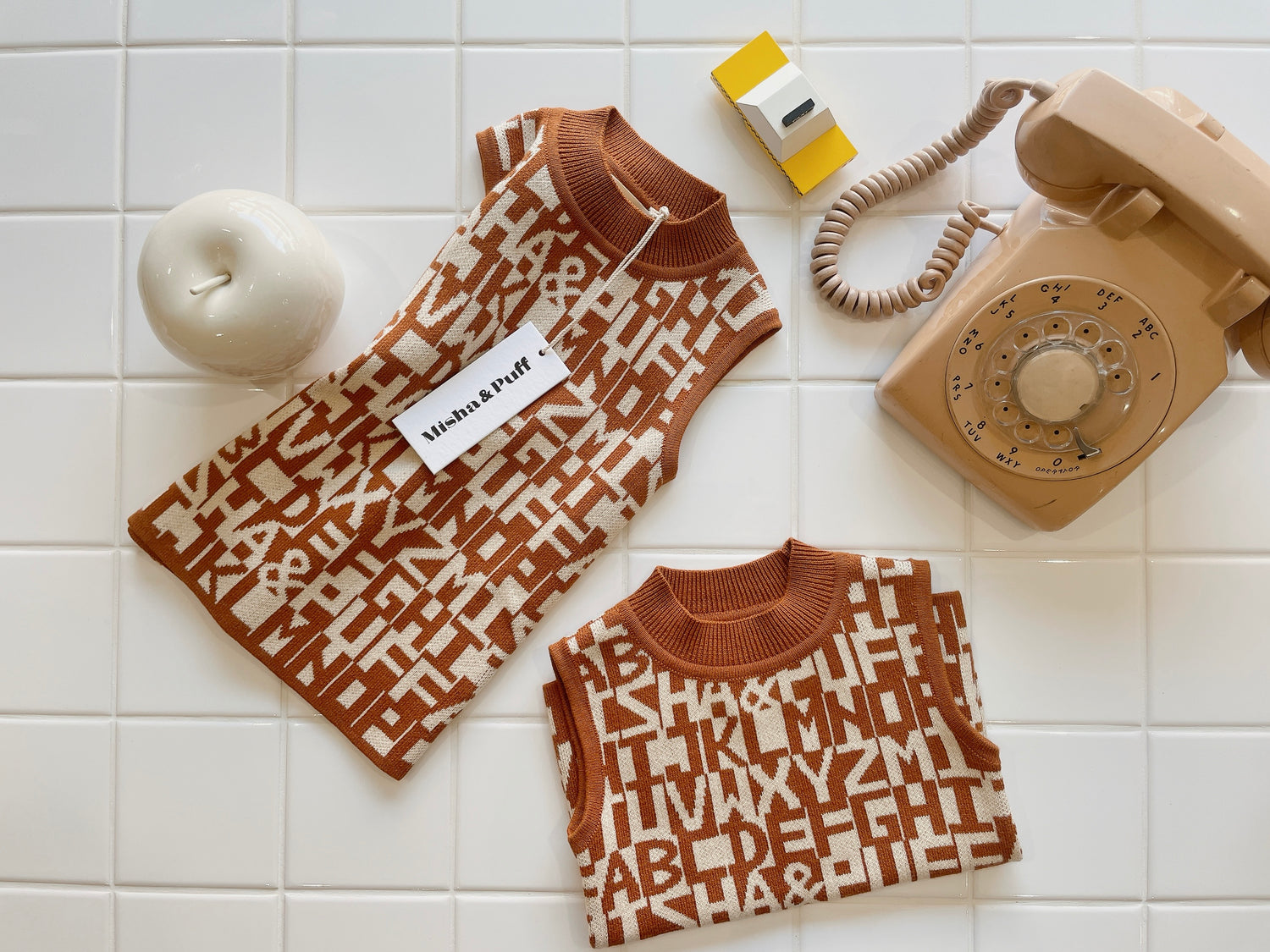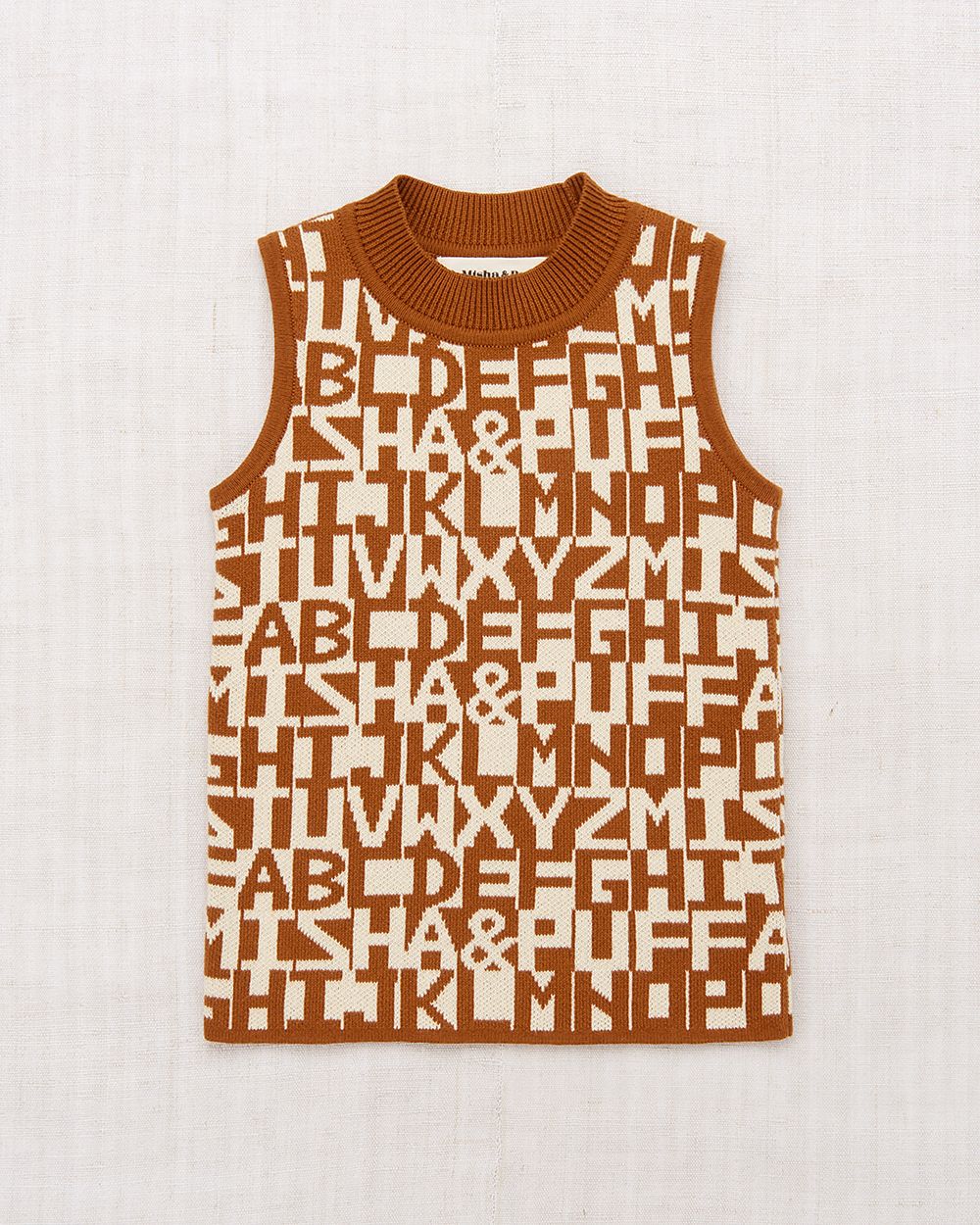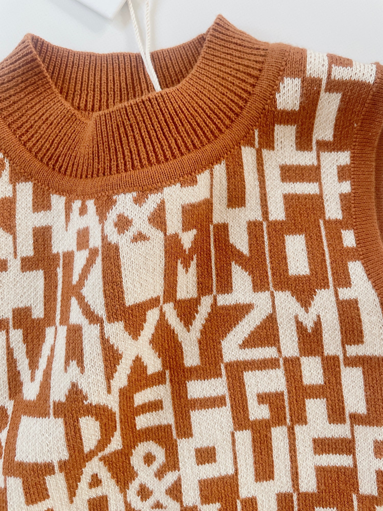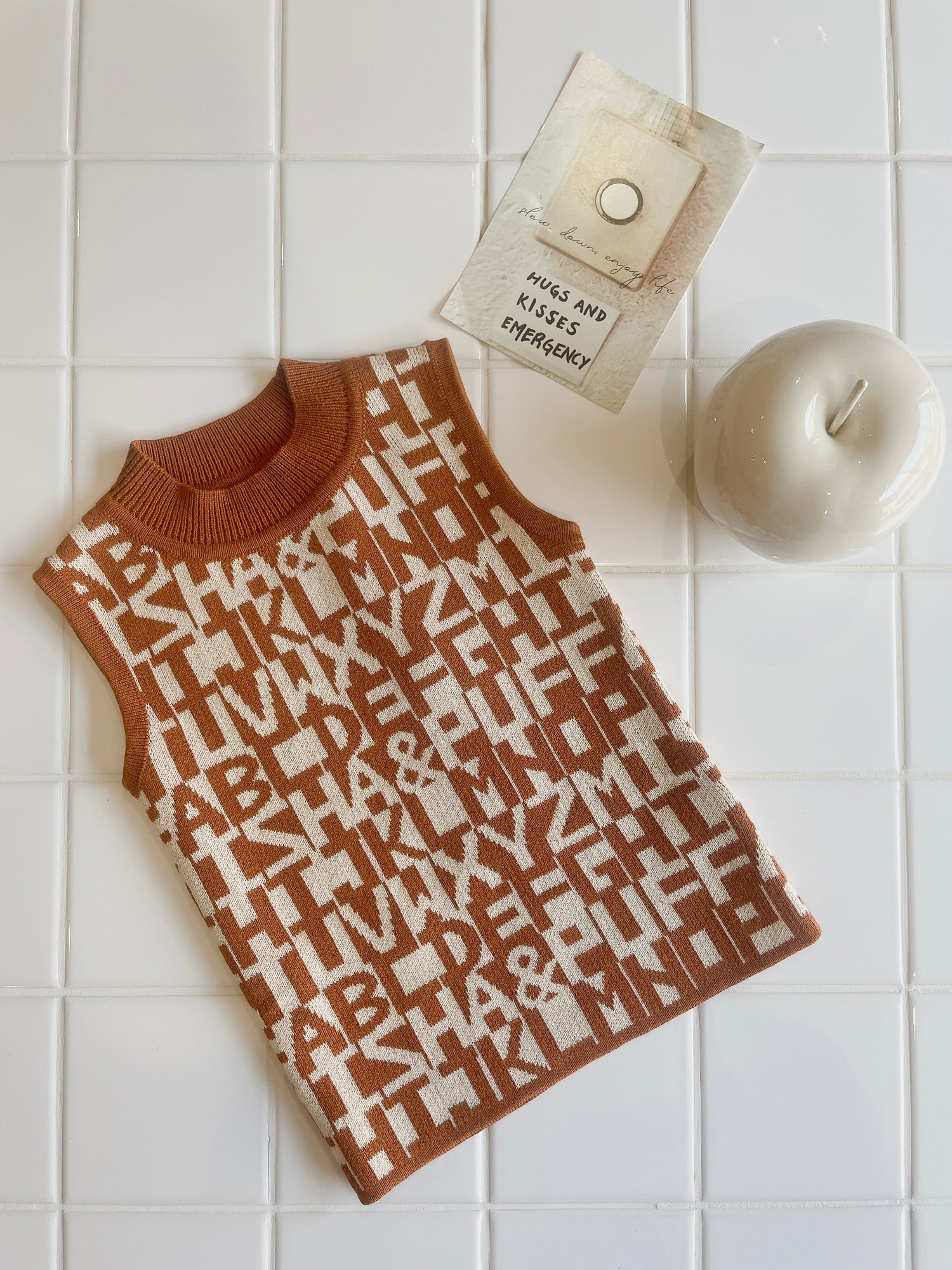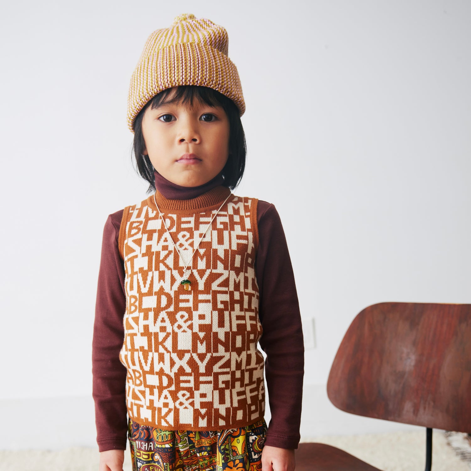 遊び心のあるアルファベット文字のデザインが施されたピマコットンジャカード ニットのノースリーブモックネックベスト。リブネックと無地のトリムが特徴です。重ね着にも、暖かい日には単体でも着用できます。