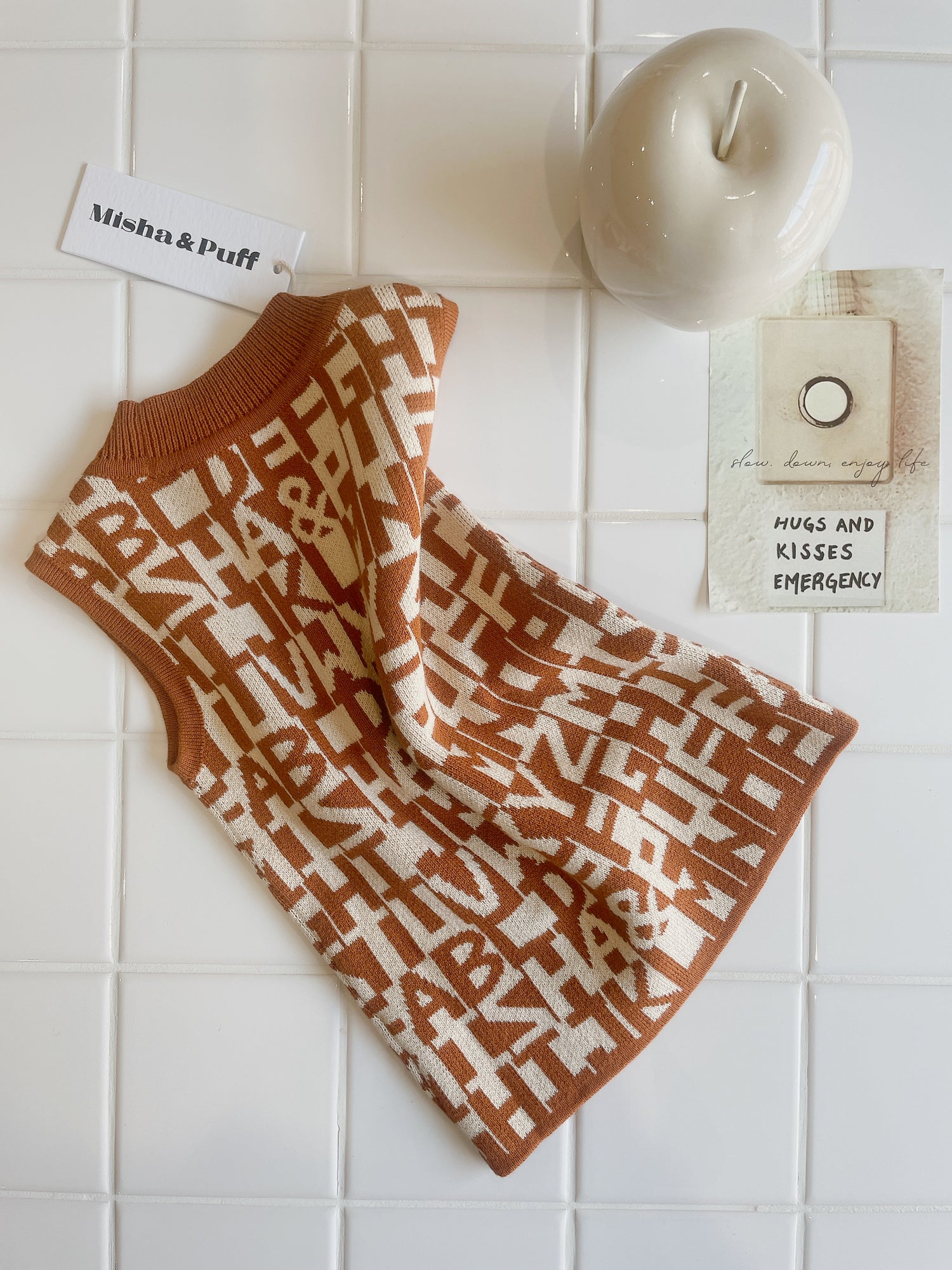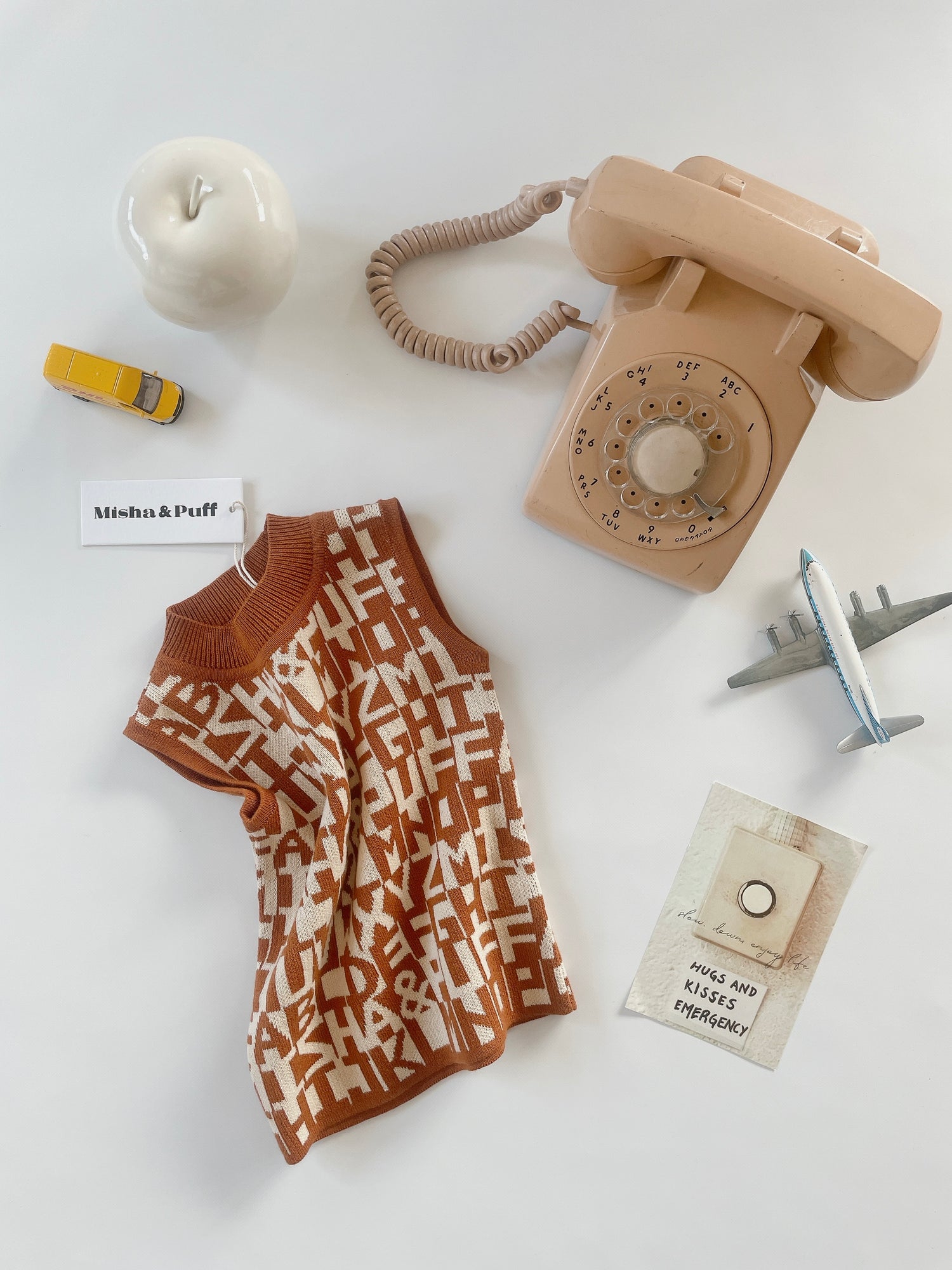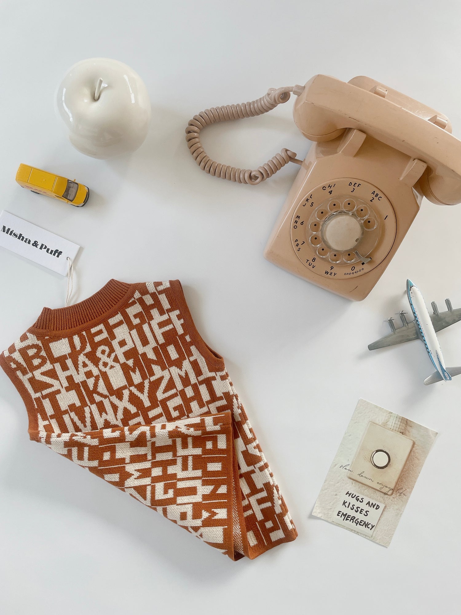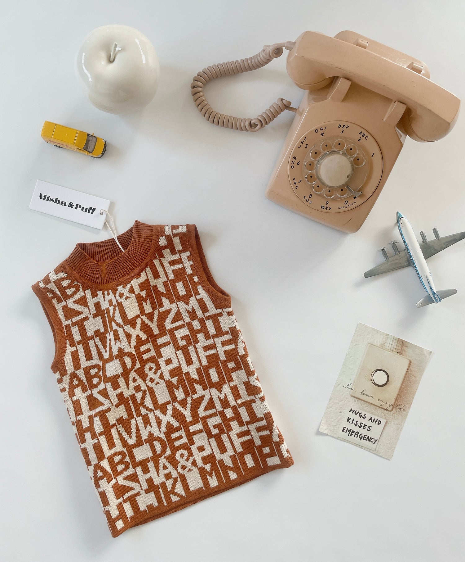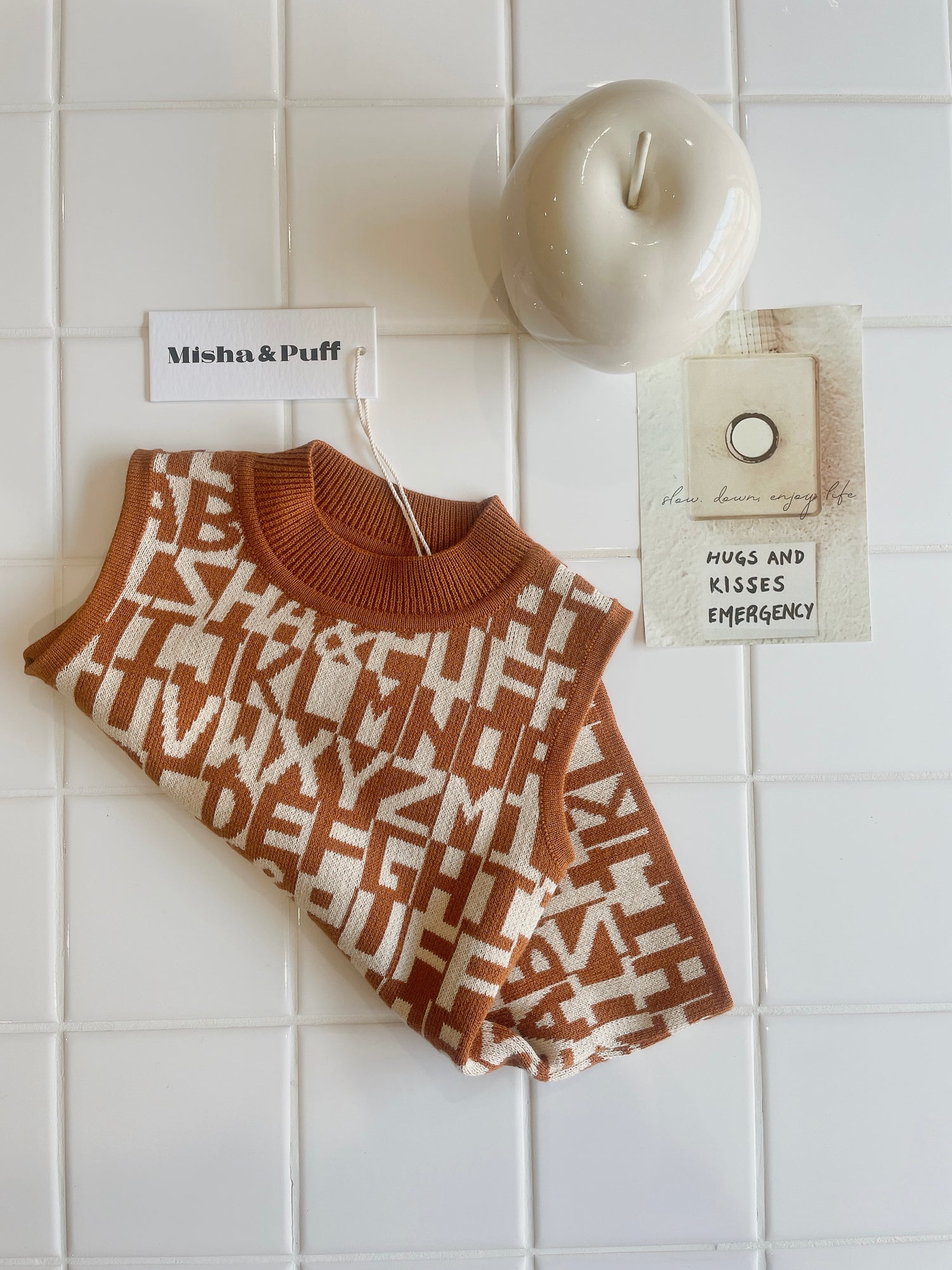 遊び心のあるアルファベット文字のデザインが施されたピマコットンジャカード ニットのノースリーブモックネックベスト。リブネックと無地のトリムが特徴です。重ね着にも、暖かい日には単体でも着用できます。