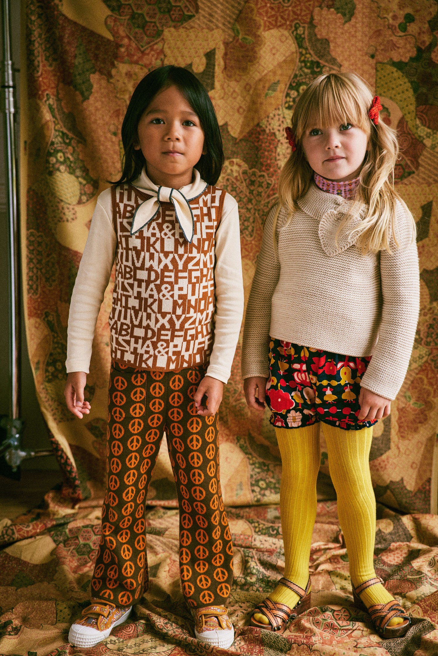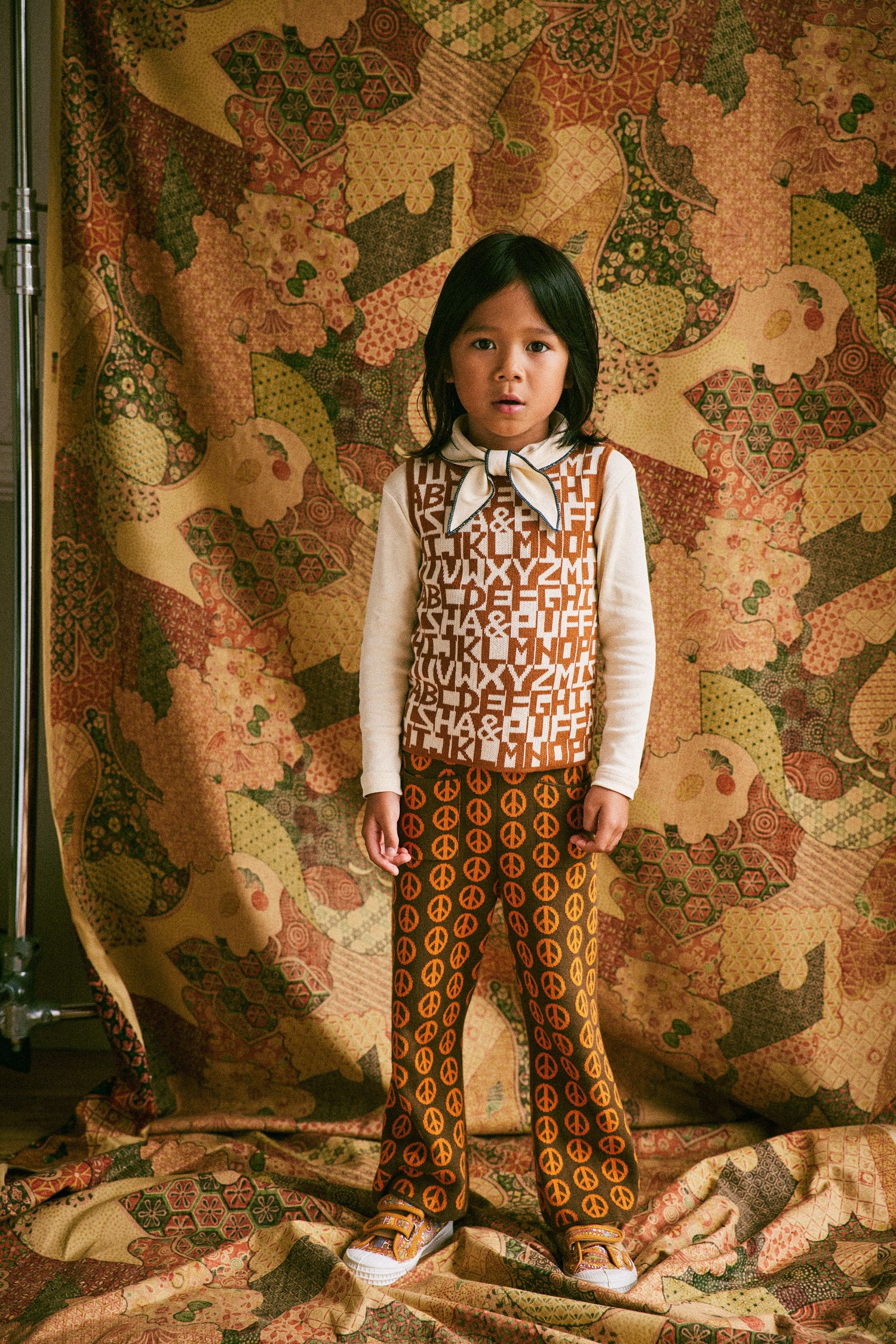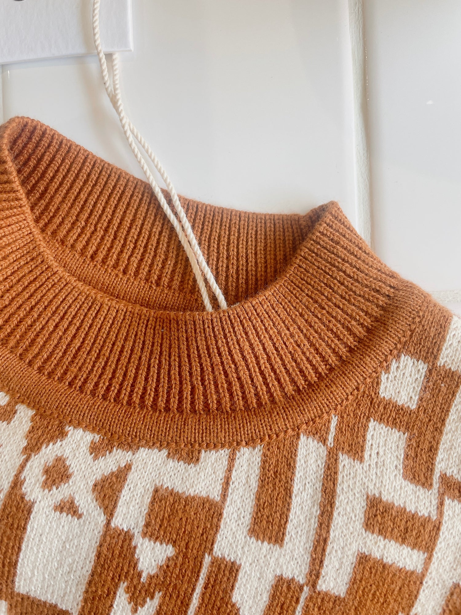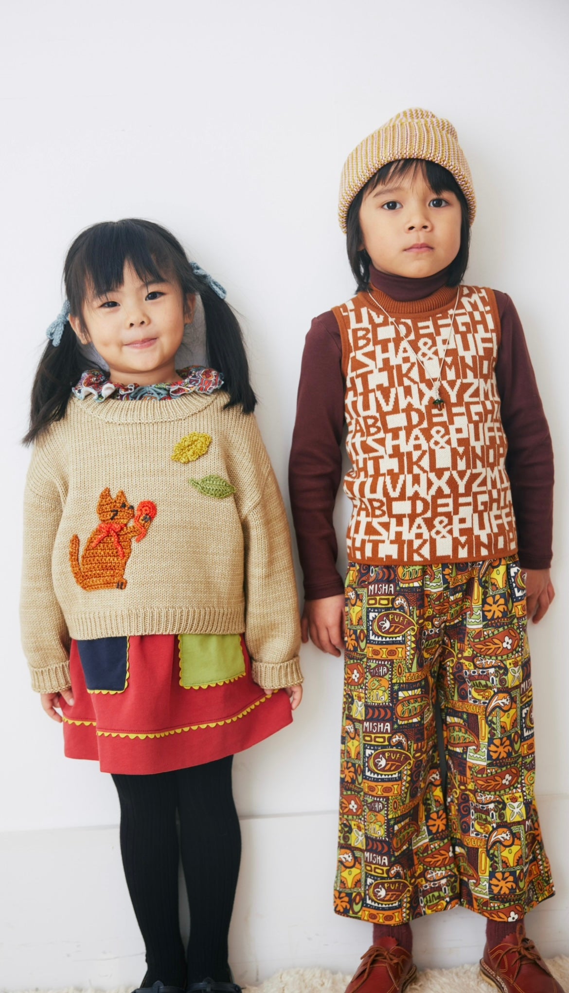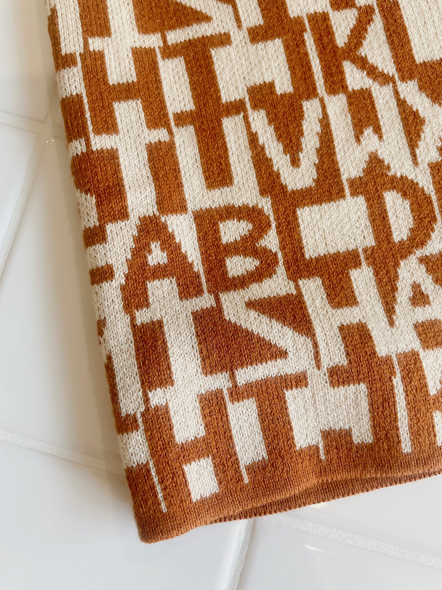遊び心のあるアルファベット文字のデザインが施されたピマコットンジャカード ニットのノースリーブモックネックベスト。リブネックと無地のトリムが特徴です。重ね着にも、暖かい日には単体でも着用できます。