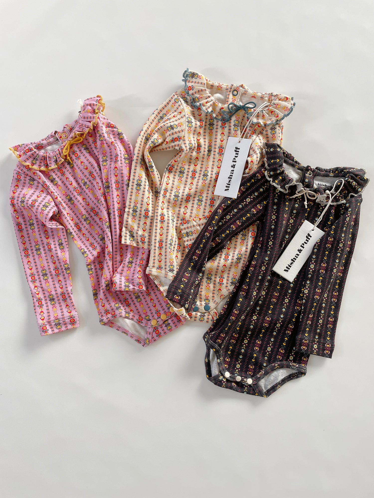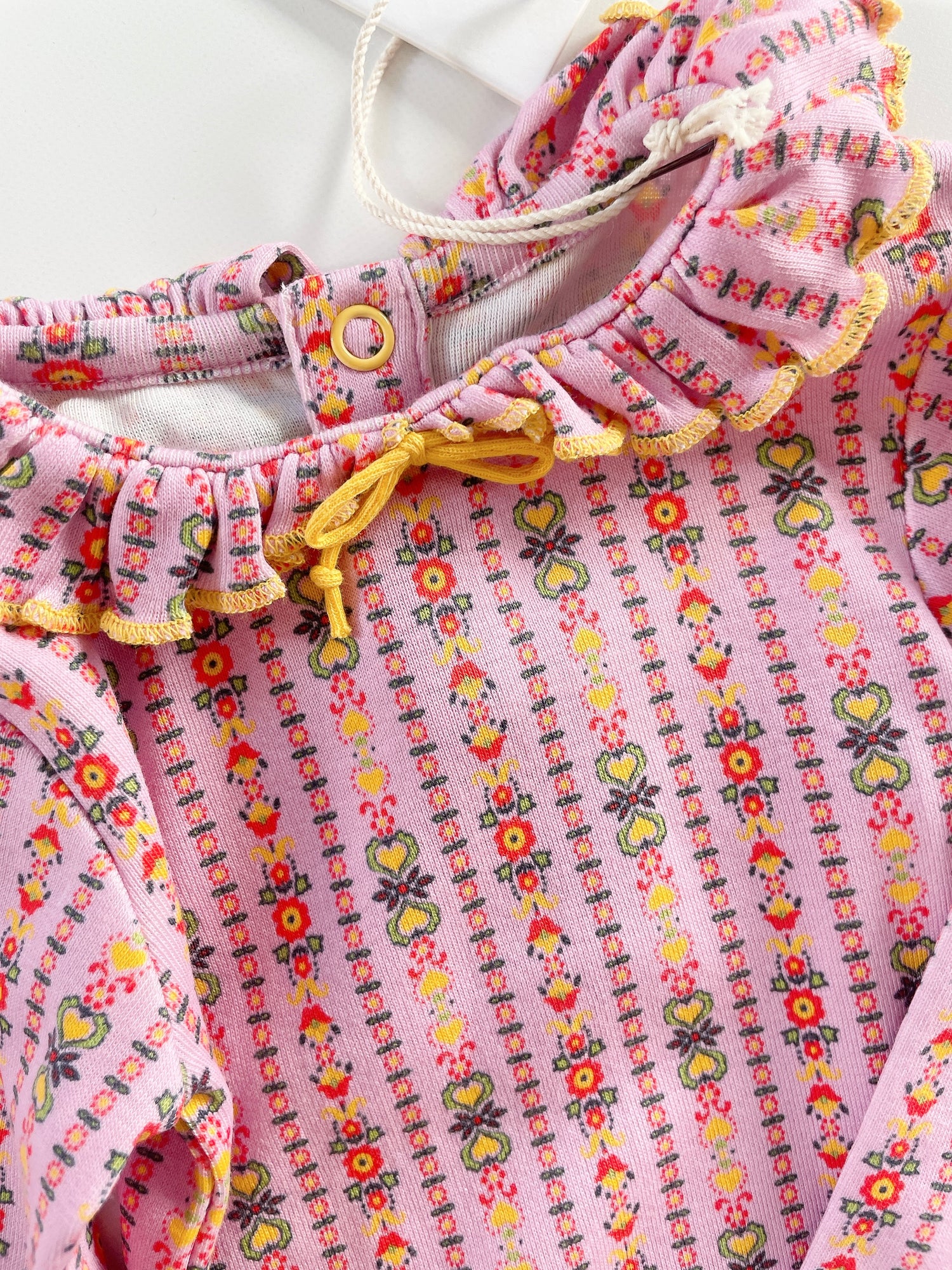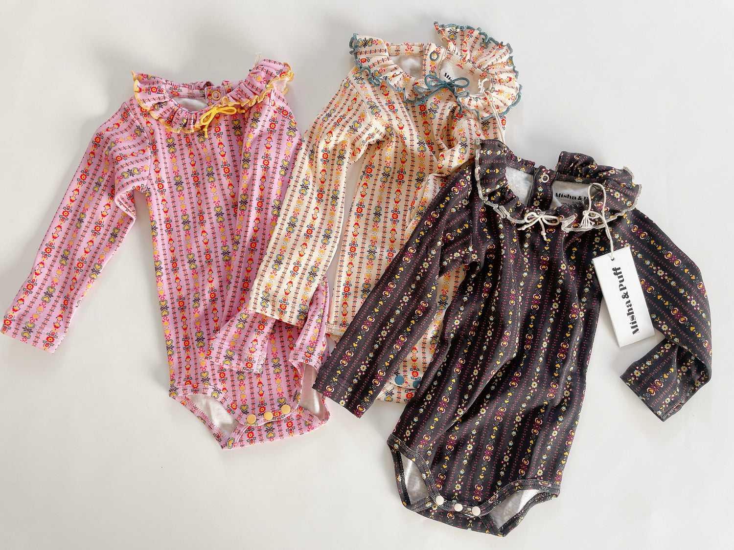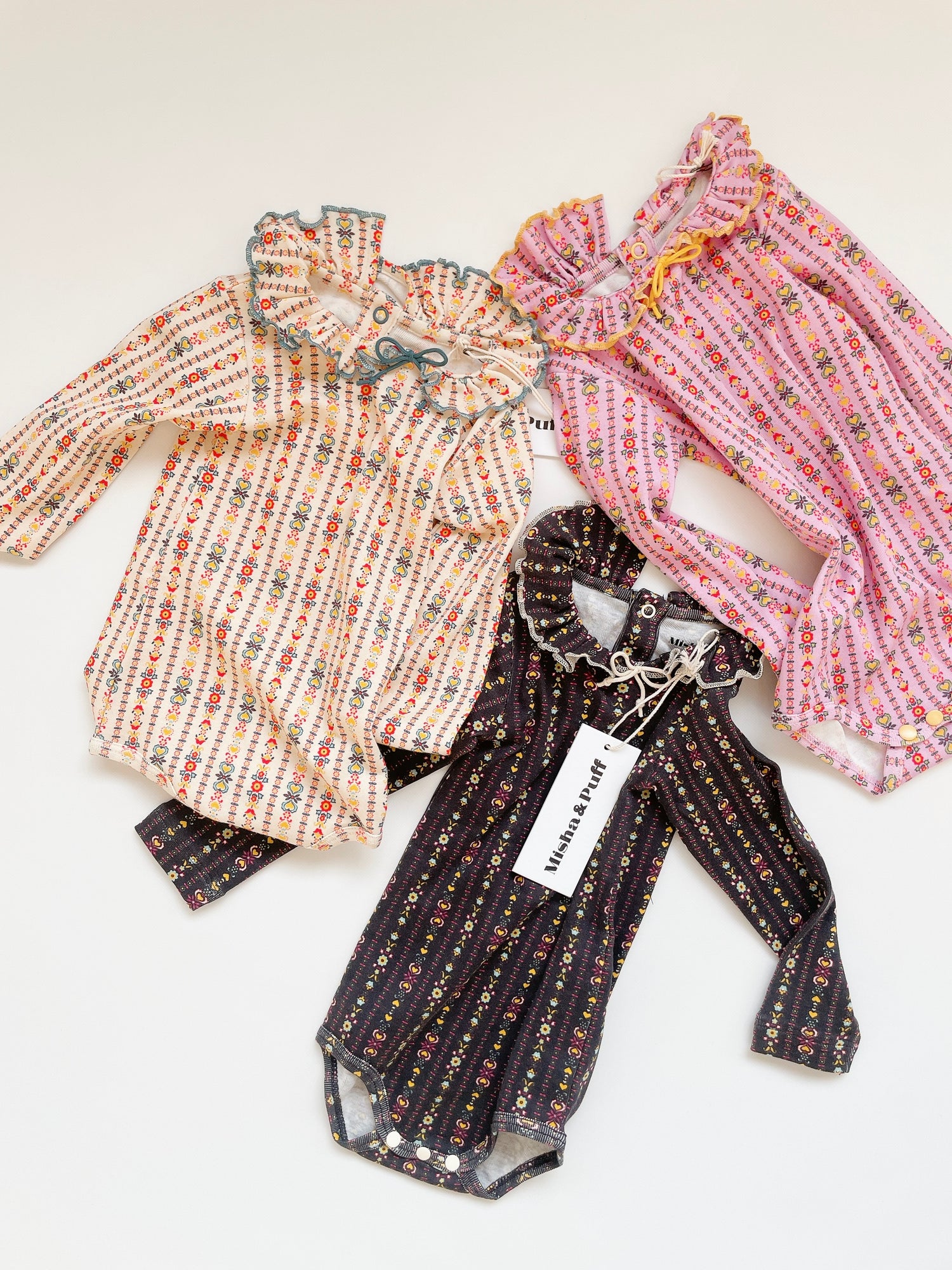 柔らかいピマコットンを使用したクラシックな長袖ワンジー。ギャザーの入ったフリルネックの中央に繊細なリボンがついています。コントラストの効いたメロウエッジ、首の後ろと裾にスナップ留めが付いています。
