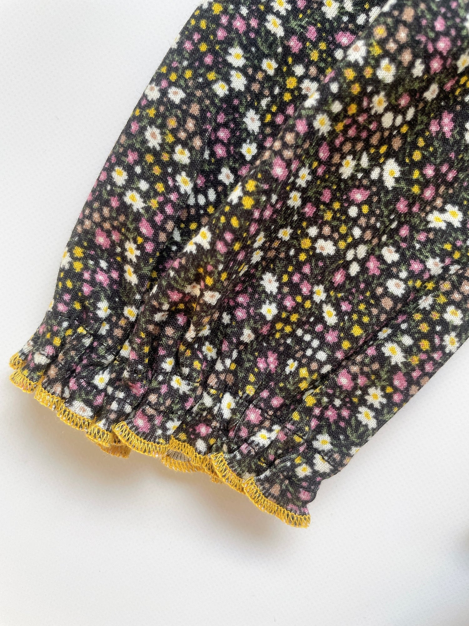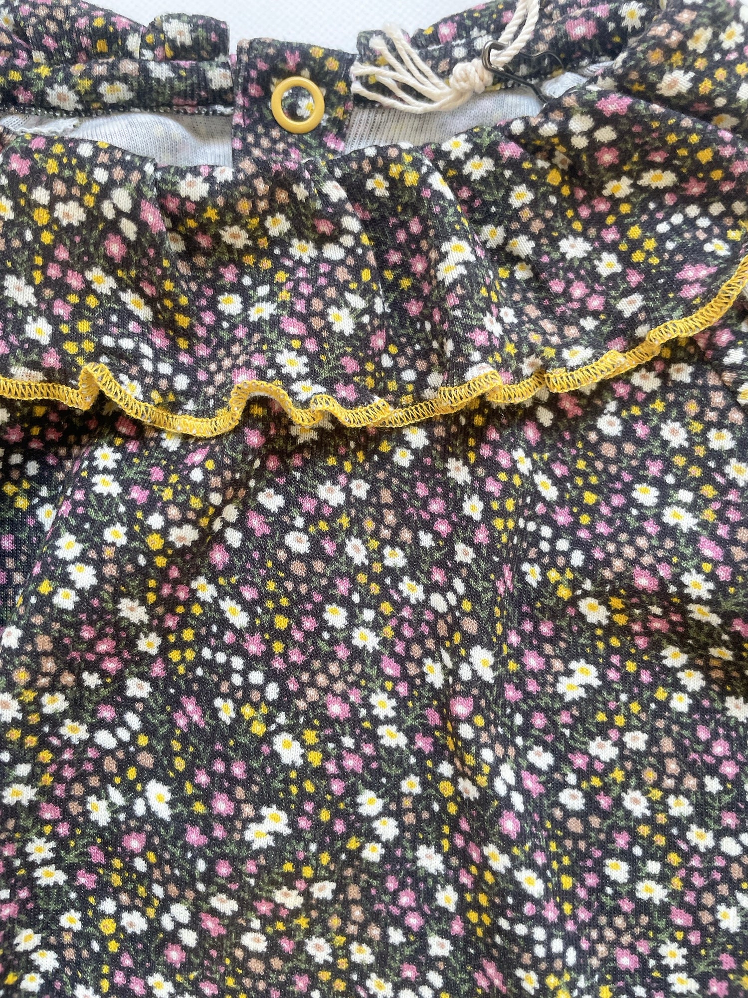 柔らかく肌ざわりのいいピマコットンのゆったりとした長袖ワンジー。オーバーサイズのゆったりとしたボディが、袖口と裾にフリル状に集まり、コントラストの効いたメロウエッジが施されています。首の後ろはスナップボタンで開閉します。