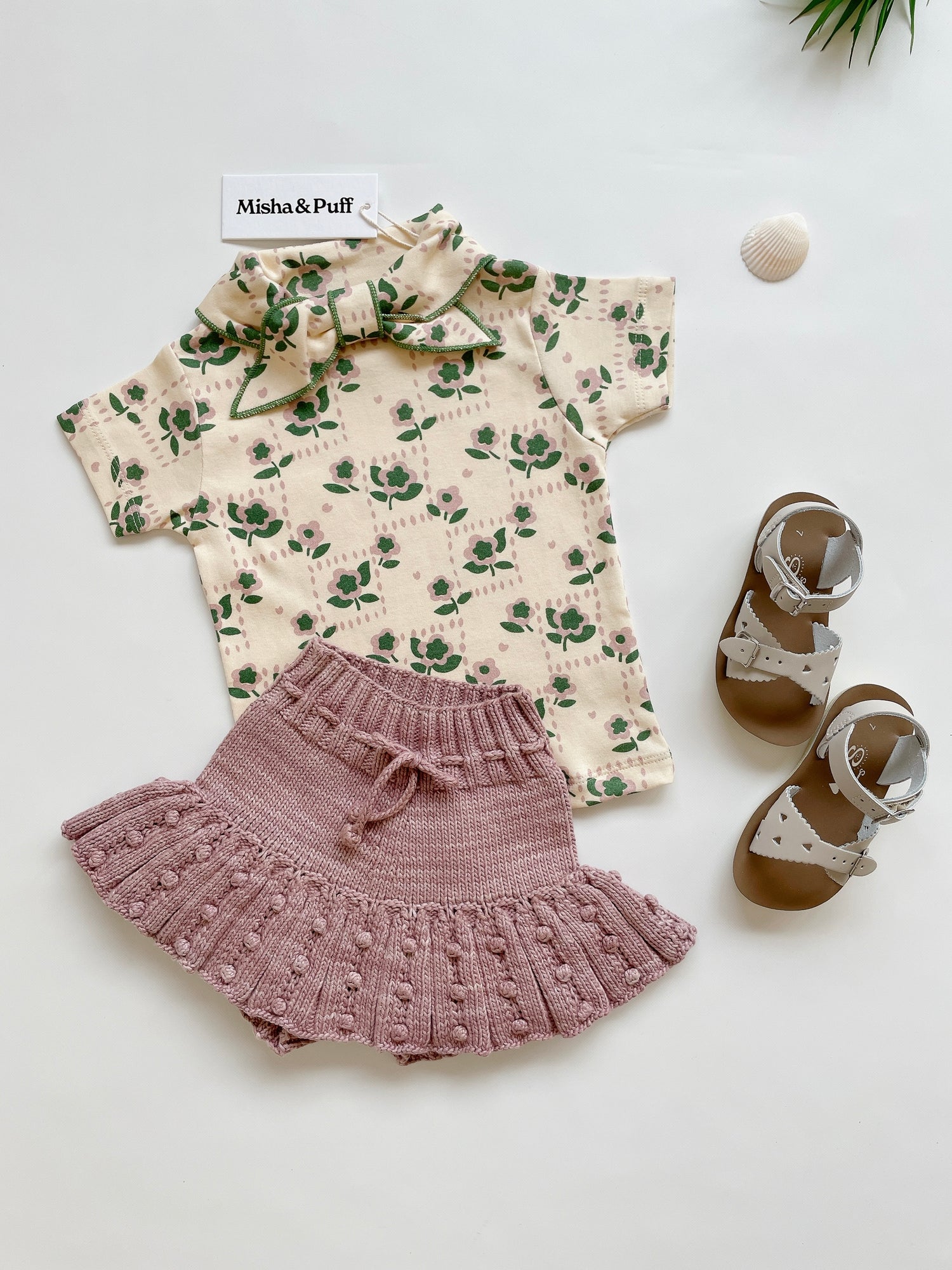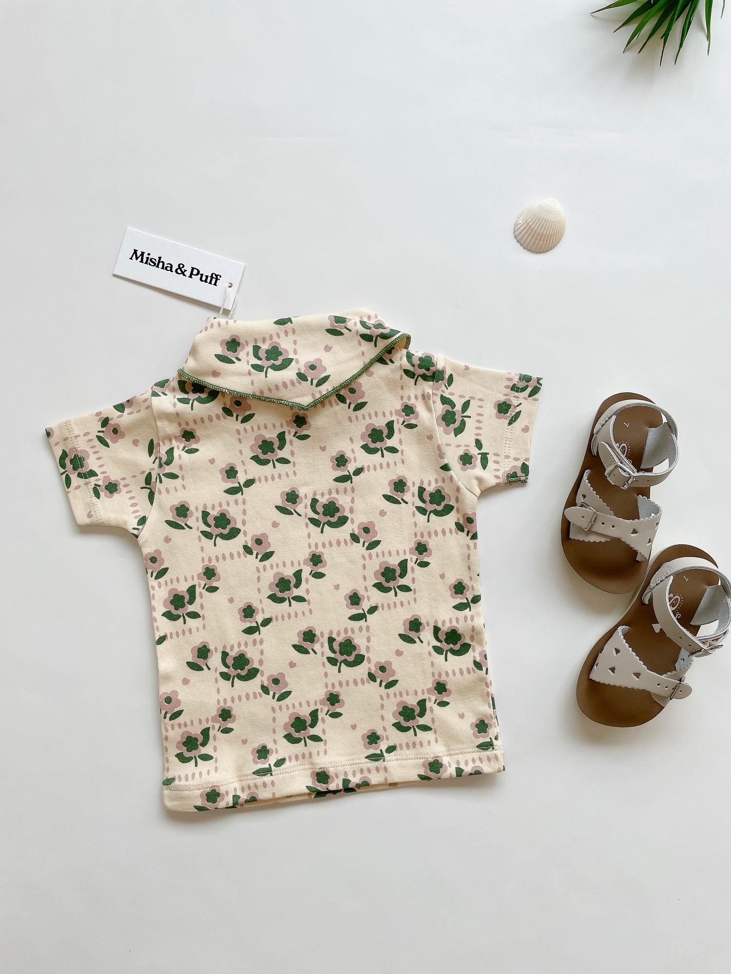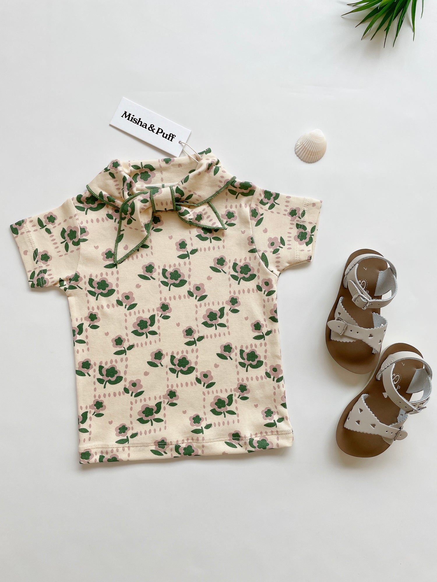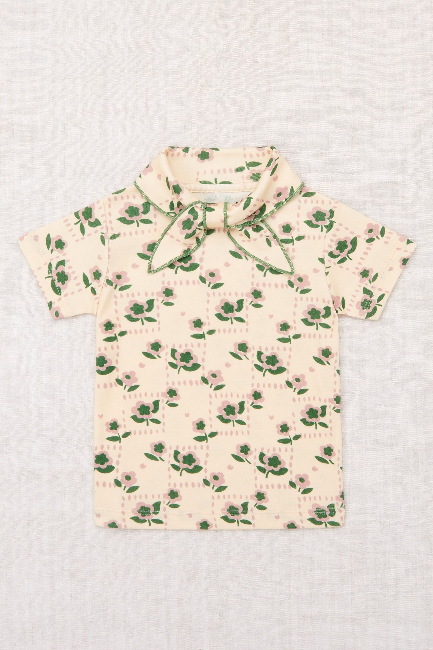 Misha&Puff のシグネチャーであるピマコットンの半袖トップス。プルスルーのスカーフと、柔らかい尖った襟、コントラストのあるメローエッジが付いています。