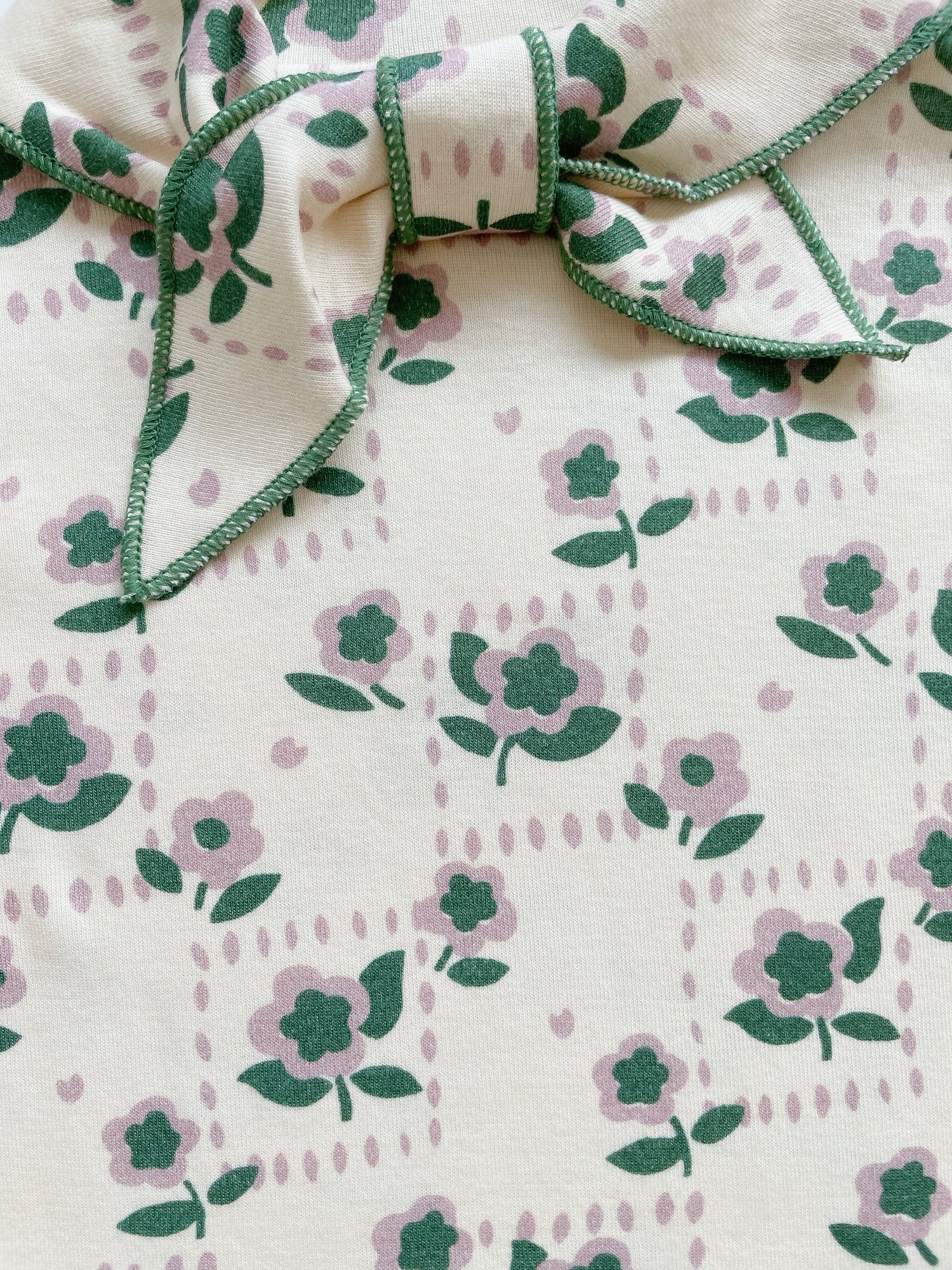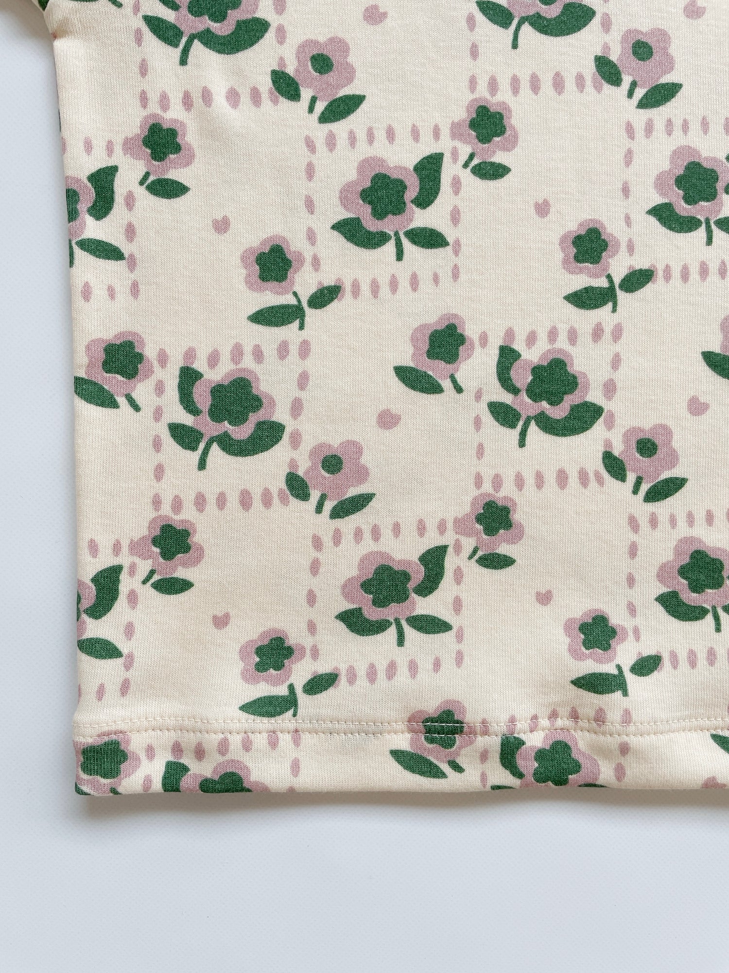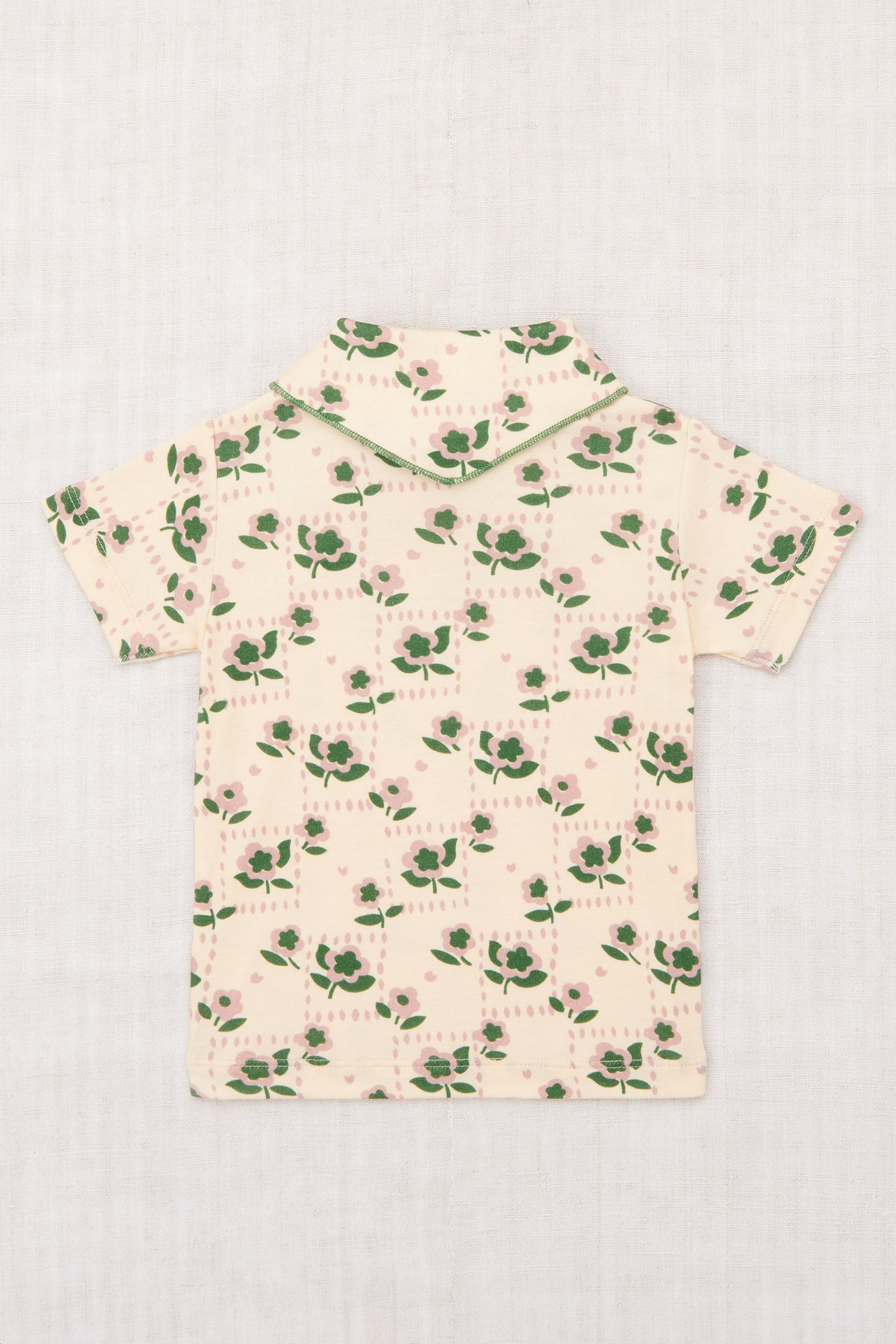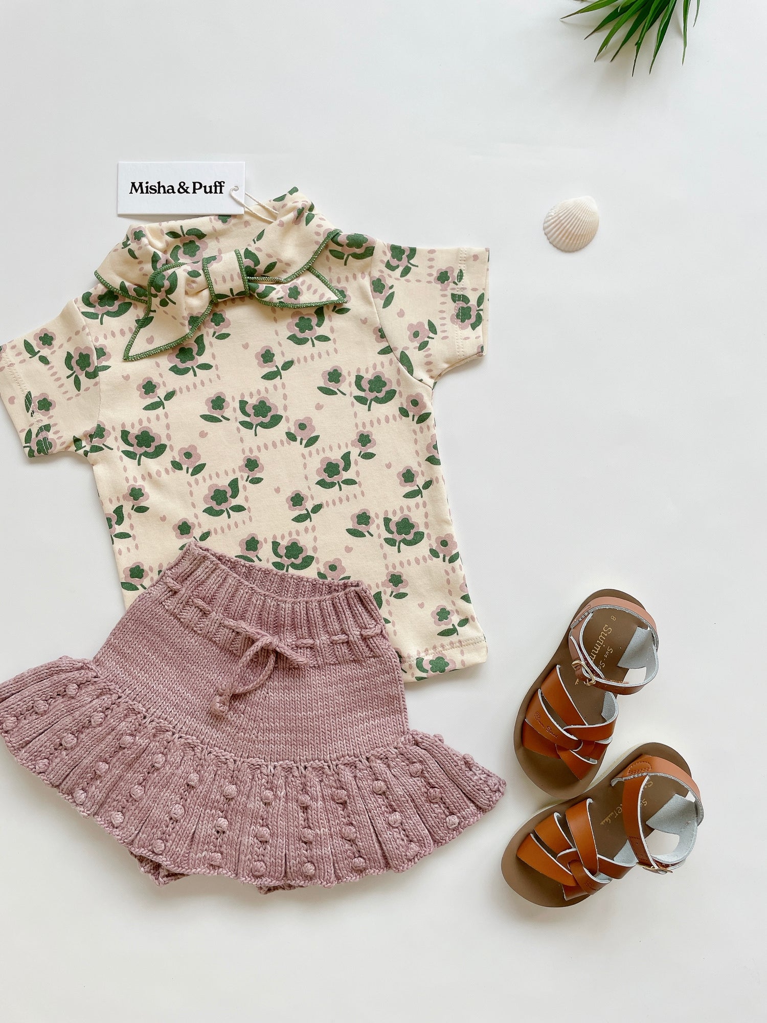 Misha&Puff のシグネチャーであるピマコットンの半袖トップス。プルスルーのスカーフと、柔らかい尖った襟、コントラストのあるメローエッジが付いています。