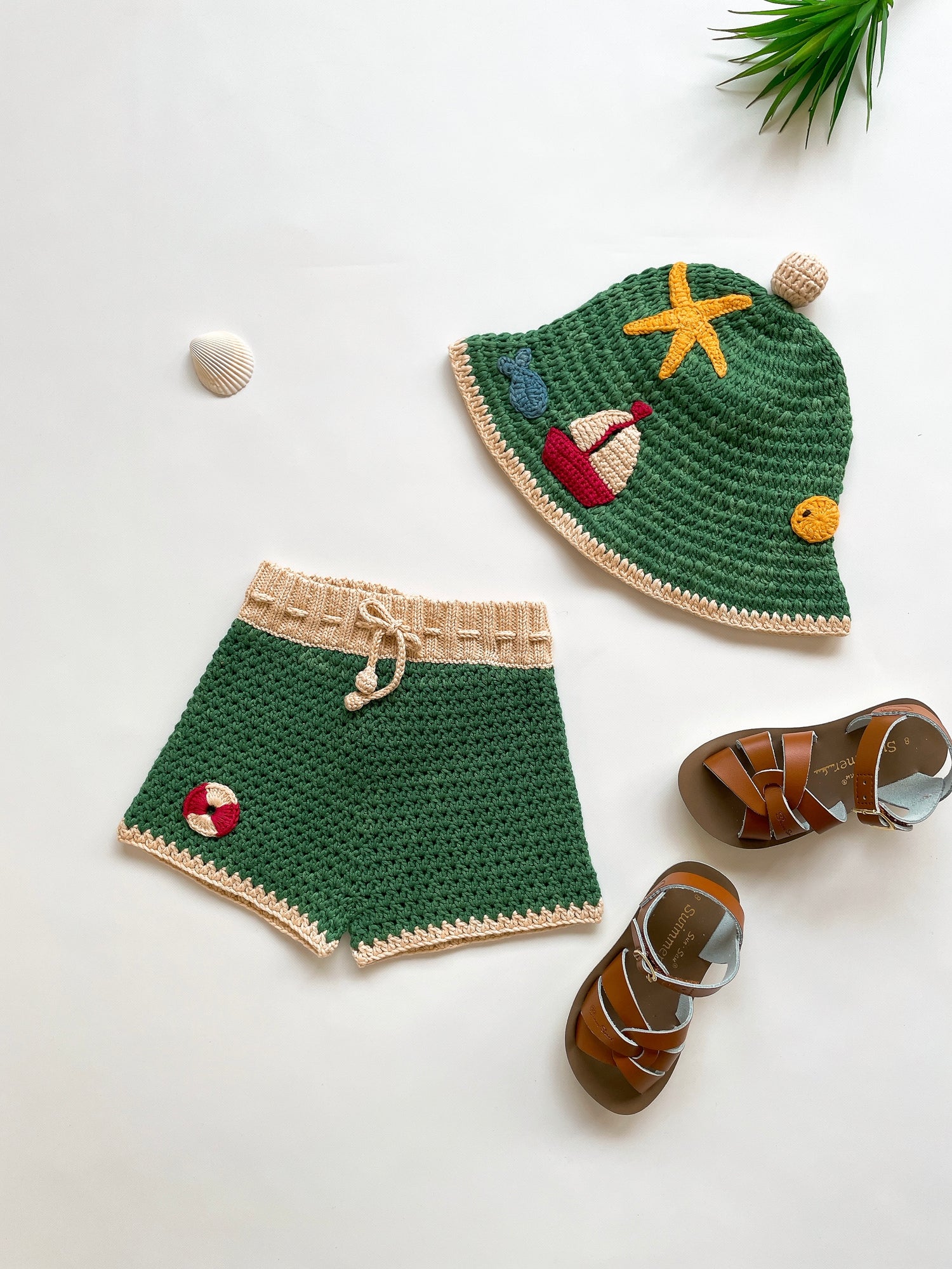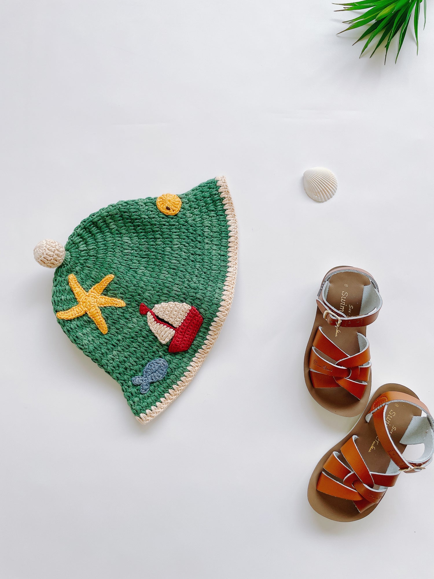 ピマコットンで手編みされたビーチハット。短いつば、コントラストのあるトリム、60 年代風のデザインが特徴で、海辺のグラフィックのアップリケで仕上げられています。