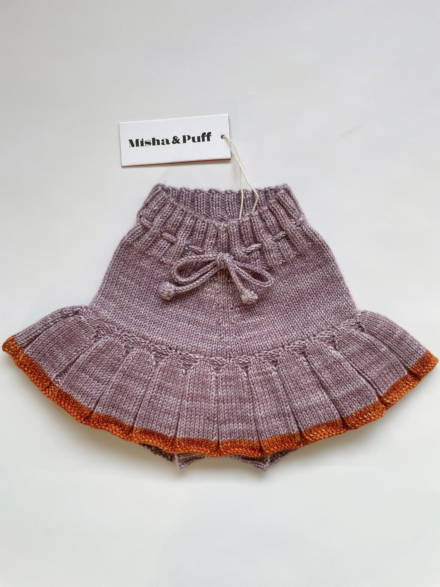 Misha & Puff のシグネチャーである厚手のメリノウールを使用した手編みのスカート。付属のブルマーと、しっかりとフィットするポップコーンタイの引き紐が付いたリブ編みのウエストバンドが特徴です。