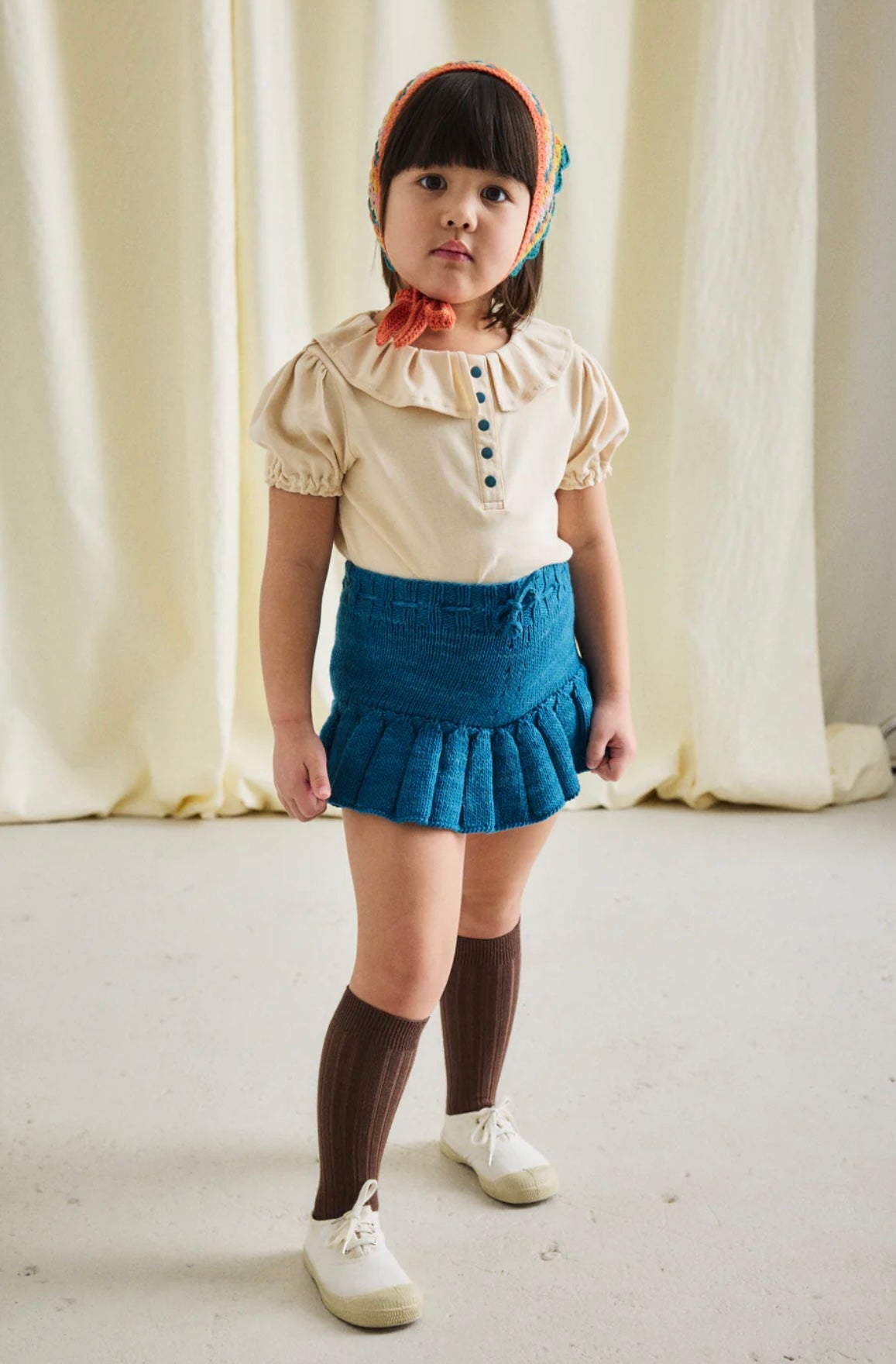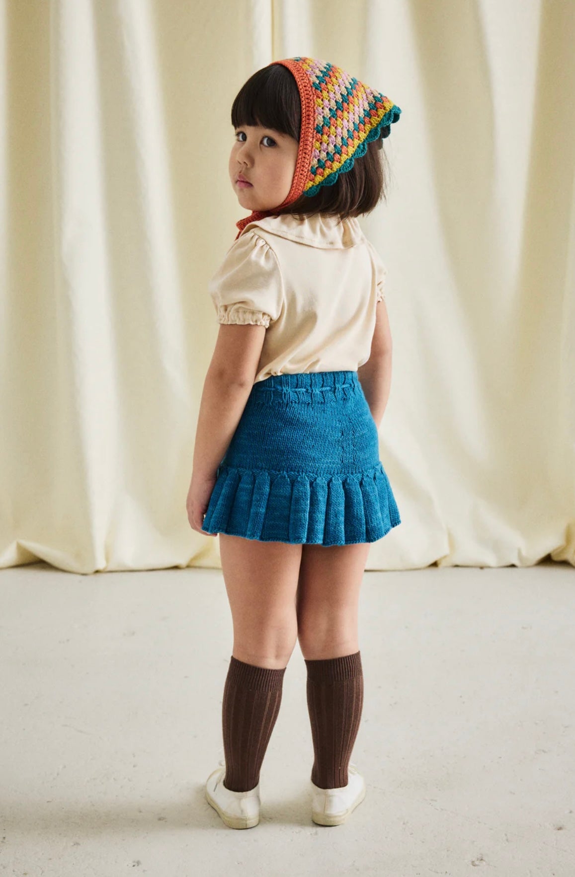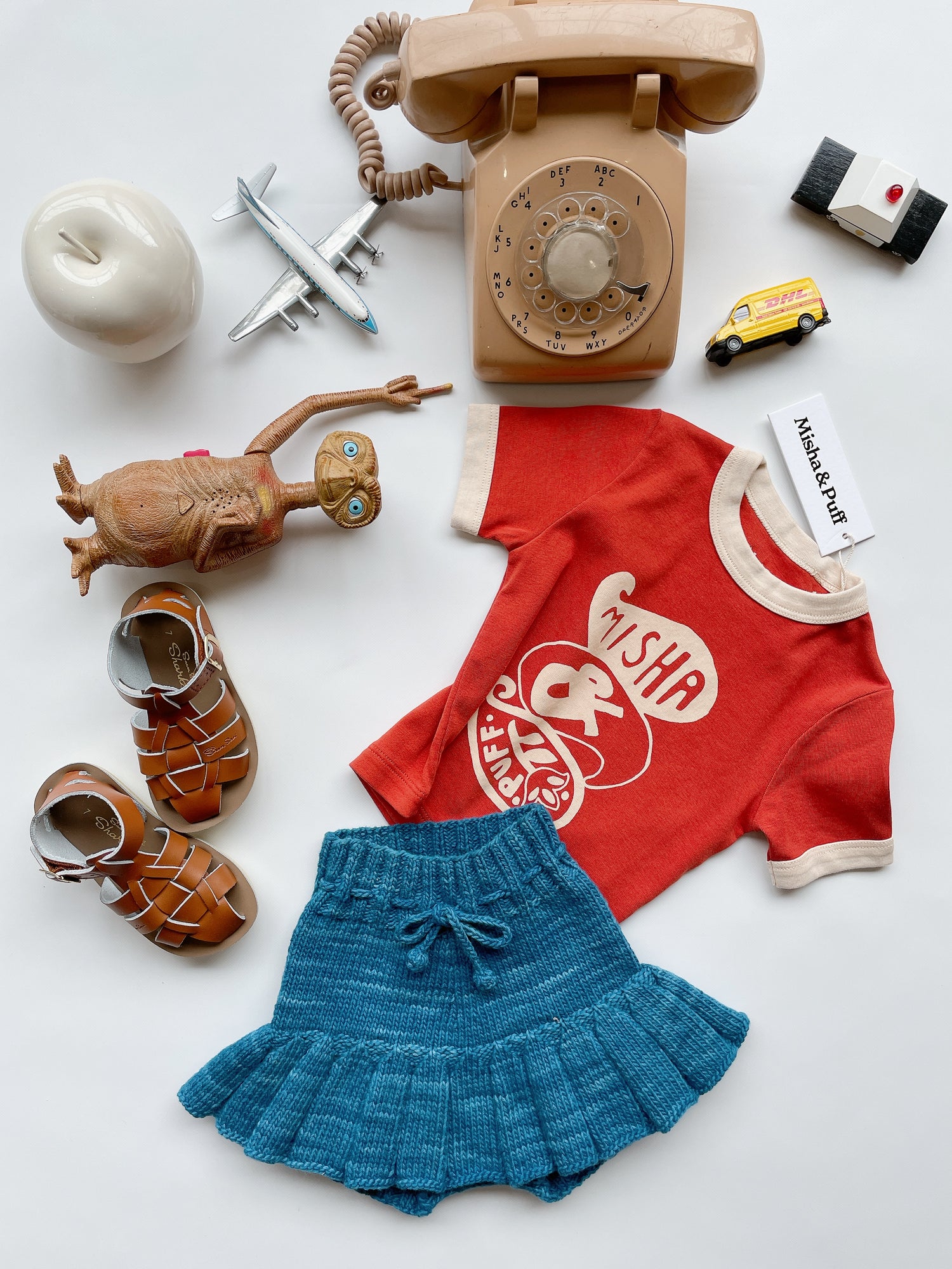 Misha & Puff のシグネチャーである手編みのスカート。付属のブルマーと、しっかりとフィットするポップコーンタイの引き紐が付いたリブ編みのウエストバンドが特徴です。