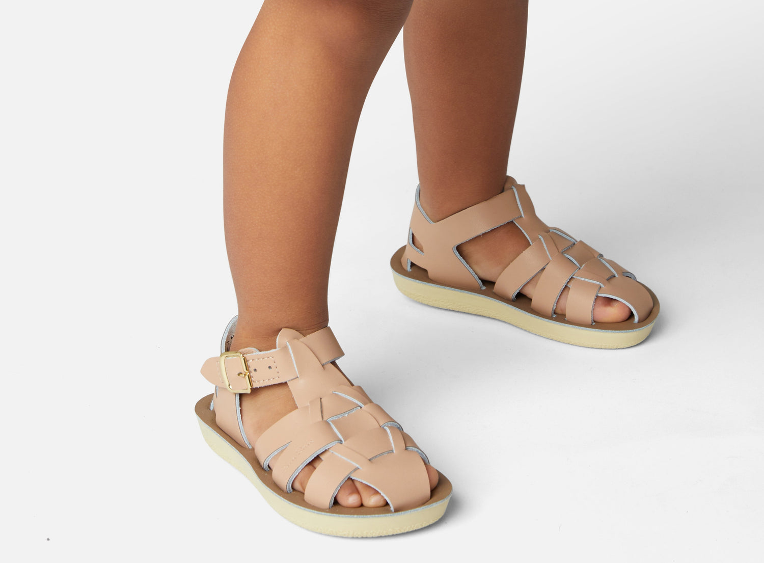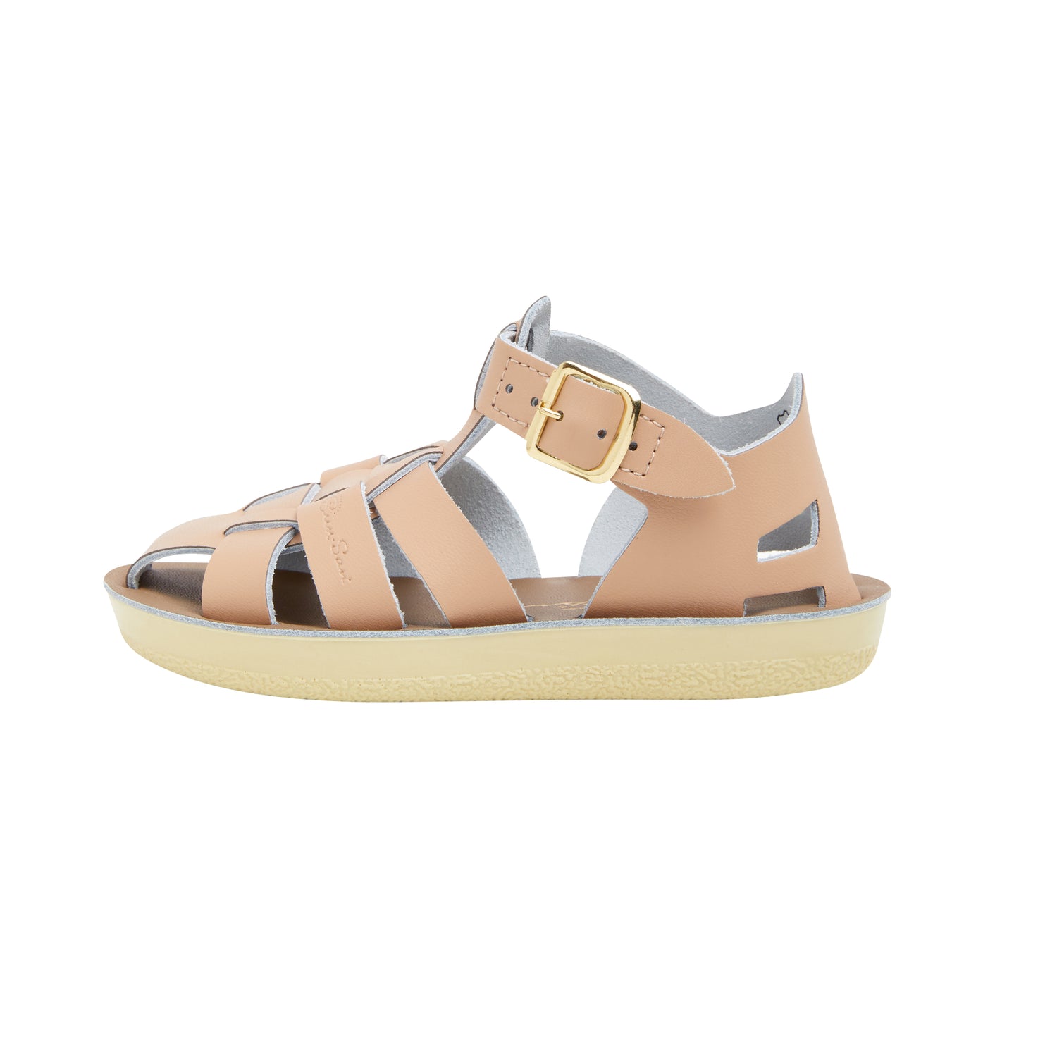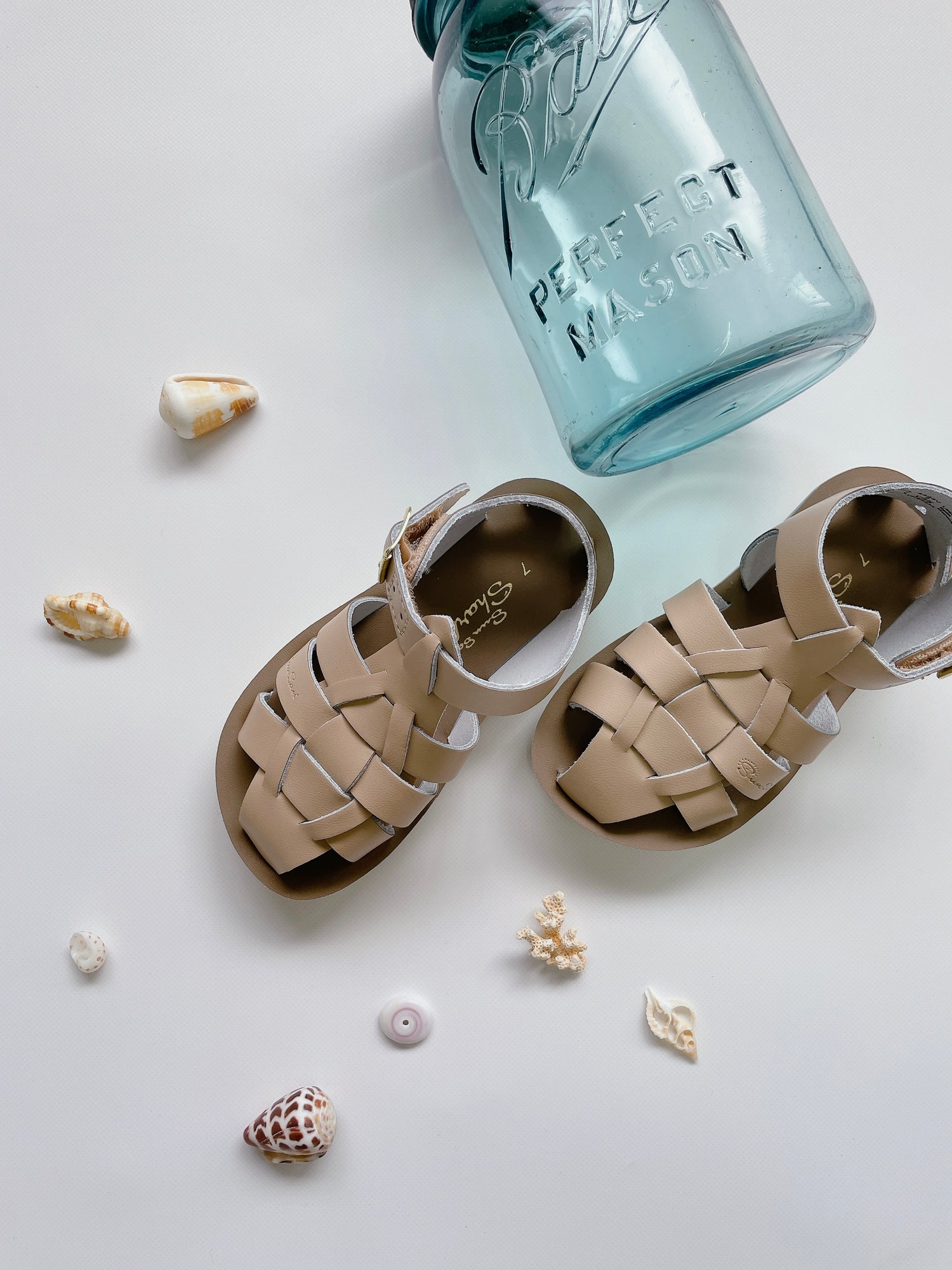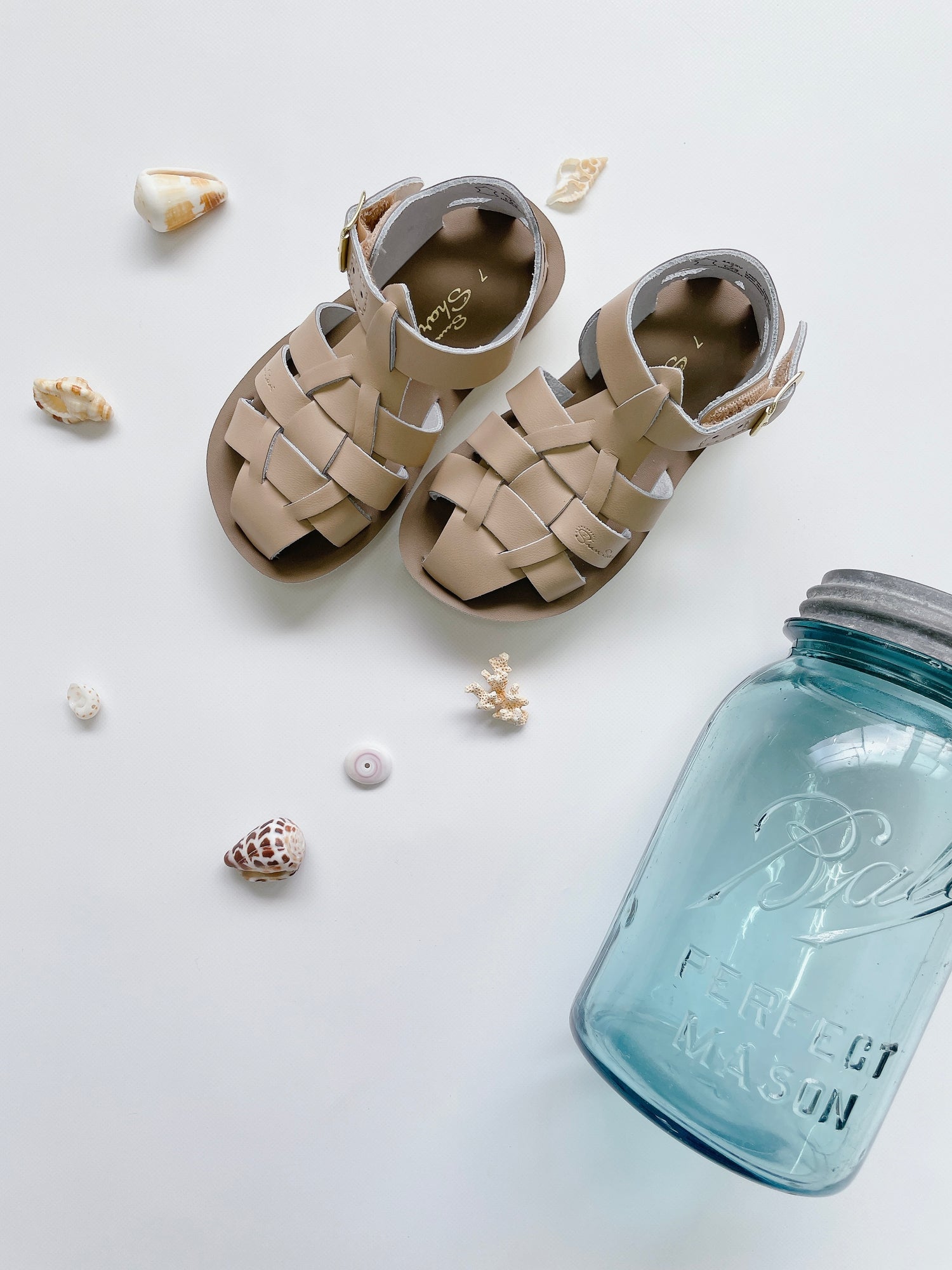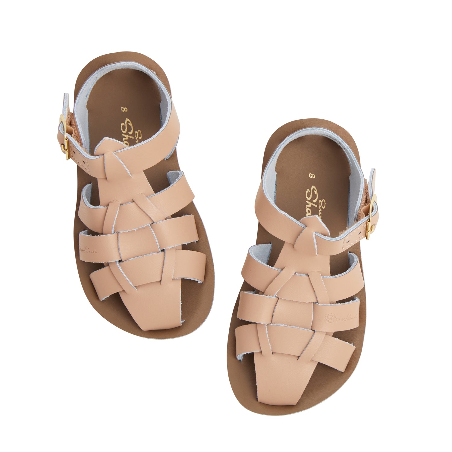 “シャーク”は古くから愛されてきたフィッシャーマンスタイルのサンダル。つま先やかかとを半分覆う形のしっかりした編み込みレザーで、サッカーやキックスケーターなどで遊ぶ時にも安心です。“サンサン”ラインのサンダルは、全てクッション性抜群のウレタンソールとさび止め加工済みのバックルを採用。冷水であれば洗濯機で水洗いもOK。