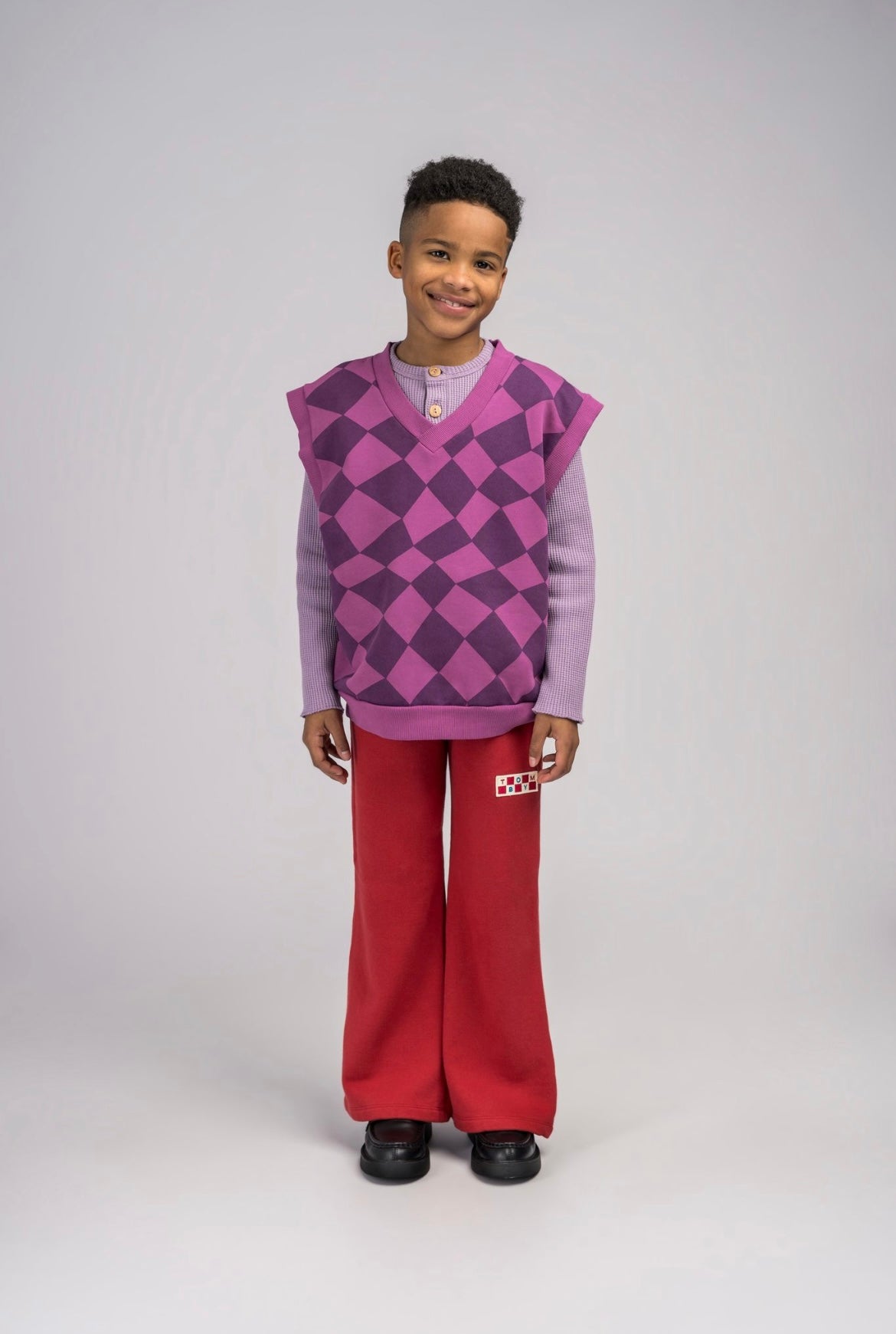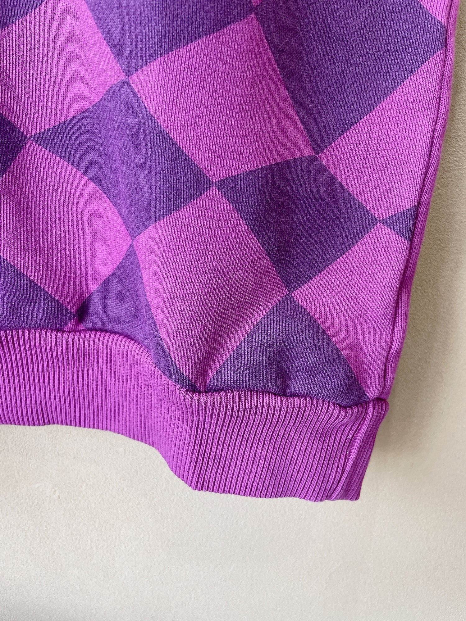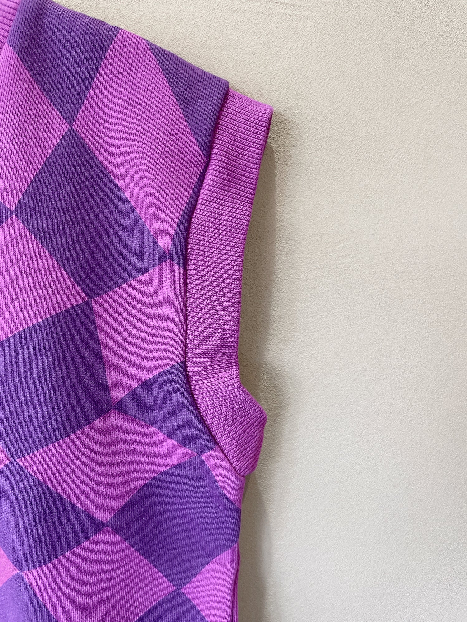 スウェット素材のベスト。オーバーサイズのデザインで不揃いなチェッカーボード柄。Lookみたいに大き目に着用するとgood。