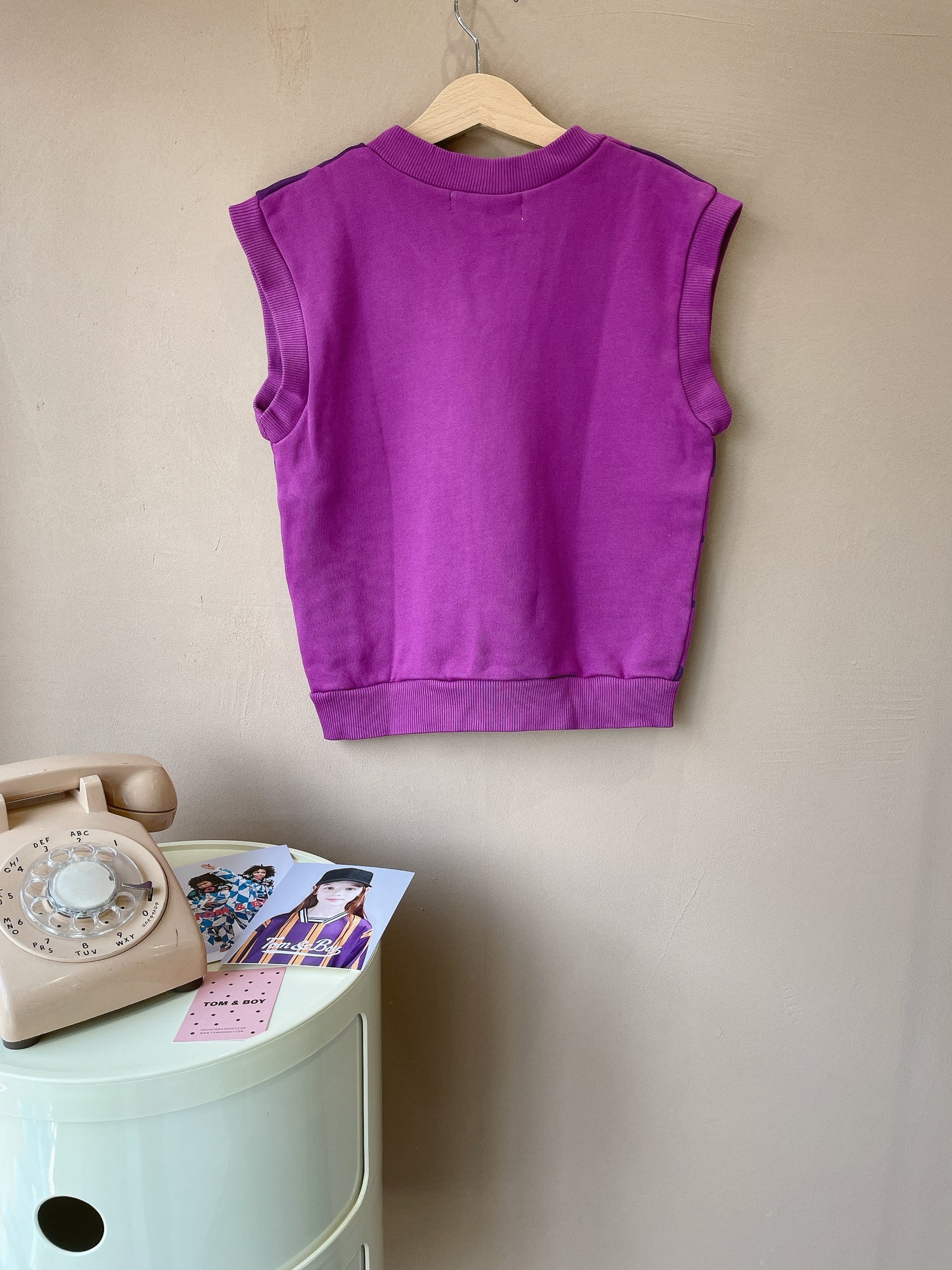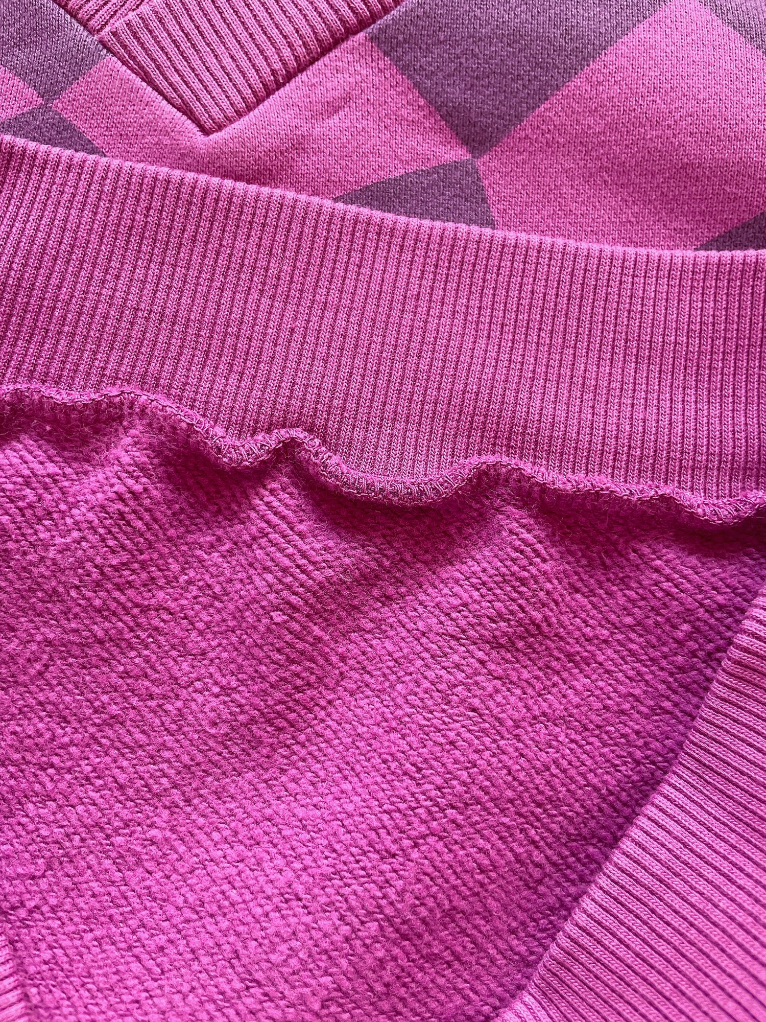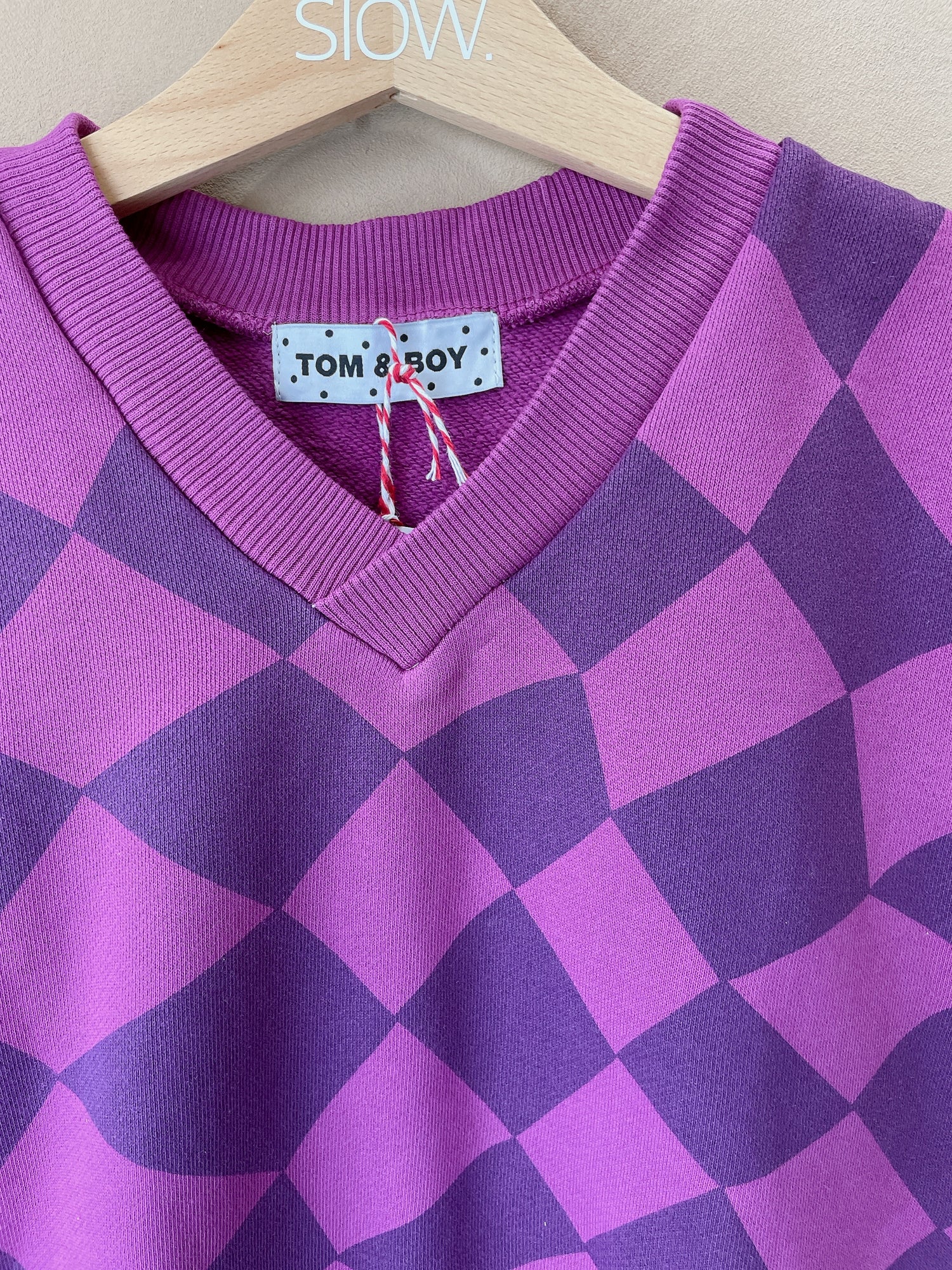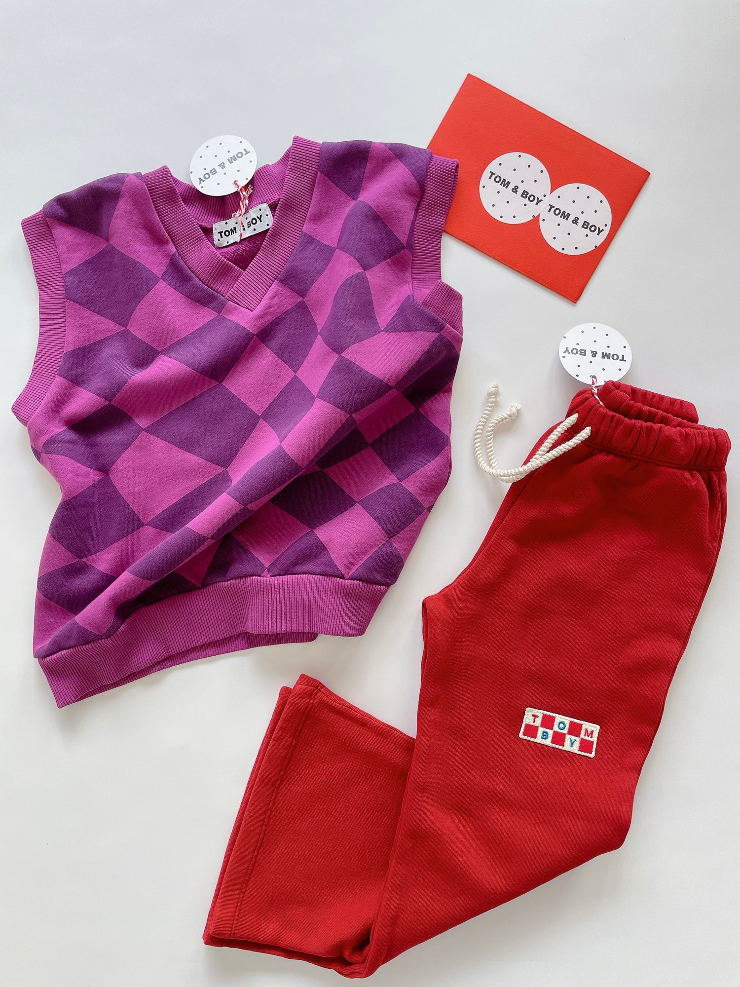 スウェット素材のベスト。オーバーサイズのデザインで不揃いなチェッカーボード柄。Lookみたいに大き目に着用するとgood。
