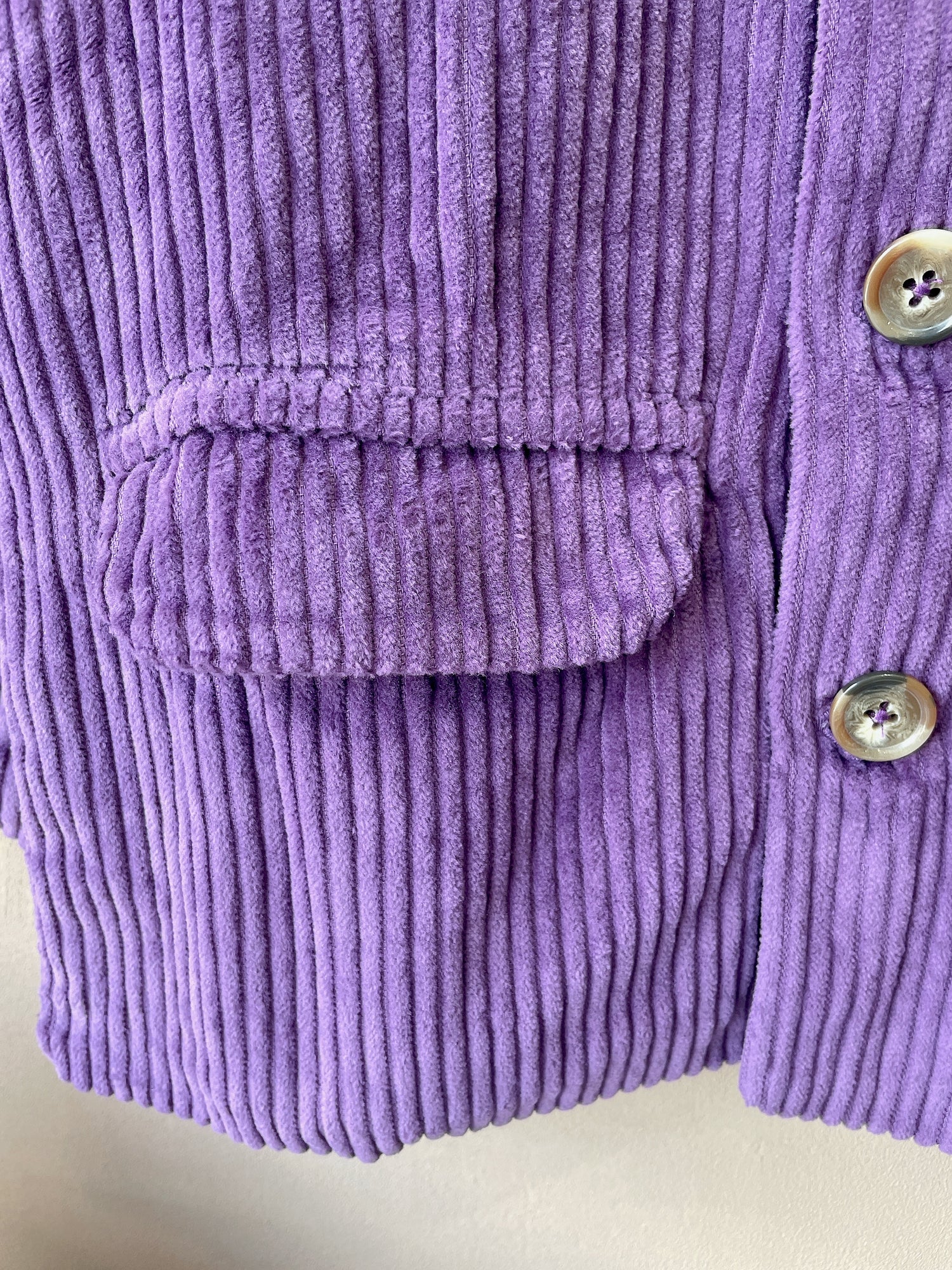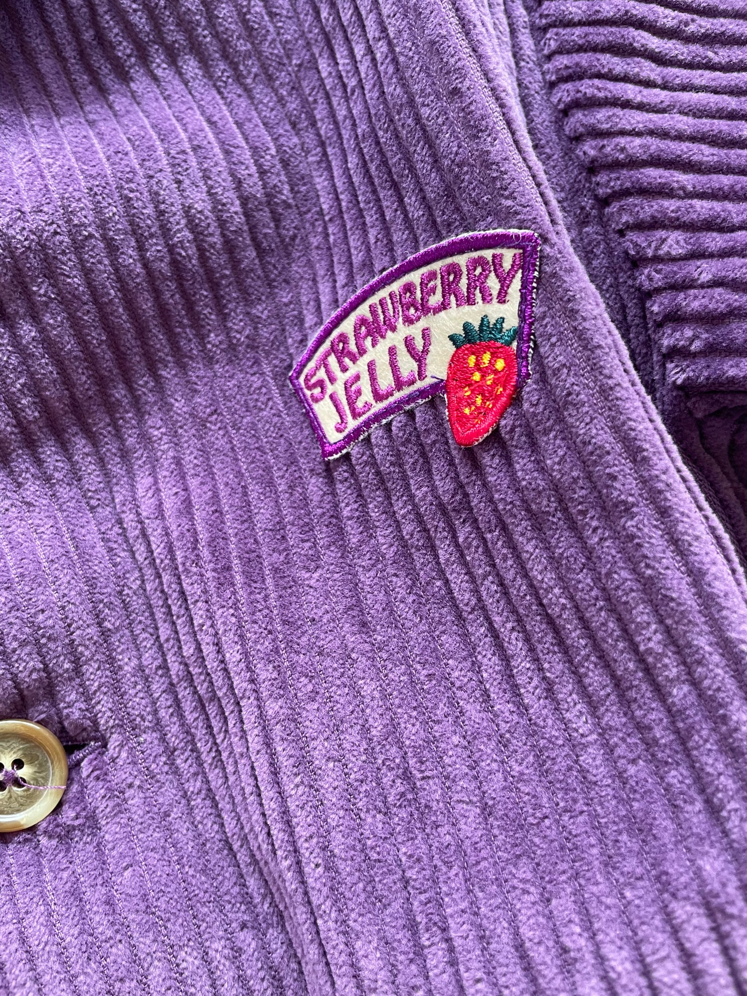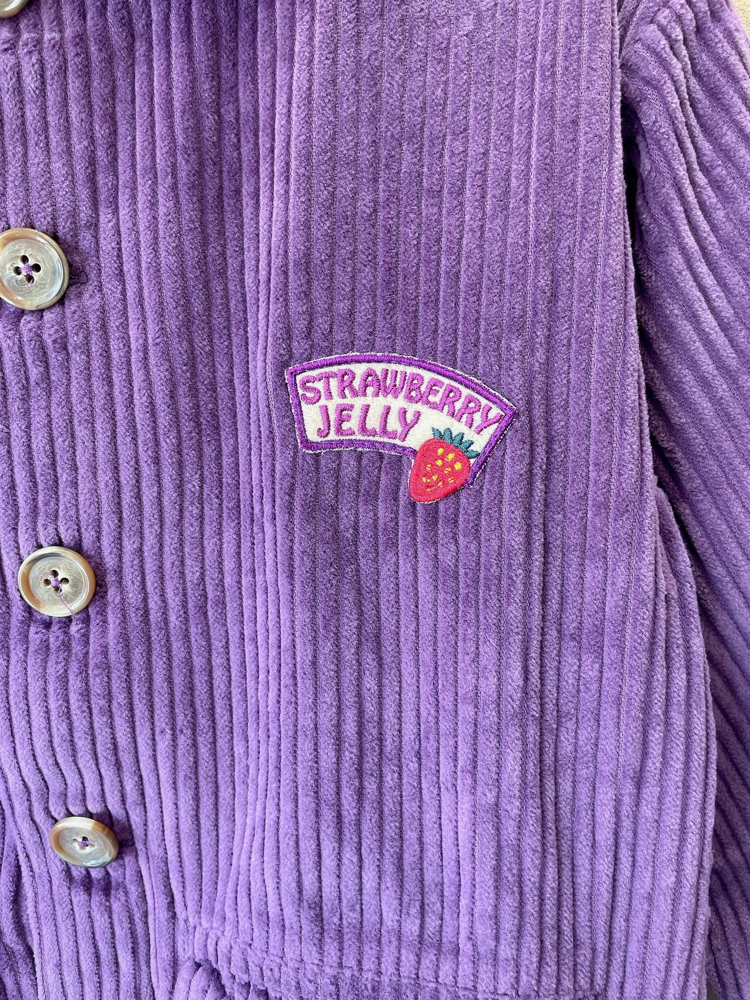 StrawberryJellyのパッチがさりげないコーデュロイジャケット。裏地がついているので長い季節で着用できる。